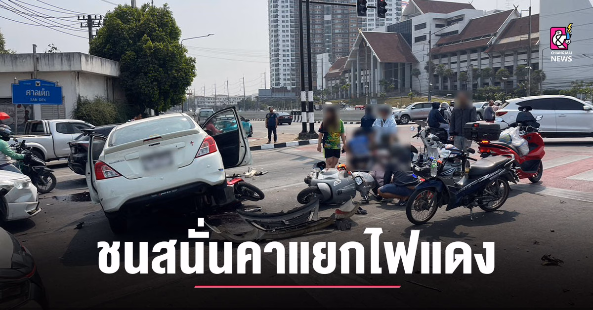 ชนสนั่นคาแยกไฟแดง เก๋งพุ่งข้ามเลนถนน ชนรถ จยย.ขณะติดไฟแดง เจ็บระนาว 5 ราย เจ้าหน้าที่เร่งเคลียร์เหตุ ทำรถติดยาวเกือบชั่วโมง เมื่อเวลาประมาณ 13.20 น. วันนี้ (4 มี.ค.69) เจ้าหน้าที่กูภัย พร้อมด้วยเจ้าหน้าที่ตำรวจ เร่งเข้าช่วยเหลือผู้บาดเจ็บและเคลียร์เส้นทางบนถนนบริเวณกลางสี่แยกศาลเด็ก ต.วัดเกต อ.เมืองเชียงใหม่ ภายหลังจากที่เกิดอุบัติเหตุรถชนและมีคนได้รับบาดเจ็บหลายราย โดยในที่เกิดเหตุพบรถยนต์เก๋งนิสสันอัลเมร่า สีขาว หมายเลขทะเบียน งต XXXX เชียงใหม่ สภาพรถพุ่งข้ามเล่นถนนชนกับรถจักรยานยนต์อีก 2 คัน ด้านหน้ารถพังยับ และมีรถจักรยานยนต์สีแดงถูกทับอยู่ใต้ท้องรถ นอกจากนี้มีรถจักรยานยนต์เวสป้า สีเทา อีก 1 คันถูกเฉี่ยวชนล้มอยู่ที่เกิดเหตุ โดยคนขับรถยนต์เก๋งที่พุ่งข้ามเลนมาเป็นชายอายุประมาณไม่เกิน 40 ปี และหญิงสาวอายุไล่ๆ กันอีก 1 คน นอกจากนี้มีรายงานผู้ได้รับบาดเจ็บรวมทั้งสิ้น 5 ราย (รวมคนขับรถยนต์เก๋งคันดังกล่าว) ที่ทั้งหมดได้รับบาดเจ็บเล็กน้อย มีบาดแผลถลอกตามร่างกายและมี 1 รายบาดเจ็บที่บริเวณขา ทางเจ้าหน้าที่กู้ภัยได้ทำการช่วยเหลือปฐมพยาบาลและลำเลียงคนเจ็บส่งโรงพยาบาล ขณะที่บริเวณดังกล่าวเป็นจุดที่มีรถสัญจรไปมาเป็นจำนวนมาก ส่งผลทำให้เกิดรถติดเป็นทางยาวกินเวลานานเกือบร่วมชั่วโมง […]