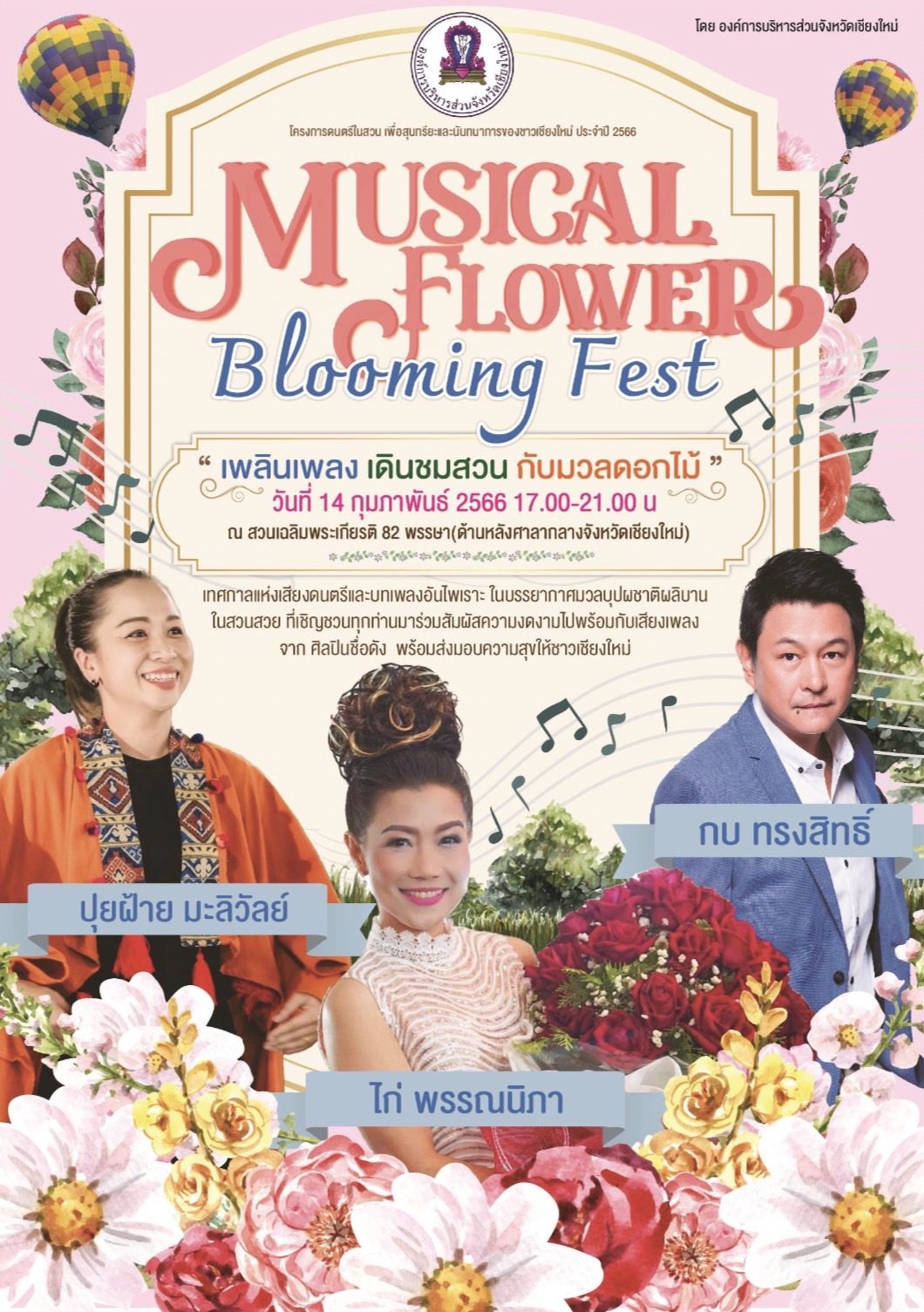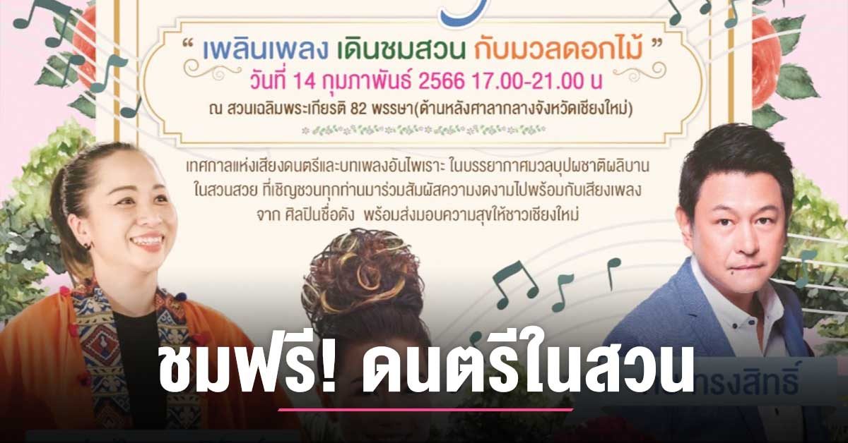 เทศกาลแห่งเสียงดนตรีและบทเพลงอันไพเราะ ในบรรยากาศมวลบุปผชาติผลิบานในสวนสวย ที่เชิญชวนทุกท่านมาร่วมสัมผัสความงดงามไปพร้อมกับเสียงเพลงจาก ศิลปินชื่อดัง พร้อมส่งมอบความสุขให้ชาวเชียงใหม่