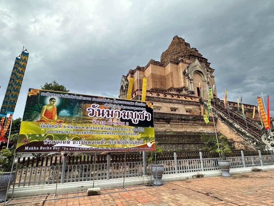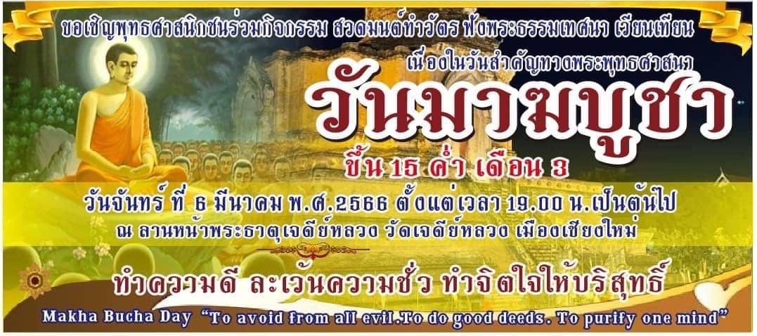 ขอเชิญพุทธศาสนิกชน ร่วมกิจกรรมสวดมนต์ทำวัตร ฟังพระธรรมเทศนา เวียนเทียน เนื่องในวันมาฆบูชา ขึ้น 15 ค่ำ เดือน 3 ในวันจันทร์ที่ 6 มีนาคม 2566 ตั้งแต่เวลา 19.00 น.เป็นต้นไป ณ ลานหน้าพระธาตุเจดีย์หลวง วัดเจดีย์หลวง อ.เมือง จ.เชียงใหม่ ทำความดี ละเว้นความชั่ว ทำจิตใจให้บริสุทธิ์