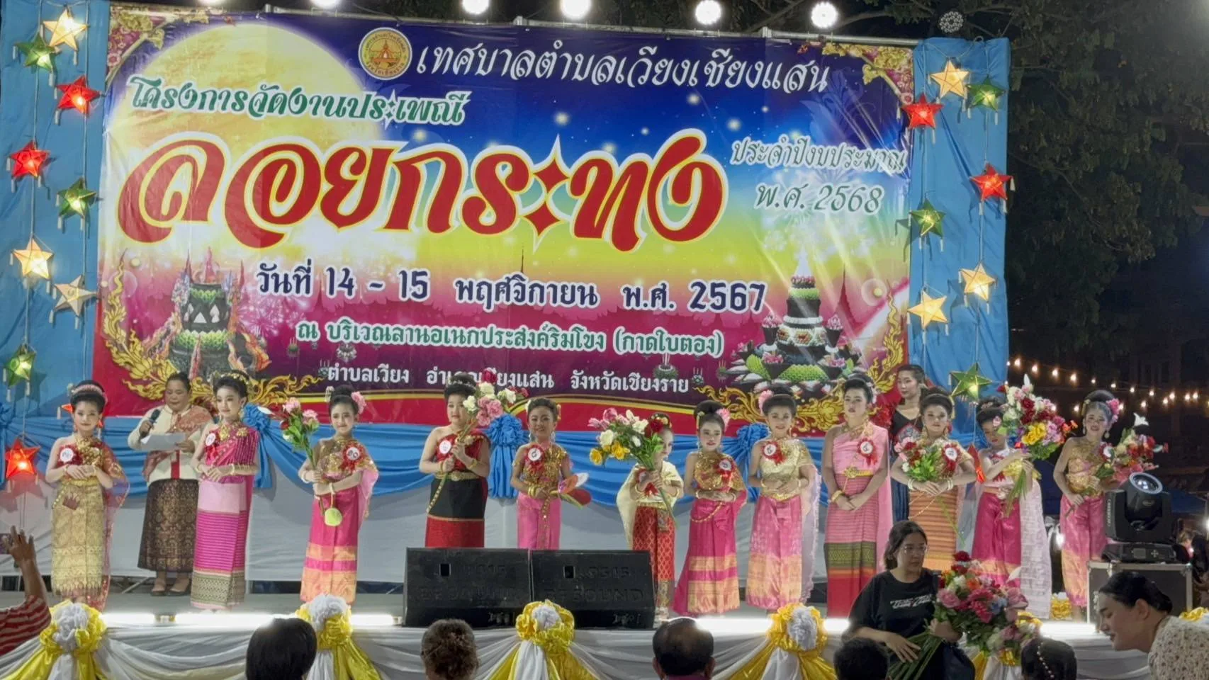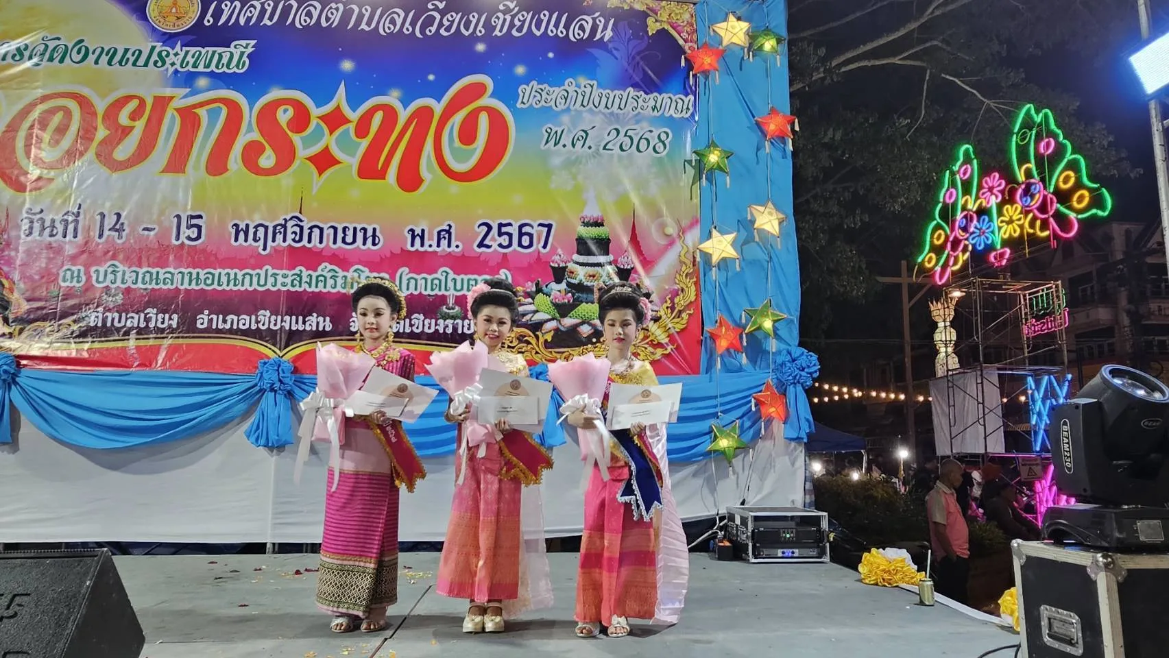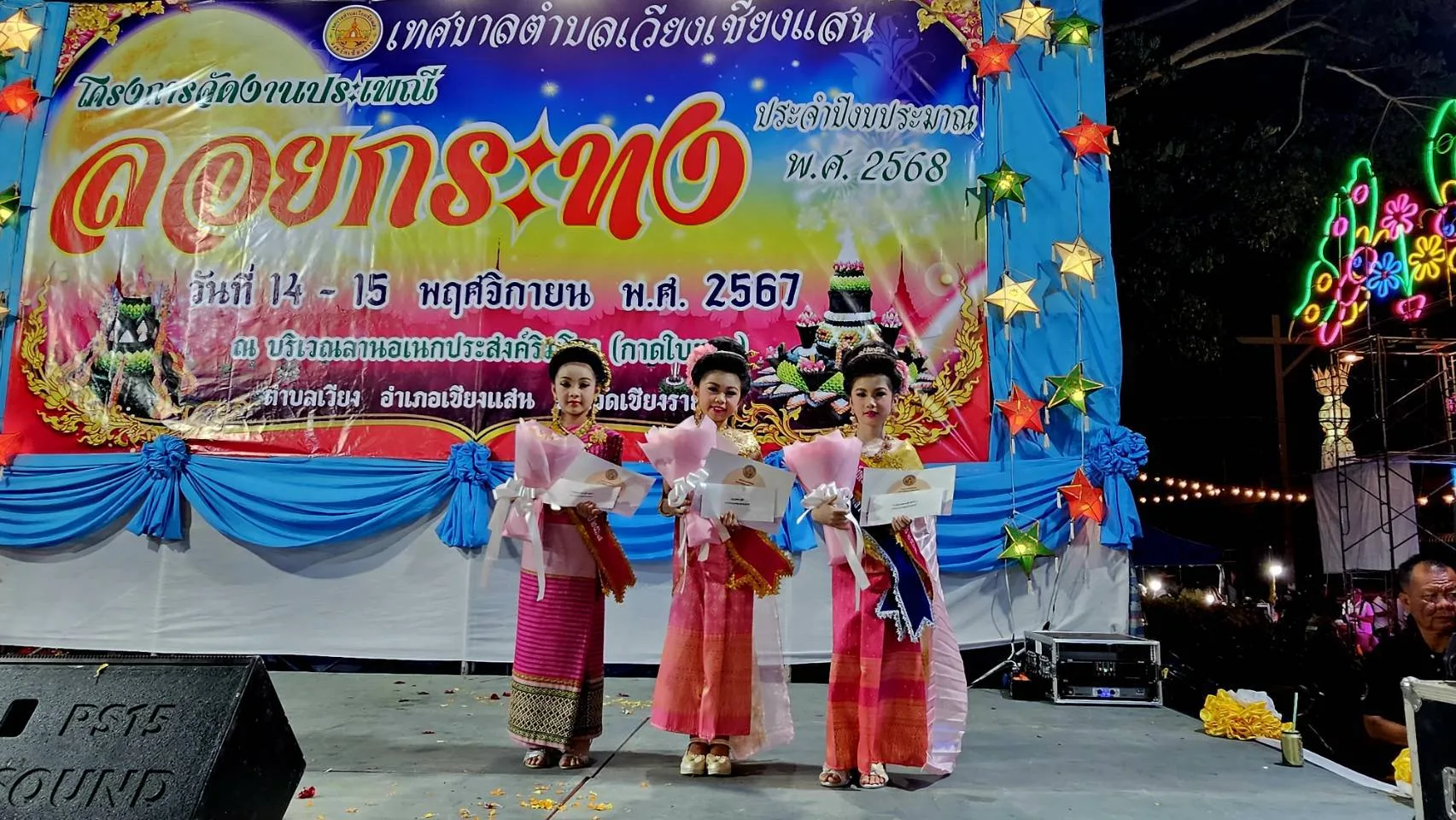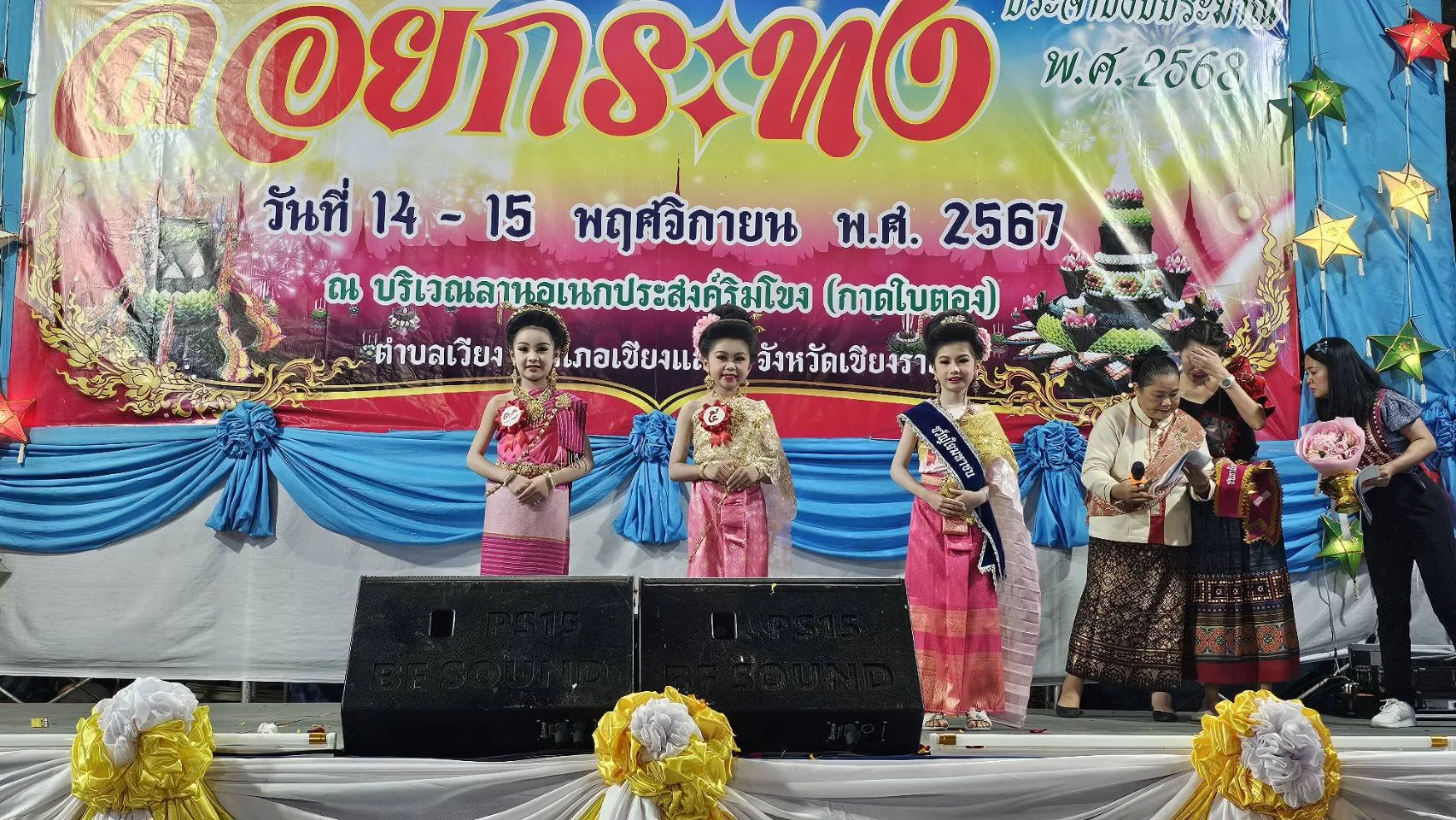 อีก 1 ไฮไลท์หนึ่งของงานลอยกระทง หนีไม่พ้นการประกวดประชันความงาม งานลอยกระทงริมแม่น้ำโขงที่อำเภอเชียงแสนปีนี้ นางเกศสุดา สังขกร นายกเทศมนตรีตำบลเวียง อ.เชียงแสน ได้จัดให้มีการประกวดหนูน้อยนพมาศขึ้น ท่ามกลางนักท่องเที่ยวมาเชียร์กันอย่างคึกคัก มีบรรดาน้องหนูตัวน้อยๆ พากันแต่งกายกันด้วยชุดไทย เพื่อเข้าร่วมประกวดนางนพมาศน้อย นอกจากความน่ารักและความสวยงามแล้วแต่ละคนก็พกความมั่นใจมากันเต็มเปี่ยม ต้องบอกเลยว่าสร้างความหนักใจให้กับคณะกรรมการผู้ตัดสินเป็นอย่างยิ่ง ผลปรากฏว่า ด.ญ.ชวินรดา ใจสบาย หรือน้องข้าวตัง อายุ 9 ปี โรงเรียนเชียงแสน อคาเดมี ได้รับตำแหน่งหนูน้อยนพมาศ และ ด.ญ.ริณา รัศมีจันทร์ หรือน้องริณา ได้รับตำแหน่งขวัญใจมหาชน