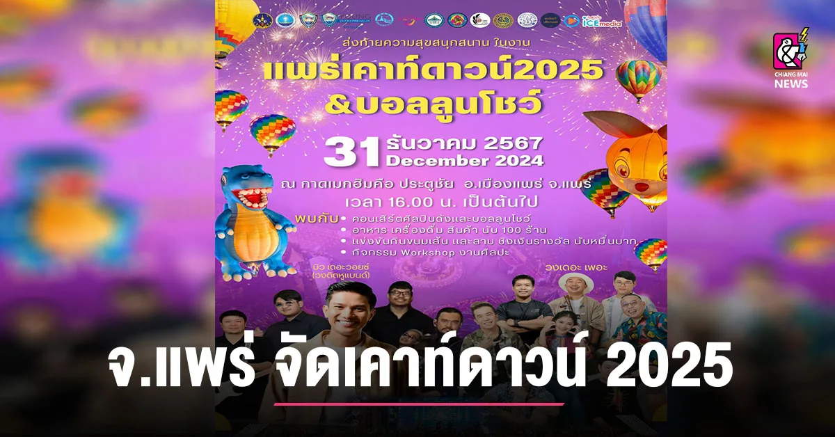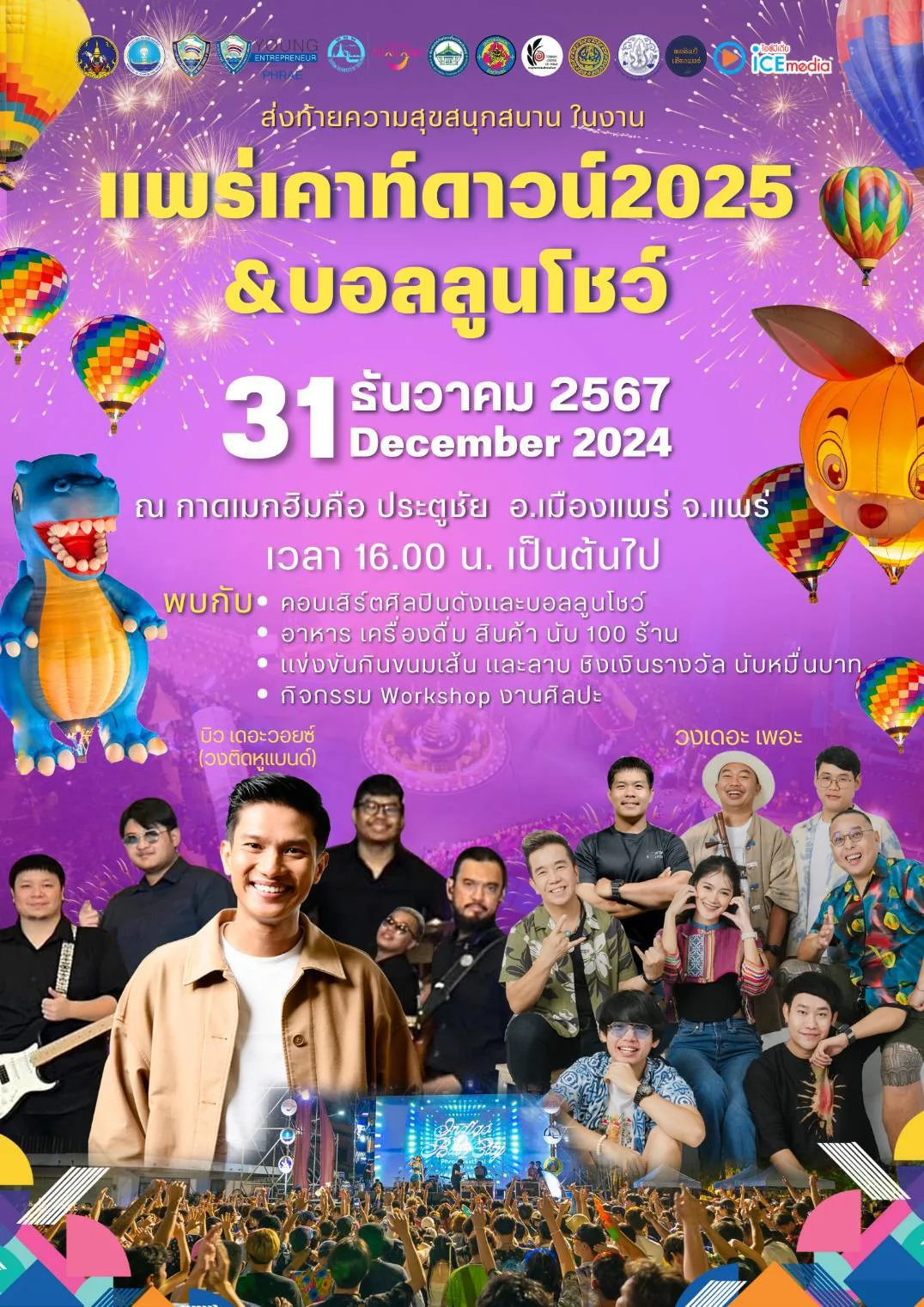 ผู้สื่อข่าวรายงานว่า จ.แพร่ จัดกิจกรรมส่งท้ายปีเก่า 2567 และต้อนรับปีใหม่ 2568 วันที่ 31ธค. ชมบอลลูนโชว์ และ คอนเสิร์ตจาก วงพาสต้า วงเดอะเพอะ วงติดหูแบนด์ บิว The Voice ชิม ช็อบอาหาร เครื่องดื่มนับ100ร้าน