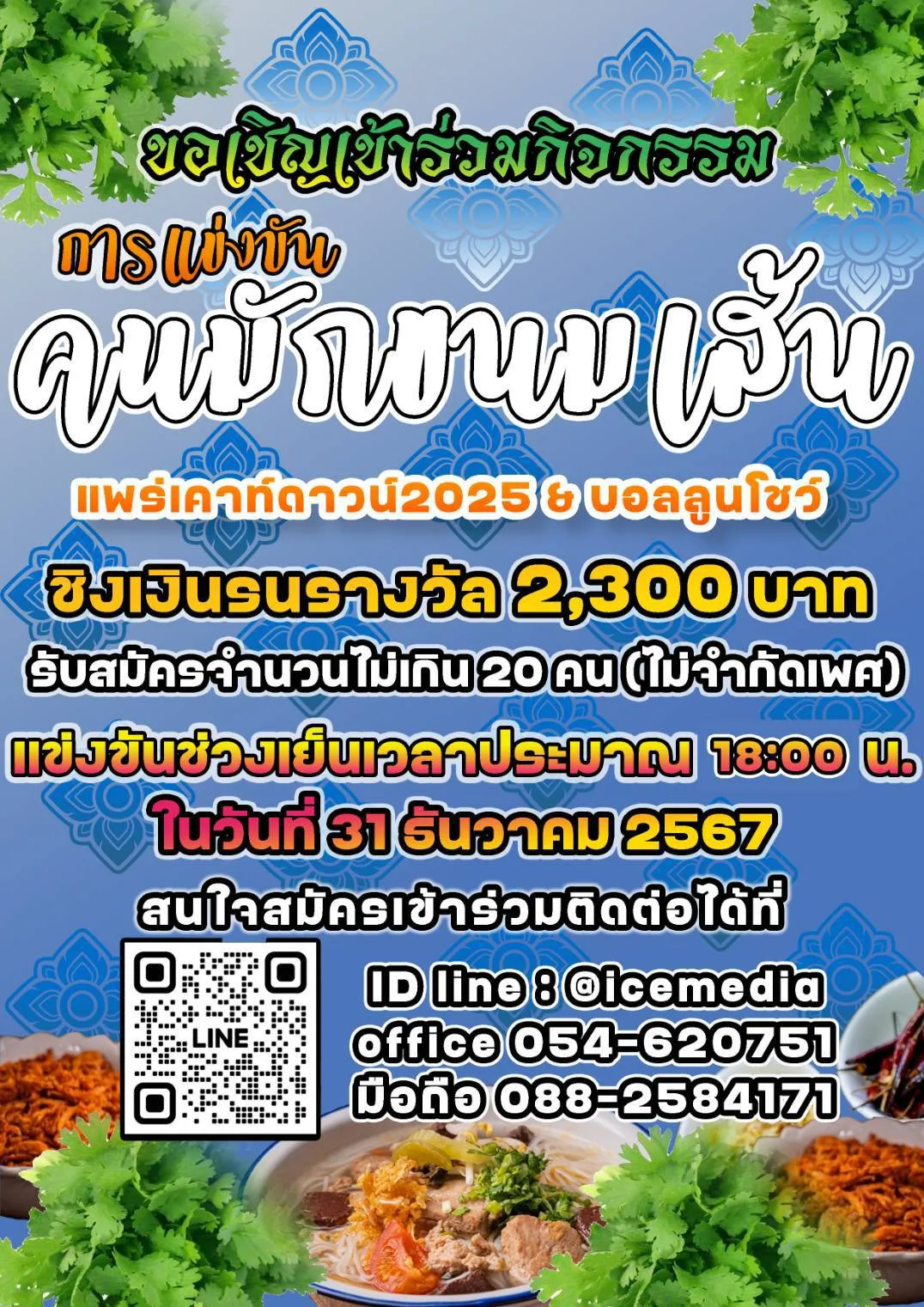 เทศบาลเมืองแพร่กำหนดจัด “กิจกรรมยามแลง ผ่อเวียง เคียงเมก” ระหว่างวันที่ 29-31 ธันวาคม 2567 โดยให้บริการนั่งรถรางฟรีสำหรับนักท่องเที่ยวนั่งรถรางชมบรรยากาศยามค่ำคืนบริเวณเขตกำแพงเมือง แสง สีสัน ของ phrae light-up วันละ 3 รอบ ดังนี้ รอบแรก เวลา 17.00 น. รอบสอง เวลา 18.00 น. รอบสามเวลา 19.00 น. รับสมัครแล้วเน้อ แข่งขันการกินขนมเส้น วันที่ 31 ธันวาคม 2567 นี้ มาม่วน มากิ๋นลำๆ ด้วยกันนะครับ หลักเกณฑ์การแข่งขันคนมักกิ๋น (แข่งกินขนมเส้นน้ำใส ) ในงาน แพร่ CountDown 2025 & บอลลูนโชว์”
