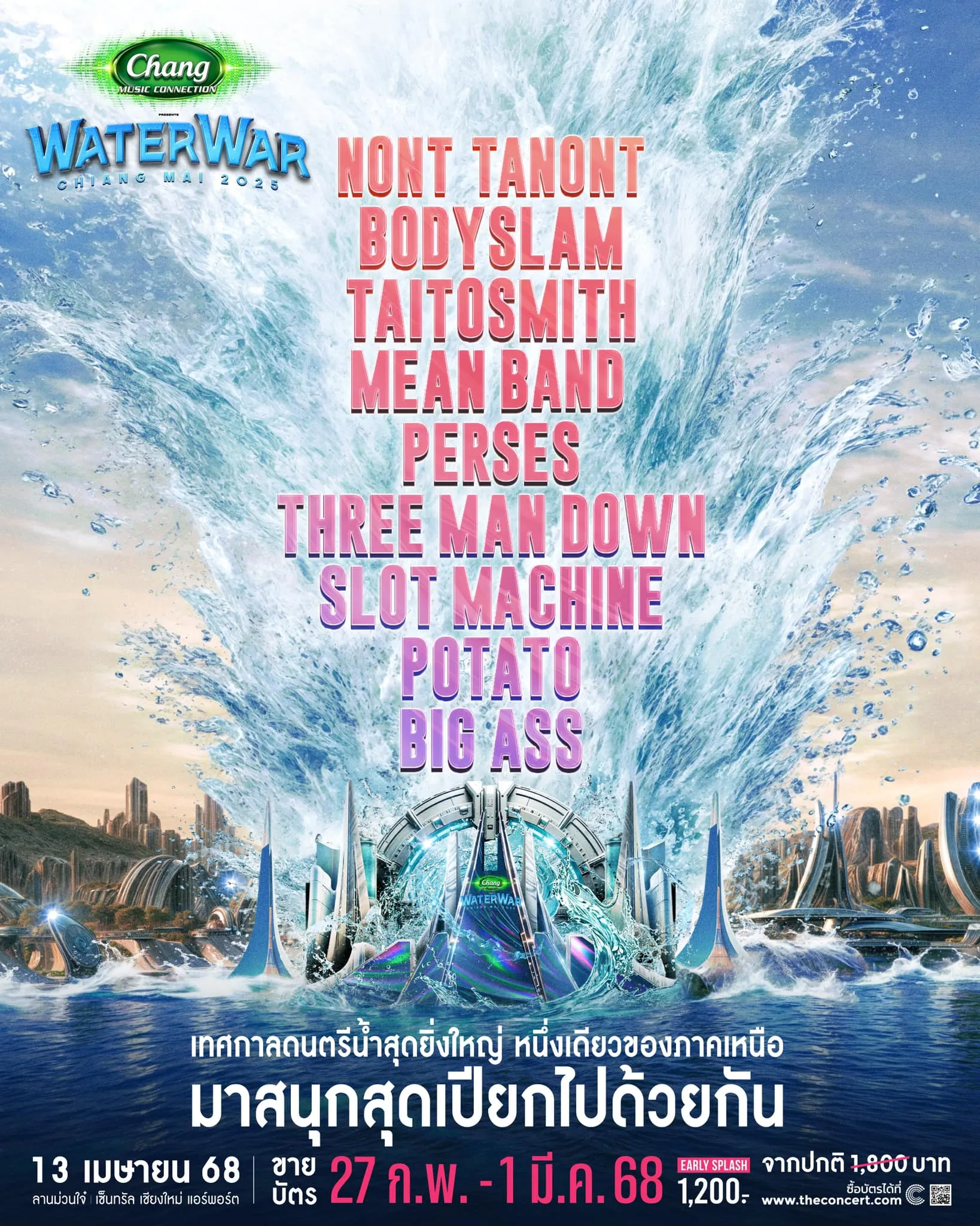 เตรียมกลับมาสาดความมันอีกครั้ง กับงาน Chang Music Connection Presents ‘WATER WAR CHIANG MAI 2025’ (ช้าง มิวสิค คอนเนคชั่น พรีเซนต์ วอเตอร์วอร์ เชียงใหม่ 2025) เทศกาลดนตรีน้ำสุดยิ่งใหญ่ หนึ่งเดียวของภาคเหนือ โดยทีมผู้จัดงานมืออาชีพ ‘IDEA FACT’ (ไอเดียแฟค) หน่วยงานภายใต้ ‘GMM SHOW’ (จีเอ็มเอ็ม โชว์) ที่จะระเบิดความสนุกแบบเต็มพิกัด จัดเต็มด้วยโปรดักชั่นสุดอลังการ พร้อมสาดความเปียกชุ่มฉ่ำด้วยวอเตอร์เอฟเฟ็กต์สุดยิ่งใหญ่ ในวันอาทิตย์ที่ 13 เมษายน 2568 ณ ลานม่วนใจ๋ ศูนย์การค้าเซ็นทรัล เชียงใหม่ แอร์พอร์ต และอัดแน่นด้วยศิลปินเบอร์ใหญ่ที่ดีที่สุด เยอะที่สุดในวันเดียว เพราะไลน์อัพศิลปินที่ประกาศออกมานั้นเดือดไม่ใช่เล่น! นำทีมโดย BODYSLAM (บอดี้สแลม) • BIG ASS (บิ๊กแอส) • POTATO (โปเตโต้) • NONT TANONT (นนท์ ธนนท์) • MEAN BAND (มีน แบนด์) • PERSES (เพอร์เซส) • TAITOSMITH (ไททศมิตร) • SLOT MACHINE (สล็อตแมชชีน) • THREE MAN DOWN (ทรีแมนดาวน์)