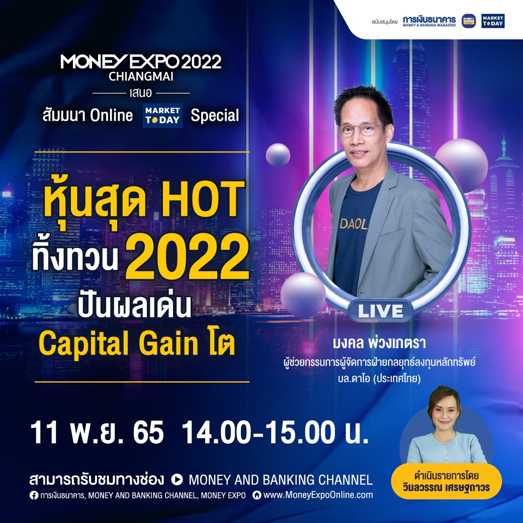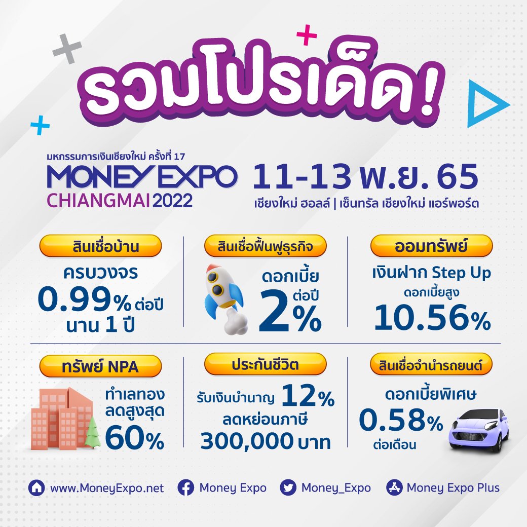 มหกรรมการเงินเชียงใหม่ ครั้งที่ 17 Money Expo Chiangmai 2022 ยกขบวนโปรโมชั่นแรงส่งท้ายปี สู่ชาวเชียงใหม่และชาวภาคเหนือ เงินฝาก Step Up 10.56% สินเชื่อบ้านดอกเบี้ยพิเศษ 0.99% นาน 1 ปี สินเชื่อฟื้นฟูธุรกิจดอกเบี้ย 2% ผ่อนนาน 10 ปี ทรัพย์ NPA บ้านมือสอง ลดสูงสุด 60% ซื้อประกันรับเงินบำนาญ 12% สัมมนาออนไลน์ หัวข้อ “หุ้นสุด HOT” ทิ้งทวน 2022 ปันผลเด่น-Capital Gain โต” วันที่ 11-13 พฤศจิกายน 2565 ณ เชียงใหม่ ฮอลล์ ศูนย์การค้าเซ็นทรัล เชียงใหม่ แอร์พอร์ต จังหวัดเชียงใหม่