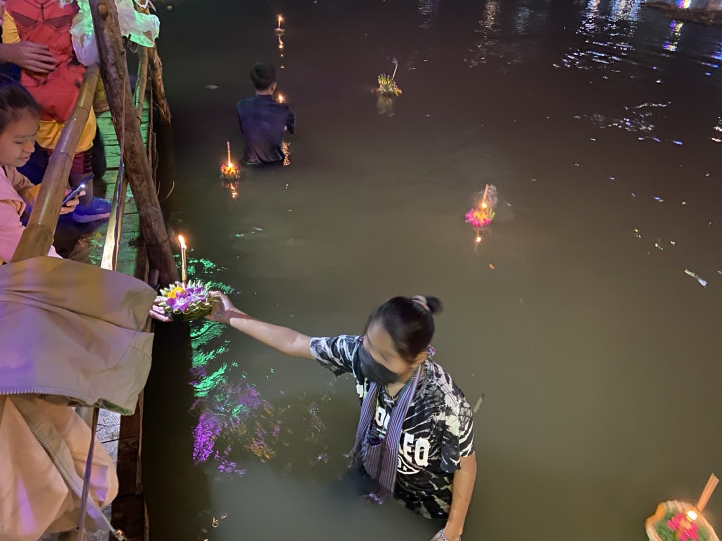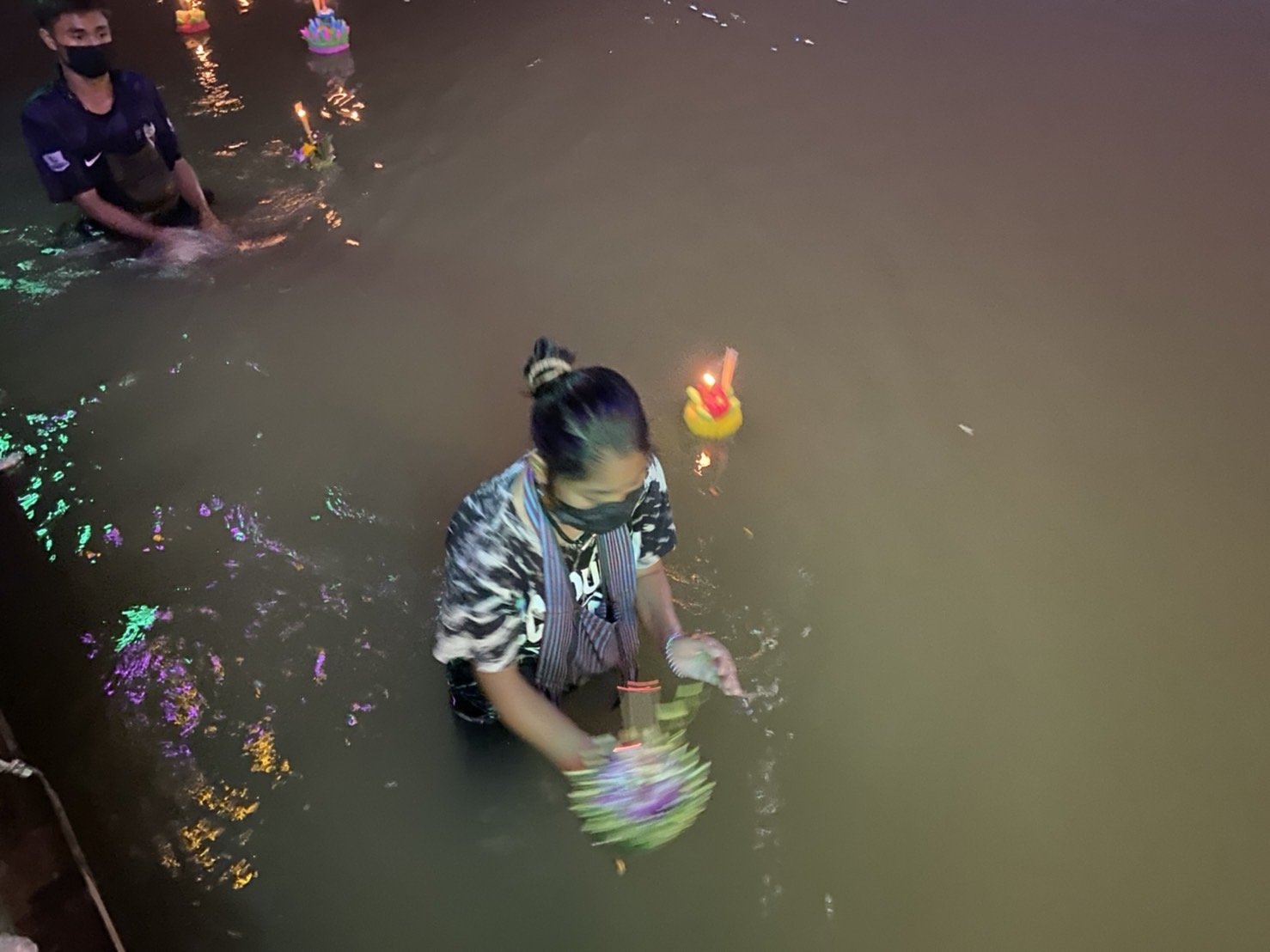 นอกจากนี้ยังสร้างรายได้ให้กับ 2 สามี-ภรรยา ที่ลงทุนยอมยืนแช่น้ำเป็นชั่วโมงเพื่อบริการคอยรับกระทงจากผู้ลอยกระทงลงสู่แม่น้ำและเก็บเงินเหรียญออกจากกระทง เป็นที่สังเกตว่าถุงผ้าใส่เงินเหรียญที่คล้องคอของทั้งคู่ มีเงินเหรียญค่อนครึ่งถุงทีเดียว ทั้งนี้ยังไม่พบว่ามีการก่อเหตุ ทะเลาะวิวาทแต่อย่างใด อีกทั้งฝั่งด้าน ต.ป่าแดด อ.เมืองเชียงใหม่ และฝั่ง ต.ท่าวังตาล อ.สารภี มีเจ้าหน้าที่ตำรวจและกู้ภัยฯคอยเดินตรวจตรารักษาความสงบและดูแลความปลอดภัยให้ประชาชนและนักท่องเที่ยวที่มาร่วมงานประเพณีดังกล่าวอย่างเข้มงวด