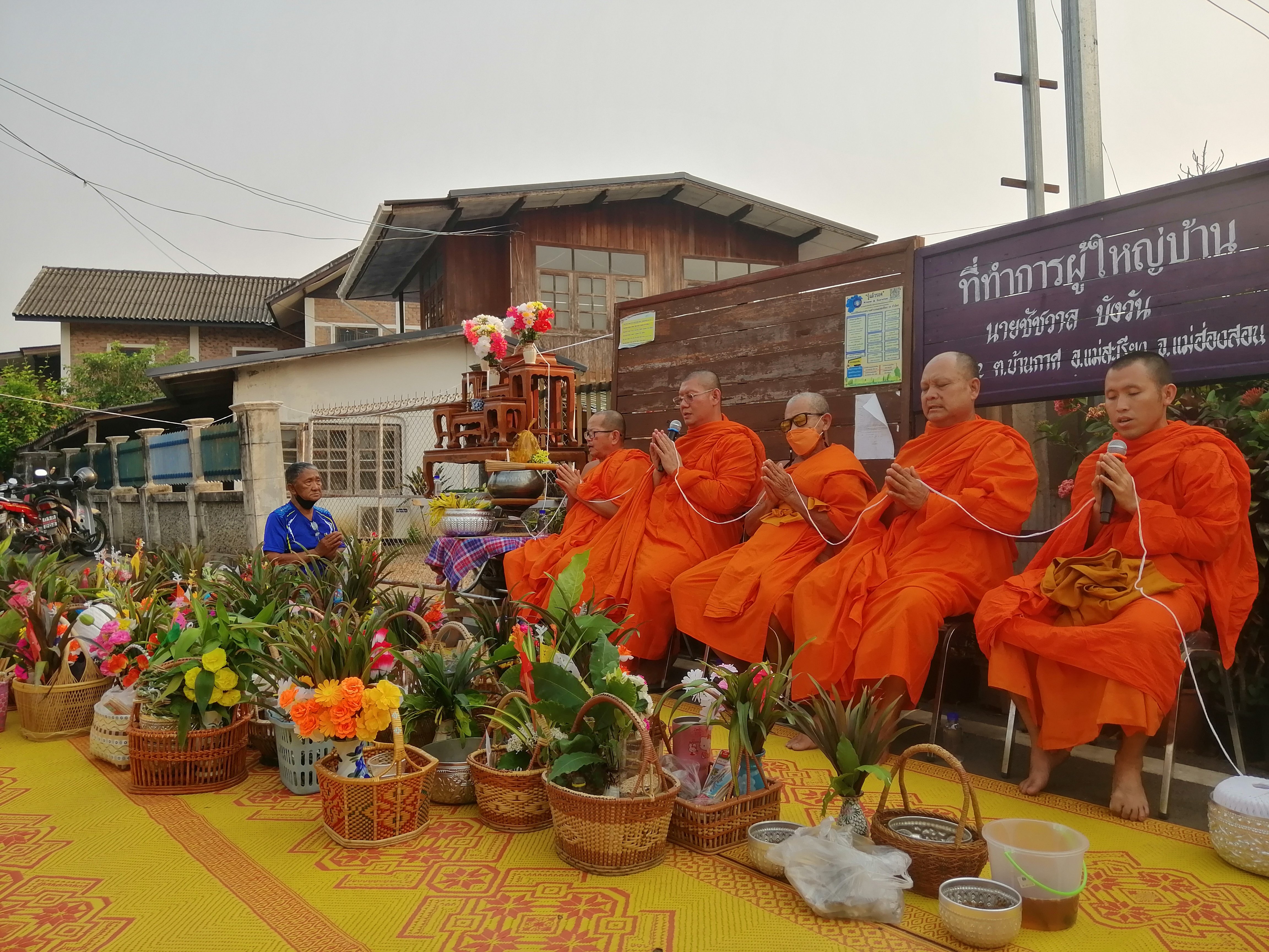 โดยนายชัชวาล บังวัน ผู้ใหญ่บ้านหมู่ 12 ต.บ้านกาศ อ.แม่สะเรียง จ.แม่ฮ่องสอน ได้นำราษฏรหมู่บ้านโป่ง ทำพิธีสูตรกอง สูตรถอน สะเดาะเคราะห์บ้านเมืองที่อยู่อาศัย ซึ่งทางหมู่บ้านโป่ง ได้ร่วมกันทำพิธีทุกปีหลังเทศกาลสงกรานต์ผ่านพ้นไป เป็นการสร้างขวัญและกำลังใจให้กับชาวบ้านในช่วงวิกฤตที่เกิดขึ้น เพื่อให้ชาวบ้านได้รู้สึกอบอุ่นใจ ซึ่งต่างช่วยกันตั้งจิตอธิษฐานให้สิ่งชั่วร้าย ความไม่เป็นมงคล โรคภัยไข้เจ็บต่างๆ หมดสิ้นไป โดยได้ทำการนิมนต์พระสงฆ์ 5 รูป ทำพิธีสวดส่งเคราะห์ สูตรกอง ตามประเพณีของพื้นบ้าน พร้อมประพรหมน้ำมนต์ลงใน ตระกร้าที่มีน้ำขมิ้นส้มป่อย ตะแหลว (ใบไม้มงคลในการขับไล่ปัดเป่าสิ่งชั่วร้าย ) เช่น ใบหนาด ใบมะดัน ใบหญ้าคา ทราย ที่ชาวบ้านนำมาร่วมทำพิธีสูตรกอง หรือ การสวดพระปริตรในหมู่บ้าน หลังเสร็จสิ้นพิธีก็จะนำกลับบ้านไปบูชา ไปปัดเป่า ป้องกันสิ่งชั่วร้ายต่างๆ