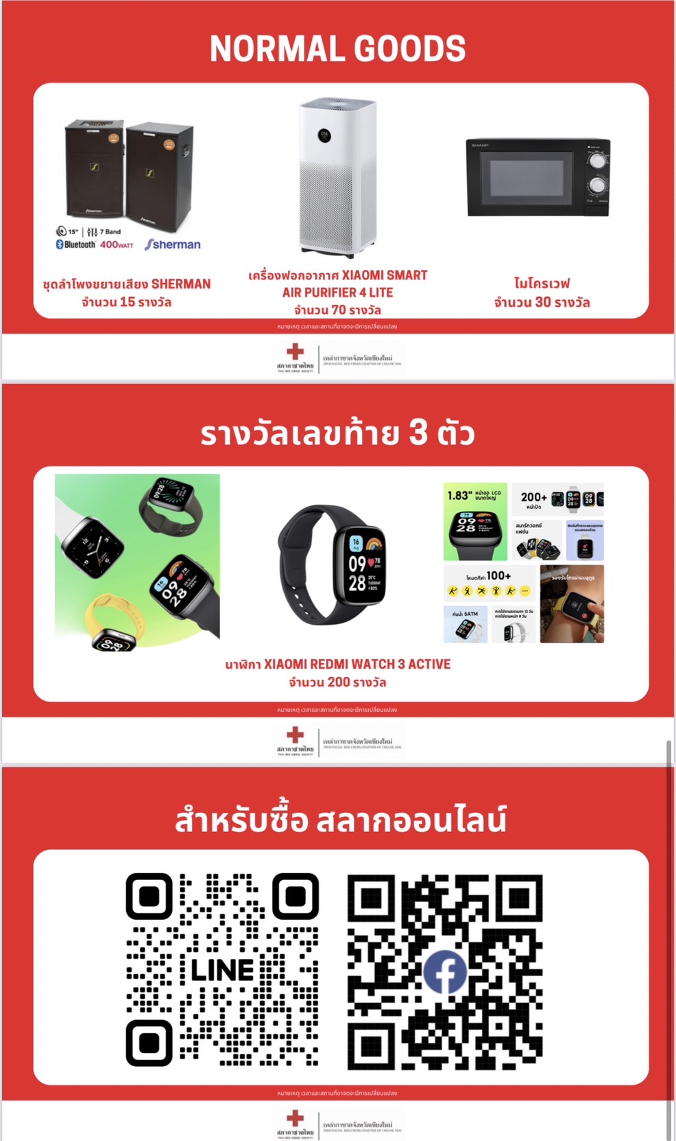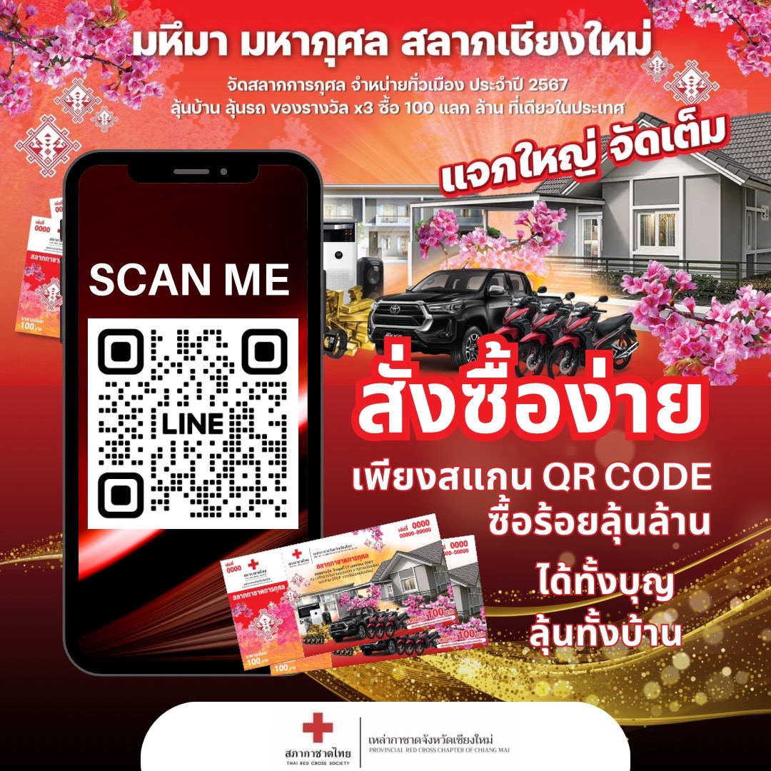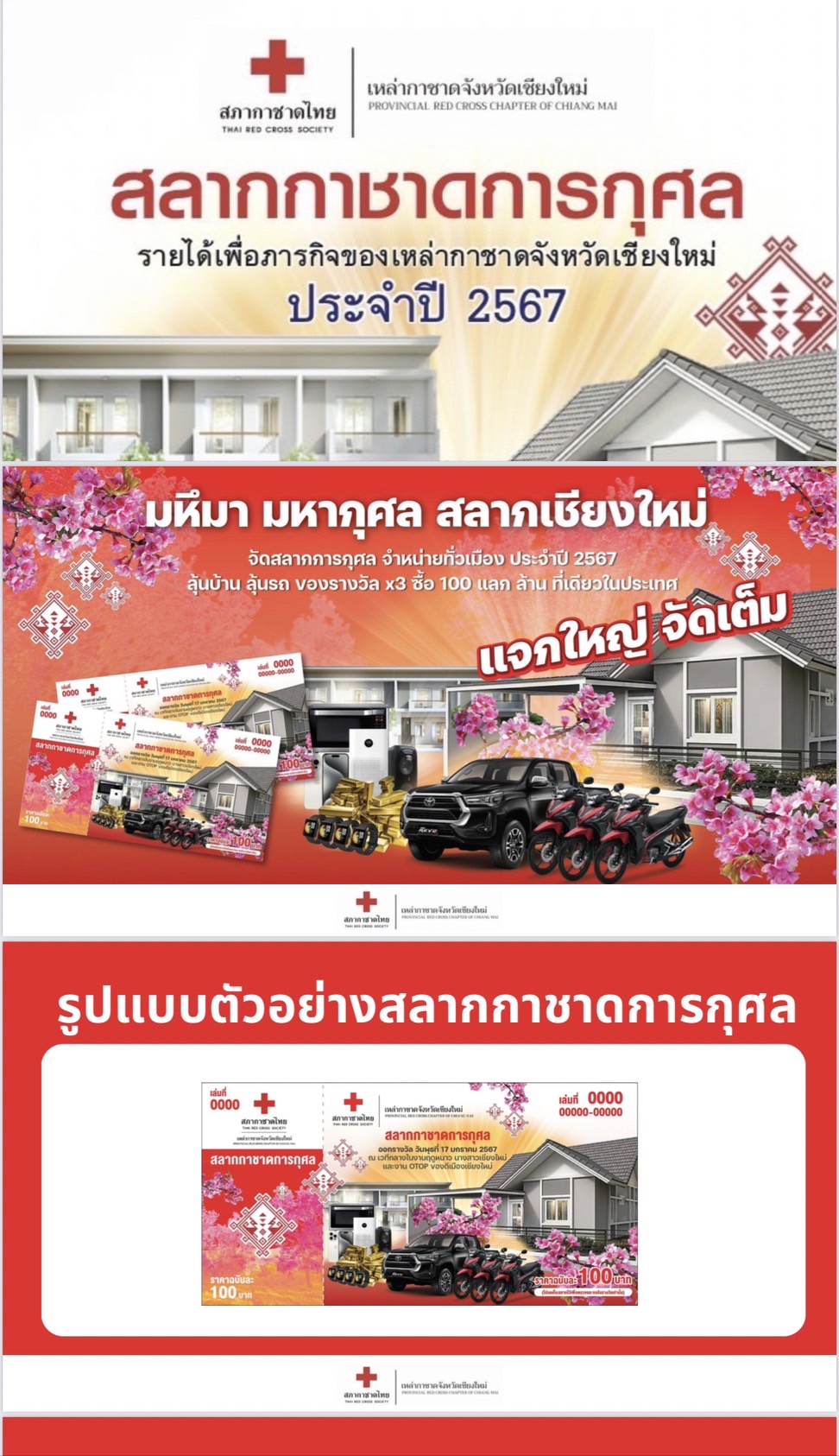 พร้อมกันนี้ เหล่ากาชาดจังหวัดเชียงใหม่ ซึ่งเป็นองค์กรการกุศลไม่แสวงผลกำไร ได้จัดทำสลากกาชาดการกุศล ประจำปี 2567 จำนวน 200,000 ฉบับ มาจำหน่ายให้กับพี่น้องประชาชน ในราคาฉบับละ 100 บาท เพื่อนำรายได้ไปช่วยเหลือบรรเทาทุกข์บำรุงสุขให้กับผู้ประสบสาธารณภัยต่างๆ ในสังคม และสงเคราะห์ประชาชนกลุ่มเปราะบาง กลุ่มผู้ยากไร้ รวมทั้งผู้ด้อยโอกาส ในพื้นที่ทั้ง 25 อำเภอของจังหวัดเชียงใหม่ โดยผู้ที่สนใจสามารถหาซื้อสลากกาชาดการกุศล ได้แล้ววันนี้ ณ ที่ว่าการอำเภอทุกอำเภอ และส่วนราชการต่างๆ ในพื้นที่จังหวัดเชียงใหม่ นอกจากนี้ ยังสามารถซื้อได้ทางออนไลน์ ผ่านคิวอาร์โค้ด LINE ของสภากาชาดจังหวัดเชียงใหม่