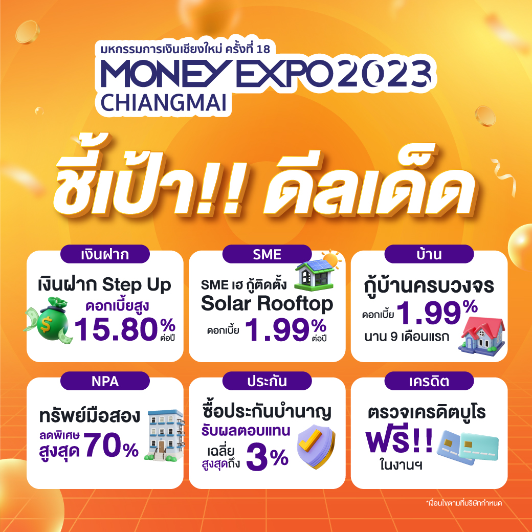 เปิดคึกคัก! งานมหกรรมการเงินเชียงใหม่ ครั้งที่ 18 มันนี่ เอ็กซ์โป 2023 MONEY EXPO 2023 CHIANGMAI จัดหนักโปรแรงส่งท้ายปีสู่ชาวเชียงใหม่และภาคเหนือ สินเชื่อบ้าน ดอกเบี้ย 1.99% นาน 9 เดือน, สินเชื่อ SME กู้ติดตั้งโซลาร์รูฟท็อป ดอกเบี้ย 1.99% ต่อปี, เงินฝาก Step Up ดอกเบี้ย 15.80% ต่อปี, ทรัพย์ NPA ทำเลเด่น ลดสูงสุด 70%, ซื้อประกันบำนาญรับผลตอบแทนเฉลี่ยสูงสุด 3%, สินเชื่อบุคคล ดอกเบี้ยต่ำ 1.99% ต่อปี นาน 3 เดือนแรก, ตรวจเครดิตบูโรฟรี พร้อมฟังสัมมนาฟรี! วันที่ 10-12 พฤศจิกายน 2566 ณ เชียงใหม่ ฮอลล์ ศูนย์การค้าเซ็นทรัล เชียงใหม่ แอร์พอร์ต จังหวัดเชียงใหม่