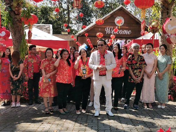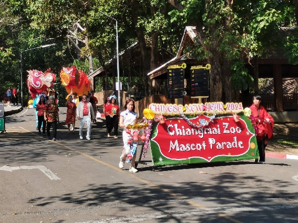 ในการนี้ ผู้อำนวยการสวนสัตว์เชียงใหม่ แต่งตัวด้วยชุดสีแดงลายมังกรทอง เตินนำหน้าขบวนมาสคอต