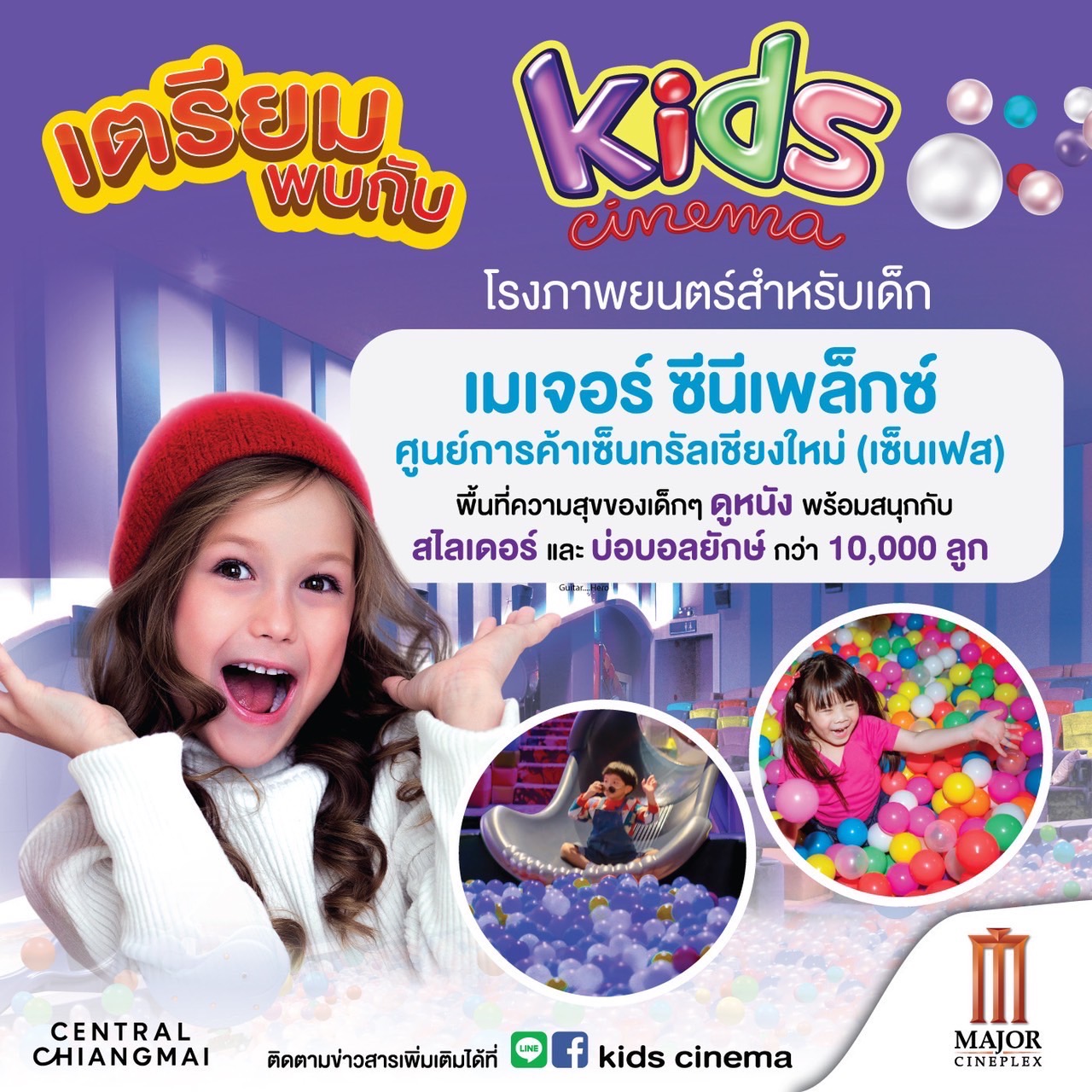 คิดส์ ซีนีมา ชั้น 5 ศูนย์การค้าเซ็นทรัล เชียงใหม่ (เซ็นเฟส) ยกสไลเดอร์และบ่อบอลยักษ์บรรจุบอลมากกว่า 10,000 ลูก เข้าไปไว้ในโรงหนัง ให้เด็กๆได้เล่นสนุก เสริมอรรถรสในการชมภาพยนต์อย่างปลอดภัยสำหรับเด็กโดยการ เพิ่มแสงสว่างขึ้น 30% และปรับลดเสียงลง 20% ทำให้การดูหนังในโรงของเด็กๆเป็นเรื่องสนุกและทำให้ครอบครัวได้ใช้เวลาดีร่วมกัน พร้อมเสริ์ฟกิจกรรมดีๆ ที่หน้าโรงหนังเพื่อให้เด็กๆได้เล่นรอเวลา ทั้ง WORKSHOP ระบายสีสร้างจินตนาการ , MASCOT ตัวการ์ตูนสุดน่ารัก