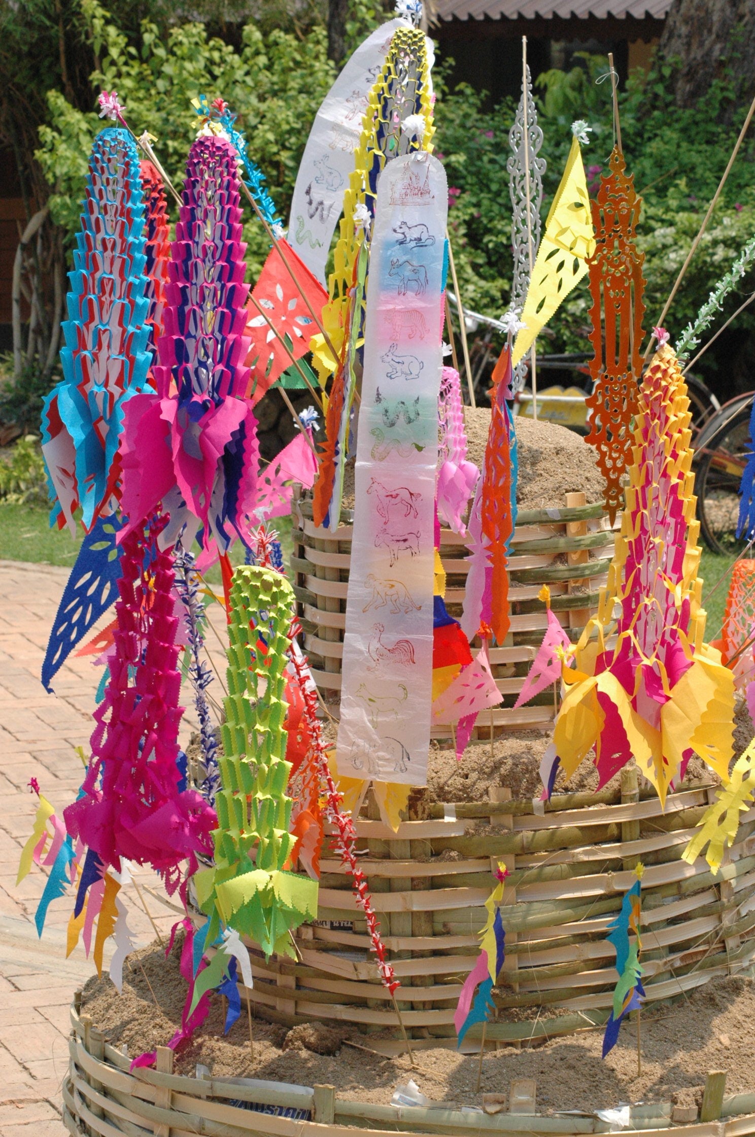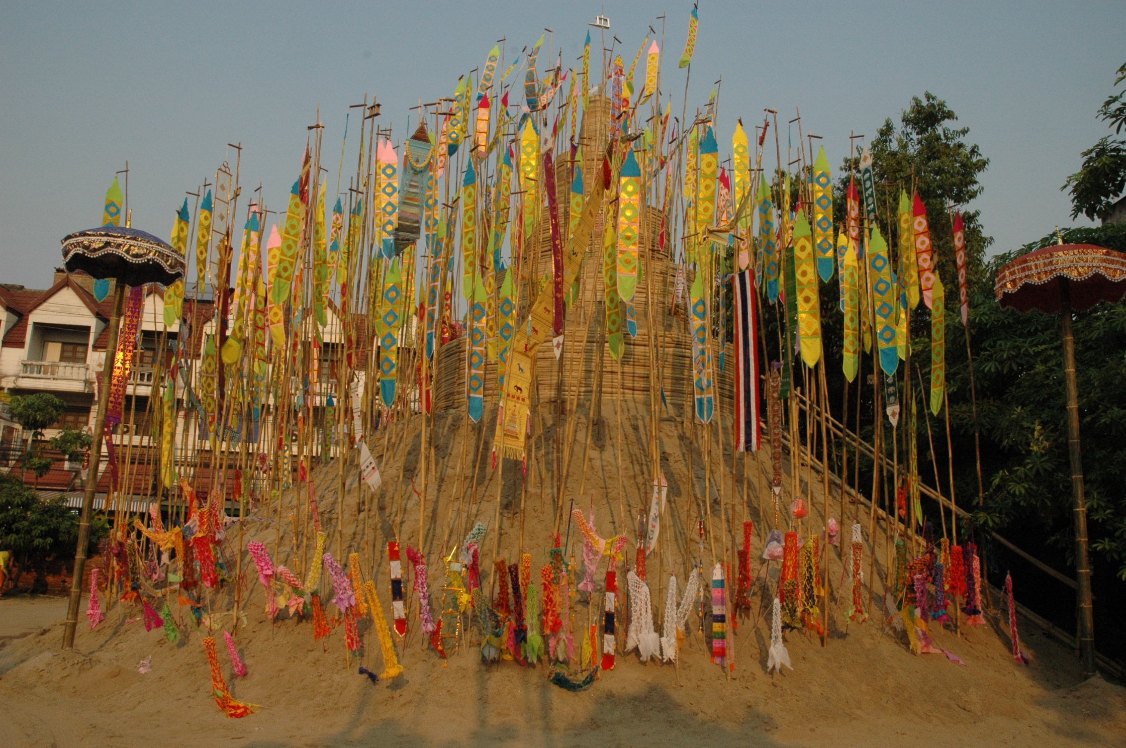 ในช่วงเทศกาลสงกรานต์ หรือ ปี๋ใหม่เมืองล้านนา จะมีประเพณีอย่างหนึ่งที่จะต้องทำสืบต่อกันมา ได้แก่ การก่อกองทรายถวายเจดีย์ตุง อันเนื่องมาจากเป็นประเพณีหนึ่งที่เกี่ยวข้องกับพระพุทธศาสนา โดยคนไทยผูกโยงประเพณีนี้เข้ากับคติความเชื่อเรื่องเวรกรรมในพระพุทธศาสนา มีการก่อพระเจดีย์ทรายถวายวัดเพื่อนำเศษดินทรายที่ติดเท้าออกจากวัดไปมาคืนวัดในรูปพระเจดีย์ทราย และเพื่อถวายเป็นพุทธบูชาให้เป็นกุศลอานิสงส์ และนอกจากประเพณีเพื่อเป็นพุทธบูชาแล้ว ยังเป็นกุศโลบายของคนในอดีตให้มีการรวมตัวของคนในชุมชนเพื่อร่วมกันจัดประเพณีรื่นเริงเป็นการสังสรรค์สร้างความสามัคคีของคนในชุมชนด้วย