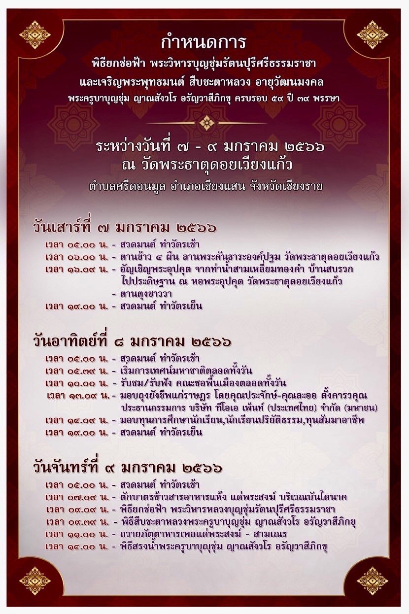 ระหว่างวันที่ 7-9 มกราคม 2566 ณ วัดพระธาตุดอยเวียงแก้ว ตำบลศรีดอนมูล อำเภอเชียงแสน จังหวัดเชียงราย และ ขอเชิญชวนกัลยาณมิตรทุกท่านได้ร่วมบุญกันตามกำลังศรัทธา ท่านใดประสงค์จะร่วมบุญบารมี ในครั้งนี้ หากไม่สะดวกมาร่วมด้วยตนเอง สามารถร่วมบุญได้ที่