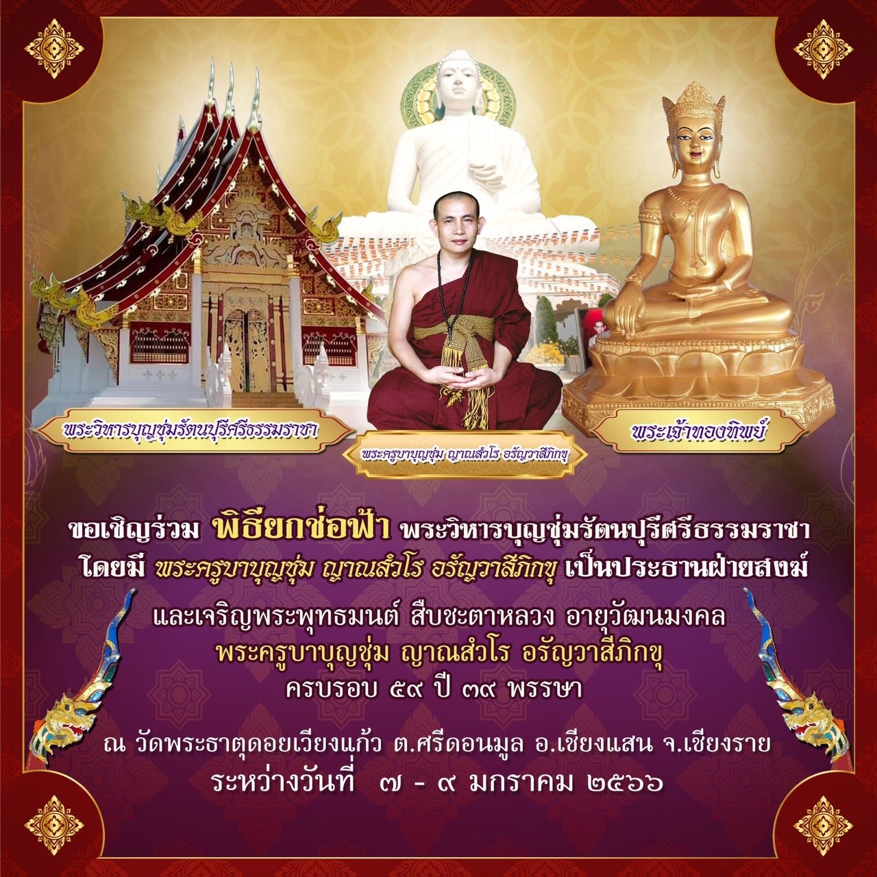 มูลนิธิดอยเวียงแก้ว พระครูบาบุญชุ่ม ญาณสังวโร อรัญวาสีภิกขุ และ ททท.สำนักงานเชียงราย-พะเยา ขอเชิญทุกท่านร่วมงานพิธีเจริญพระพุทธมนต์ สืบชะตาหลวง อายุวัฒนมงคล “พระครูบาบุญชุ่ม ญาณสังวโร อรัญวาสีภิกขุ ครบรอบ 59 ปี 39 พรรษา”