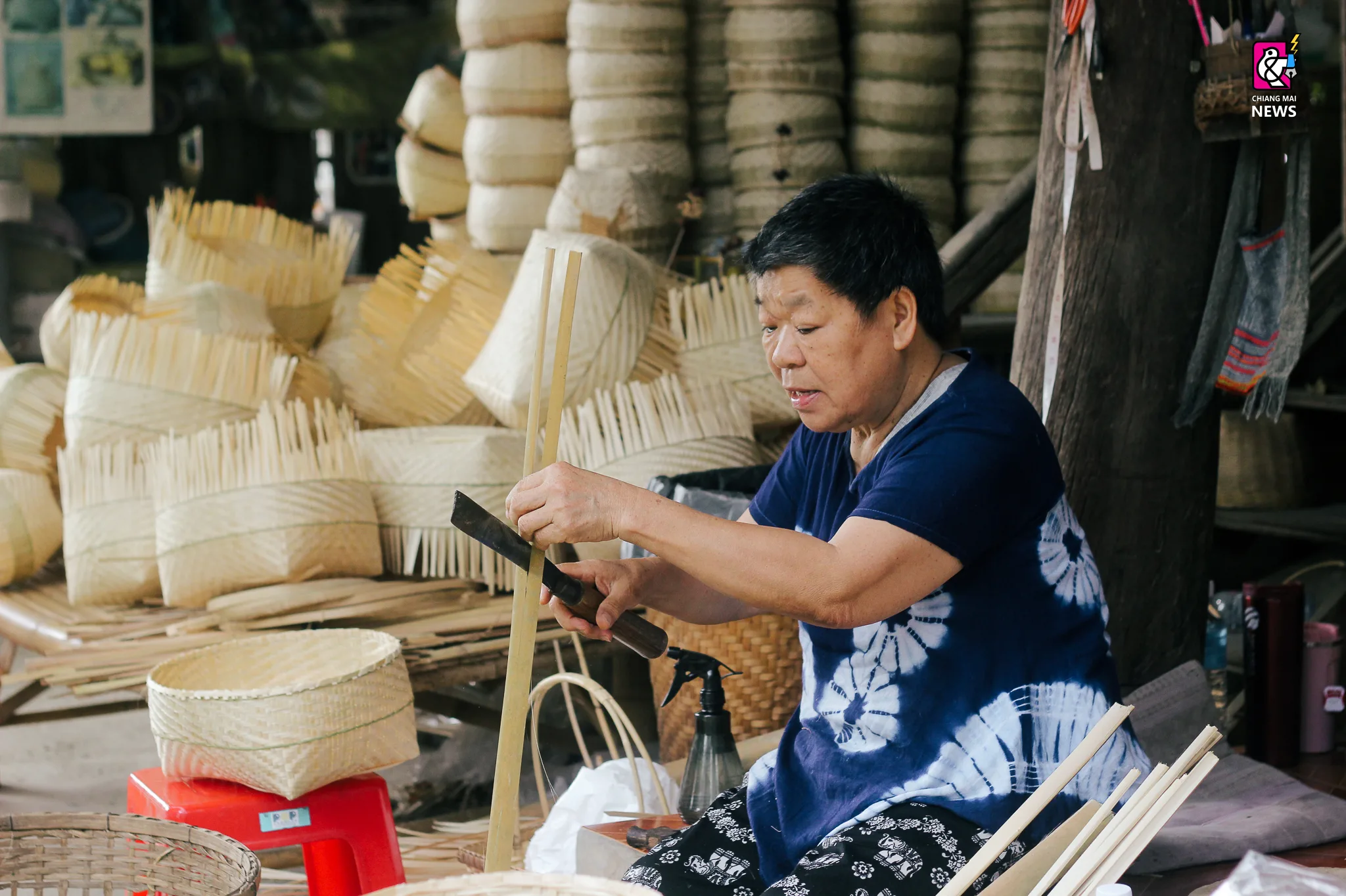 สล่าอำนวย แก้วสมุทร์ หรือ สล่าแดง เป็นตัวแทนของสล่าจักสานบ้านป่าบง ที่ยังคงทุ่มแรงกาย แรงใจ ในการอนุรักษ์ สืบสานภูมิปัญญาล้ำค่านี้ไม่ให้สูญหายไปจากบ้านป่าบง สล่าแดงเป็นหนึ่งคนที่โตมากับบ้านป่าบง โตมากับสภาพแวดล้อมที่มีครอบครัวจักสานไม้ไผ่ สล่าบอกกับเราว่า ในสมัยก่อน การจักสานมีอยู่ไม่กี่อย่าง จักสานเพียงแค่หาเงินทุน สำหรับส่งลูก ส่งหลานเรียนหนังสือ จักสานเฉพาะของใช้ที่ตอบโจทย์กับการใช้งานเมื่อไปทุ่งนา หรือไปตลาด สล่าแดงก็ได้มีการเรียนรู้ และนำมาประยุกต์เข้ากับสิ่งใหม่ ๆ ทำให้สินค้ามีความหลากหลายมากยิ่งขึ้น เพิ่มความทันสมัย ทำให้งานจักสานเป็นที่รู้จักมากขึ้น นอกจากการใช้งานเดิม ๆ อย่าง ข้องสำหรับจับปลา กระเช้าสีดาไว้สำหรับใส่ของ ก็ได้มีการขยายนำไปเป็นของที่ระลึก ของโชว์ในงานสำคัญต่าง ๆ ของเชียงใหม่ อย่างเช่น งานอำ งานฤดูหนาว หรือออแกไนซ์ต่าง ๆ