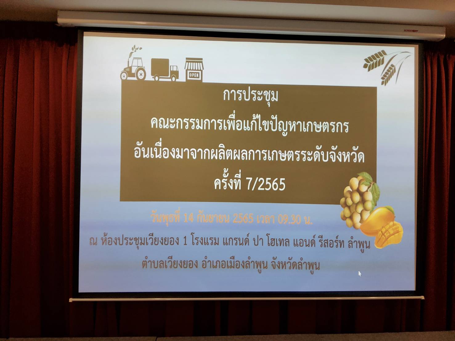 เมื่อวันที่ 14 กันยายน 2565 เวลา 09:30 นาฬิกา ถึง 12:00 นาฬิกา ที่ ห้องประชุมเวียงยอง 1 ชั้น 2 โรงแรม แกรนด์ ปา โฮเทล แอนด์ รีสอร์ท ลำพูน หมู่ที่ 5 ตำบลเวียงยอง อำเภอเมืองลำพูน จังหวัดลำพูน นายภาษเดช หงส์ลดารมภ์ รองผู้ว่าราชการจังหวัดลำพูน เป็นประธานการประชุมคณะกรรมการเพื่อแก้ไขปัญหาเกษตรกรอันเนื่องมาจากผลิตผลการเกษตรระดับจังหวัด (คพจ.) จังหวัดลำพูน ครั้งที่ 7/2565 โดยมี นางกนกรัตน์ ยุกติรัตน์ พาณิชย์จังหวัดลำพูน คณะกรรมการฯ, หัวหน้าส่วนราชการ, นายกสมาคมการค้าผู้ประกอบการผลไม้ไทยภาคเหนือ, หอการค้าจังหวัดลำพูน, ประธานคณะกรรมการกลางกลุ่มเกษตรกรระดับจังหวัด, ผู้ประกอบการภาคเอกชน และหน่วยงานที่เกี่ยวข้องเข้าร่วมประชุมฯ