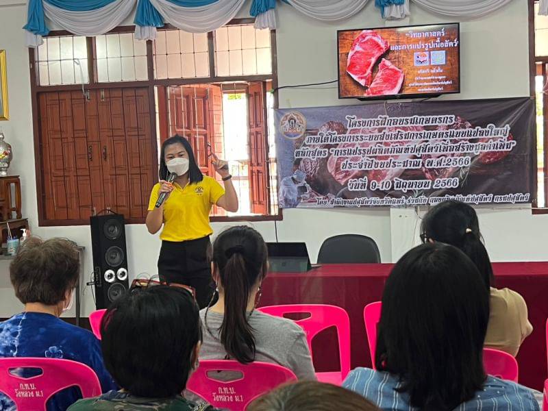………เมื่อวันที่ 9 พฤษภาคม 2566 นายสัตวแพทย์ ดร.สมพร พรวิเศษศิริกุล ปศุสัตว์จังหวัดแพร่ มอบหมายให้นางสาวอาทิยา แปลงใจ หัวหน้ากลุ่มส่งเสริมและพัฒนาการปศุสัตว์ สำนักงานปศุสัตว์จังหวัดแพร่ และ นางสาวณิชนันทน์ ทนุ รักษาราชการแทนปศุสัตว์อำเภอหนองม่วงไข่ ดำเนินการจัดฝึกอบรมเกษตรกรภายใต้โครงการระบบส่งเสริมการเกษตรแปลงใหญ่หลักสูตร “การแปรรูปผลิตภัณฑ์ปศุสัตว์เพื่อสร้างมูลค่าเพิ่ม” ประจำปีงบประมาณ พ.ศ.2566 โดยได้รับเกียรติจากเจ้าหน้าที่ศูนย์วิจัยและพัฒนาผลิตภัณฑ์ปศุสัตว์เชียงใหม่ เป็นวิทยากรเรื่องการแปรรูปผลิตภัณฑ์ปศุสัตว์ การทำเนื้อย่าง การทำบาบีคิวเนื้อ และการทำเนื้อแดดเดียว ณ อาคารอเนกประสงค์บ้านวังหลวงหมู่ที่1 อำเภอหนองม่วงไข่
