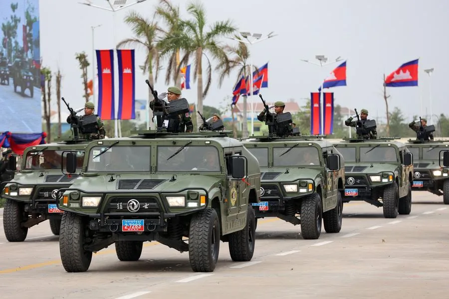 (แฟ้มภาพซินหัว : ขบวนพาหนะทางการทหารเนื่องในวาระครบรอบ 25 ปี การก่อตั้งกองทัพบกกัมพูชา ในกรุงพนมเปญของกัมพูชา วันที่ 24 ม.ค. 2024)