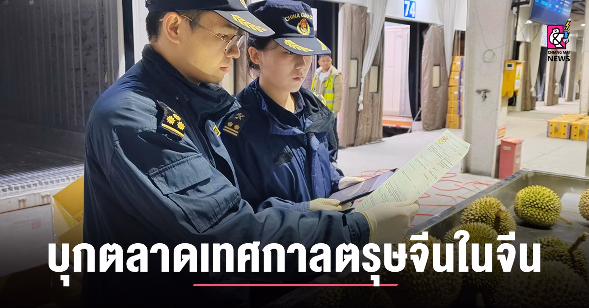 (ภาพจากศุลกากรหนานหนิง : เจ้าหน้าที่ศุลกากรด่านโหย่วอี้กวนในเขตปกครองตนเองกว่างซีจ้วงทางตอนใต้ของจีนตรวจสอบทุเรียนนำเข้า)
