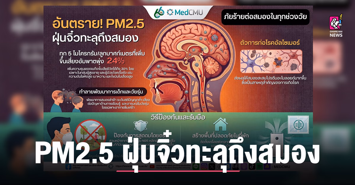 ‼️อันตราย! PM2.5 ฝุ่นจิ๋วทะลุถึงสมอง ทุก 5 ไมโครกรัม/ลูกบาศก์เมตร ที่เพิ่มขึ้นเสี่ยงอัมพาตพุ่ง 24% เพิ่มความรุนแรงจนถึงขั้นเสียชีวิตได้ถึง 30% โดยเฉพาะในกลุ่มผู้สูงอายุ และผู้ป่วยโรคเรื้อรัง เช่น ความดันโลหิตสูง เบาหวาน และไขมันในเลือดสูง ทำลายพัฒนาการเด็กและวัยรุ่น พัฒนาการสมองล่าช้า ระดับสติปัญญาต่ำ เสี่ยงต่อปัญหาด้านการเรียบรู้ และอารมณ์ในวัยรุ่น โดยเฉพาะอาการซึมเศร้า ⚠️ภัยร้ายต่อสมองในทุกช่วงวัยตัวการก่อโรคอัลไซเมอร์ ส่งผลให้สมองสะสมโปรตีนอะไมลอยด์มากขึ้น ซึ่งเป็นสาเหตุสำคัญของการเกิดโรค ✅วิธีป้องกันและรับมือ▪️ป้องกันการสูดดมโดยตรงสวมหน้ากากป้องกันฝุ่น N95 หลีกเลี่ยงการอยู่ในพื้นที่ที่มีมลพิษสูง และควรงดกิจกรรมกลางแจ้ง ทุกประเภท▪️สร้างพื้นที่ปลอดภัยในที่พักติดตั้งเครื่องฟอกอากาศในห้องนอนหรือในบ้าน ข้อมูลโดย : ผศ.นพ.สุรัตน์ ตันประเวช ผู้ช่วยคณบดีและหัวหน้าหน่วยวิชาประสาทวิทยา ภาควิชาอายุรศาสตร์ คณะแพทยศาสตร์ มช. ติดตามผ่านทาง Facebook : https://cmu.to/VIBU2