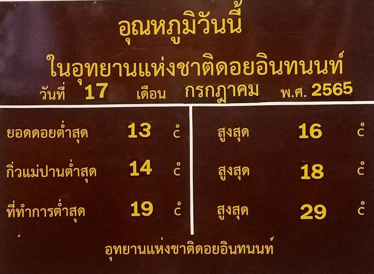 สำหรับอุทยานแห่งชาติดอยอินทนนนท์ วันนี้อากาศที่ยอดดอยอินทนน์เย็นชื้น อากาศทั้งวันจะเย็นสะบายหลังจากฝนตกไปเมื่อคืนที่ผ่านมาถึงจะไม่มากก็ตาม แต่อากาศเย็นมาก เนื่องจากยอดดอยอินทนนท์เป็นจุดที่สูงจากระดับน้ำทะเล 2,565 เมตร ถือว่าเป็นยอดดอยที่อากาศเย็นที่สุดในประเทศไทย
