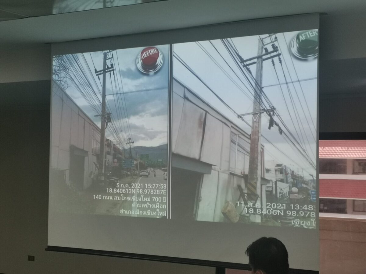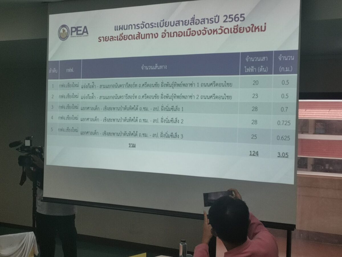ทั้งนี้ที่ประชุมได้มีมติร่วมกันที่จะให้มีการจัดระเบียบสายไฟฟ้าและสายสื่อสารที่ไม่เป็นระเบียบเรียบร้อยซึ่งมีเห็นตามถนนหลายๆ สายมากโดยเฉพาะในเขตเมือง หรือเขตเทศบาลนครเชียงใหม่ ทั้งนี้จะดำเนินการให้แล้วเสร็จในทีละเส้นทาง โดยเริ่มดำเนินการบนถนนวังสิงห์คำ ตั้งแต่เชิงสะพานรัตนโกสินทร์เลียบแม่น้ำปิงฝั่งตะวันตกไปจนถึงบริเวณเชิงสะพานป่าตัน โดยจุดนี้จะมีเสาไฟฟ้าจำนวน 59 ต้น และมีสายสื่อสารเกาะเกี่ยวบนเสาไฟฟ้าราว 10 ค่าย โดยจะใช้เวลาดำเนินการตั้งแต่เวลา 09.00 – 12.00 น. ซึ่งจะใช้จัดระเบียบสายราว 1 เดือน และจะเริ่มดำเนินการตั้งแต่วันที่ 20 ก.ค. 2565 เป็นต้นไป