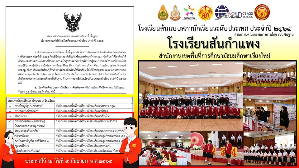 โรงเรียนสันกำแพง จังหวัดเชียงใหม่ ได้ผ่านการคัดเลือกให้เป็น “โรงเรียนต้นแบบสภานักเรียน ระดับประเทศ” ประจำปีการศึกษา 2565 รับรางวัลโล่ เกียรติบัตร จากสำนักงานคณะกรรมการการศึกษาขั้นพื้นฐาน กระทรวงศึกษาธิการ กิจกรรมดังกล่าวมีวัตถุประสงค์ เพื่อส่งเสริมและพัฒนากิจกรรมสภานักเรียน ให้โรงเรียนได้ดำเนินกิจกรรมสภานักเรียนทั้งระบบอย่างเป็นรูปธรรม นักเรียนได้เรียนรู้บทบาทหน้าที่ความเป็นพลเมืองตามวิถีประชาธิปไตย สำนึกในความเป็นชาติไทย มีส่วนร่วมในการบริหารพัฒนาโรงเรียนอย่างสร้างสรรค์ตามกฎ กติกา เป็นแหล่งเรียนรู้ด้านกิจกรรมสภานักเรียน ให้โรงเรียนอื่นได้ศึกษาดูงาน และสามารถขยายผลกิจกรรมสภานักเรียนได้อย่างต่อเนื่องและยั่งยืน