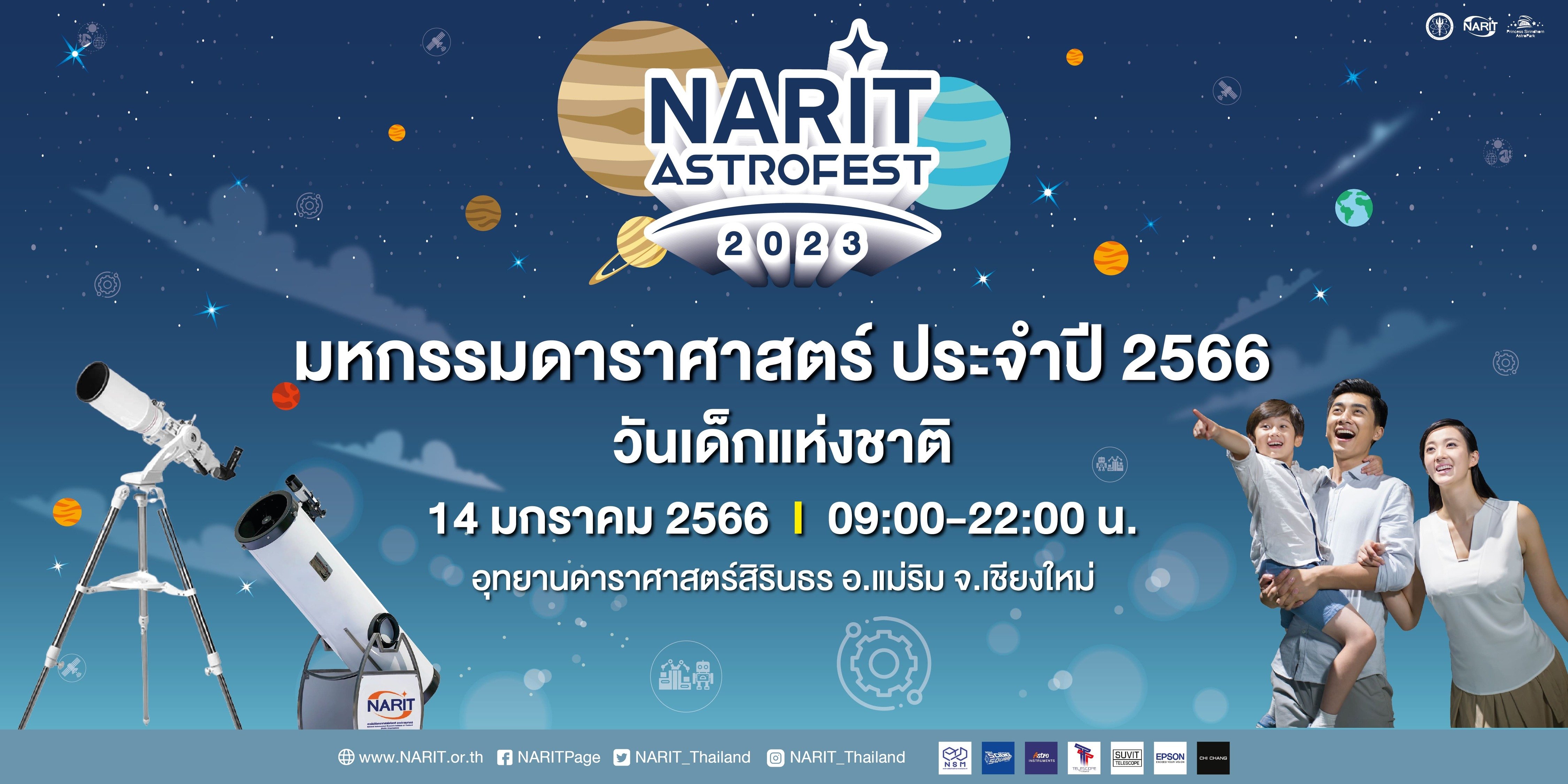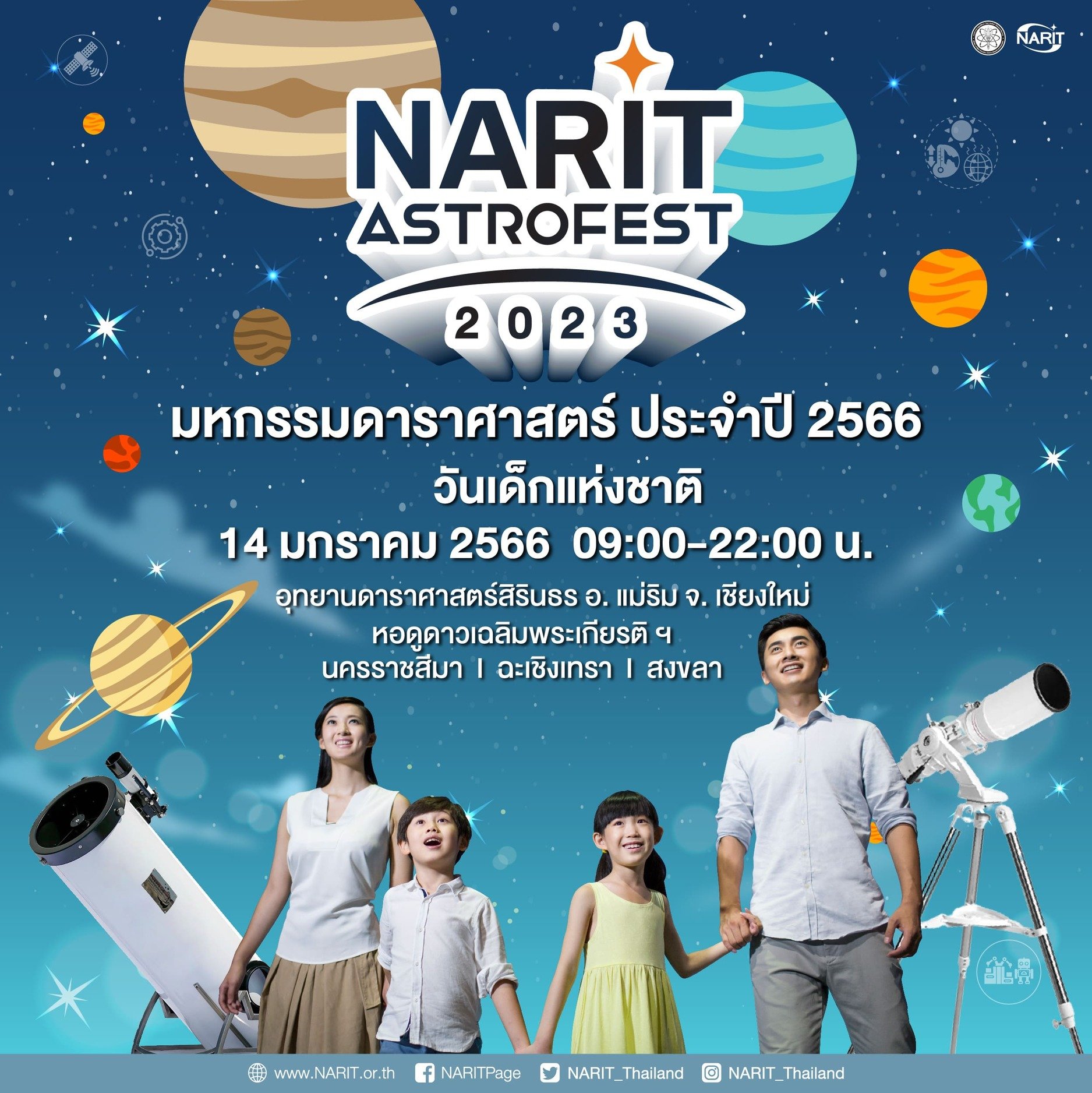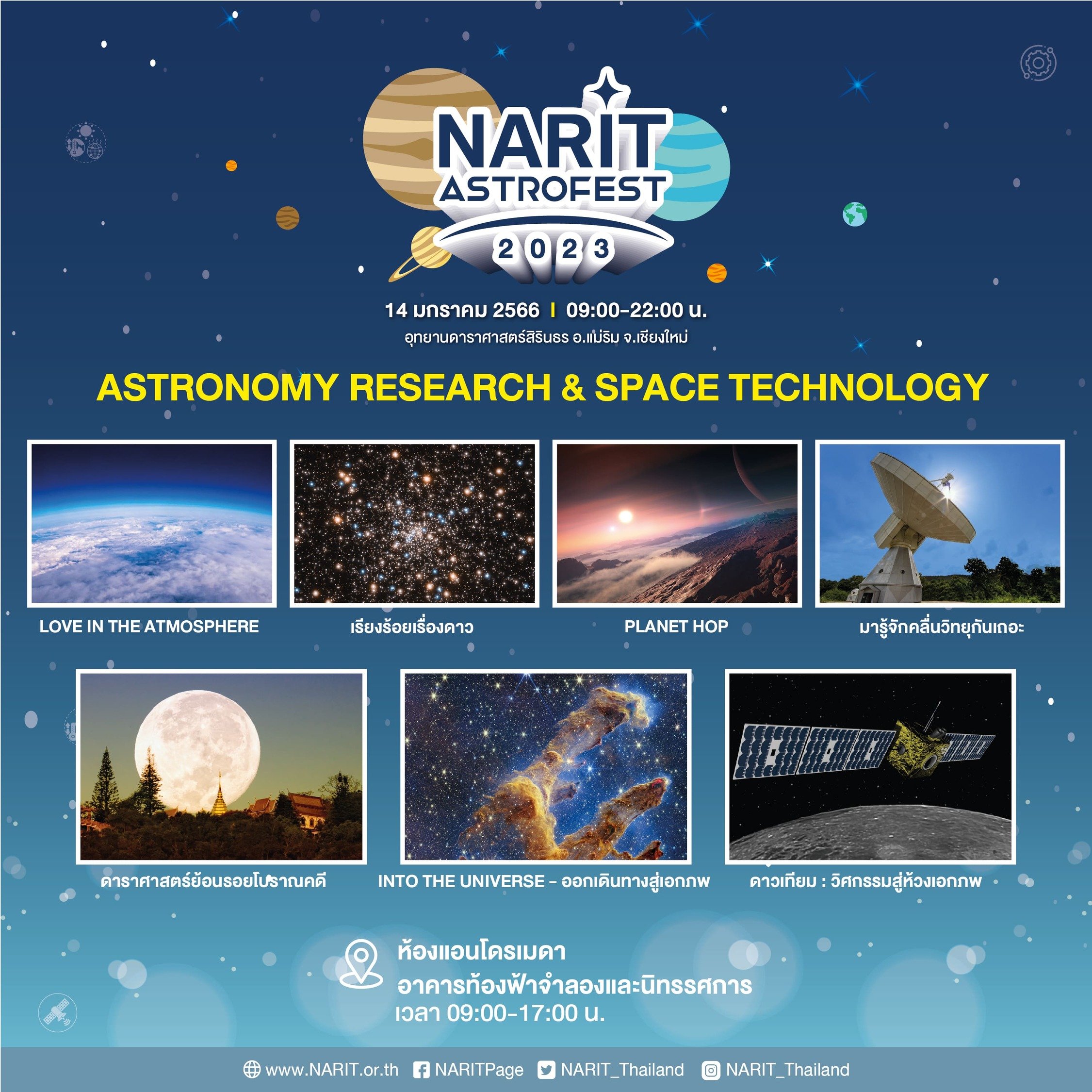 สถาบันวิจัยดาราศาสตร์แห่งชาติ (องค์การมหาชน) (สดร.) กระทรวงการอุดมศึกษา วิทยาศาสตร์ วิจัย และนวัตกรรม (อว.) ชวนตะลุยโลกดาราศาสตร์กับ “มหกรรมดาราศาสตร์ประจำปี 2566” (NARIT AstroFest 2023) หนึ่งปีมีครั้งเดียวกับเปิดบ้านเยี่ยมชมห้องปฏิบัติการพัฒนาเทคโนโลยีดาราศาสตร์และวิศวกรรมขั้นสูงสุดล้ำ และตื่นตากับงานวิจัยดาราศาสตร์ กระทบไหล่นักดาราศาสตร์ผู้มีห้วงอวกาศเป็นห้องทำงานขนาดใหญ่ ช่วงค่ำชวนมา Star Party ชมดาวเคล้าเสียงเพลง ส่องวัตถุท้องฟ้าที่น่าสนใจผ่านกล้องโทรทรรศน์หลากหลายชนิด พร้อมลุ้นรับกล้องโทรทรรศน์ และรางวัลมากมายตลอดงาน พบกันวันเสาร์ที่ 14 มกราคมนี้ ตั้งแต่เวลา 09:00- 22:00 น. ณ อุทยานดาราศาสตร์สิรินธร อ. แม่ริม จ. เชียงใหม่ และหอดูดาวภูมิภาค นครราชสีมา ฉะเชิงเทรา และสงขลา