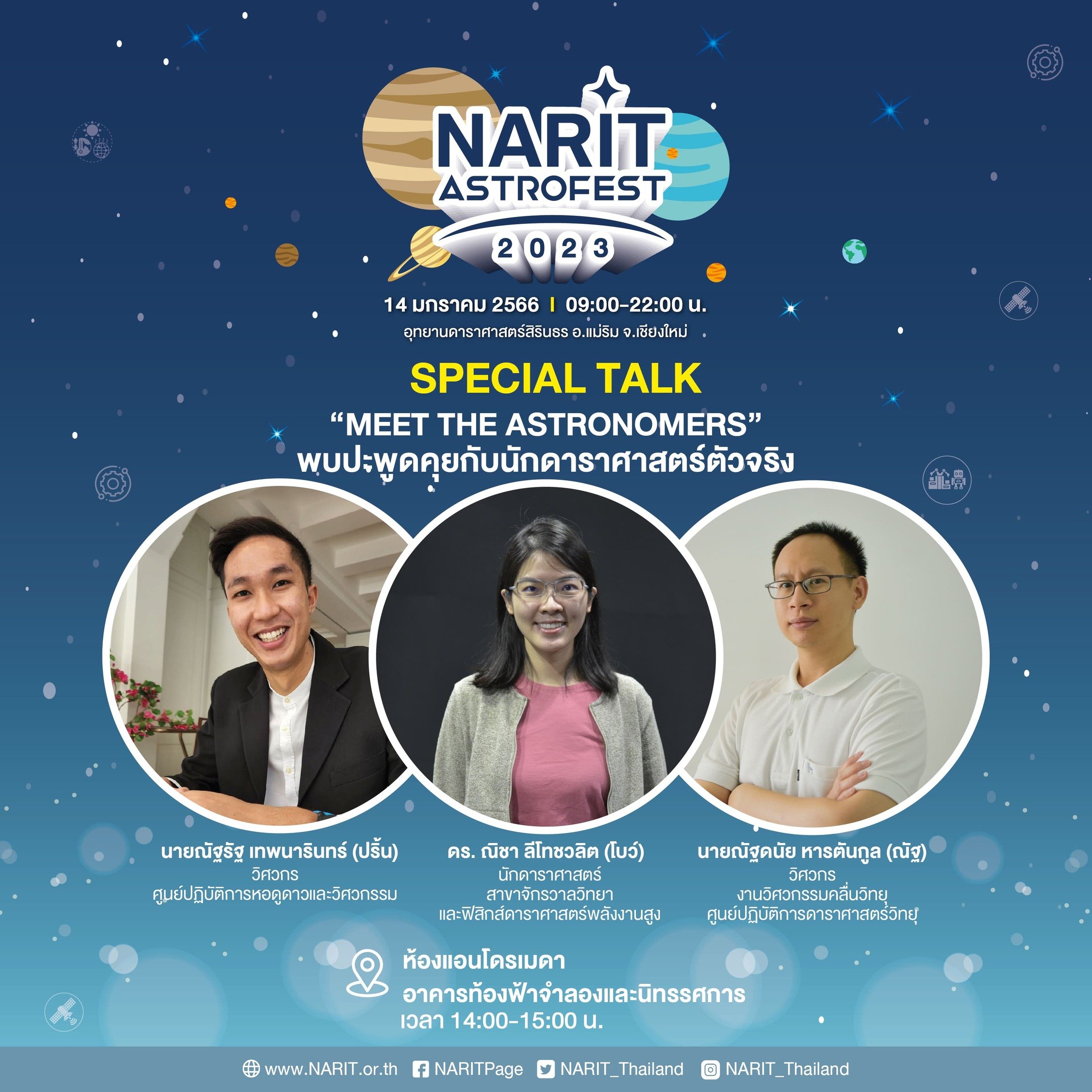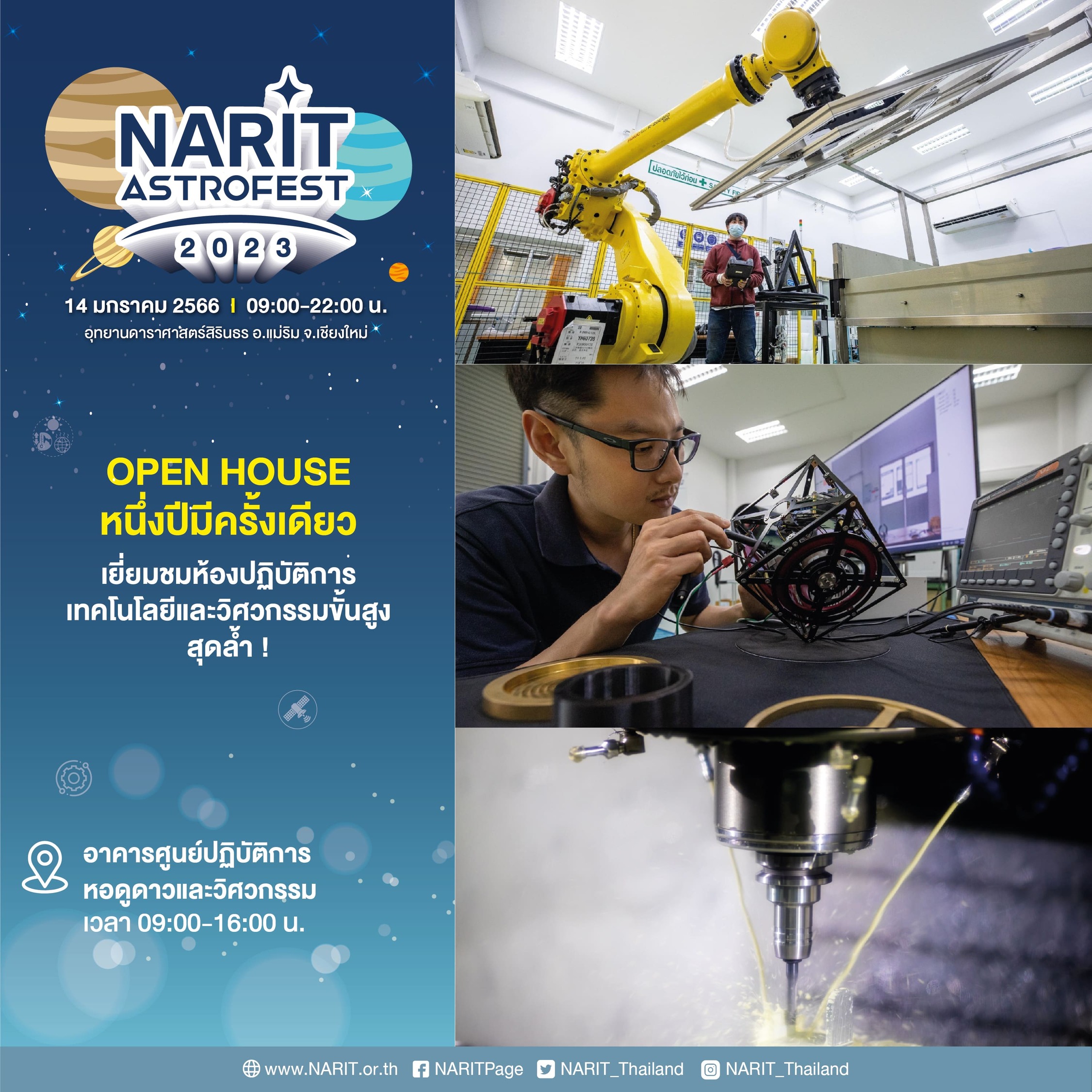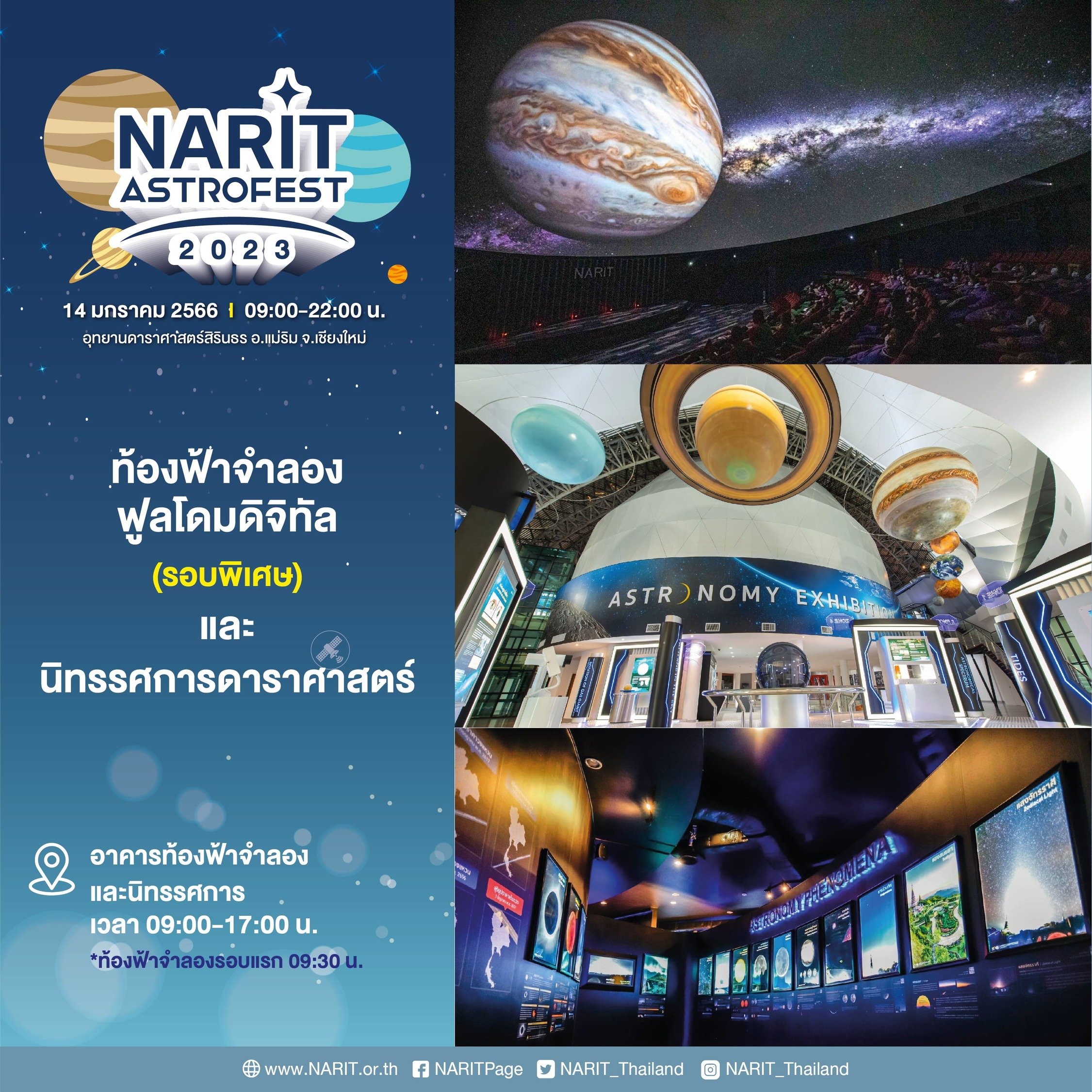 แรลลี่นิทรรศการดาราศาสตร์เก็บแต้มลุ้นรางวัล ท่องเอกภพในท้องฟ้าจำลองฟูลโดมดิจิทัลรอบพิเศษตลอดทั้งวัน หนึ่งปีมีครั้งเดียวกับการเปิดบ้านเยี่ยมชมห้องปฏิบัติการพัฒนาเทคโนโลยีดาราศาสตร์และวิศวกรรมขั้นสูงสุดล้ำ หลากหลายกิจกรรมดาราศาสตร์สำหรับเด็ก และครอบครัว อาทิ ประดิษฐ์แก้วกลุ่มดาว DIY สร้างสรรค์กลุ่มดาวจากหลอดไฟ LED จิ๋ว ฯลฯ เกมดาราศาสตร์แสนสนุกกับ Astronomy Fun Fair พบปะนักดาราศาสตร์และวิศวกรตัวจริงเสียงจริง ช่วงค่ำสัมผัสประสบการณ์ดูดาวผ่านกล้องโทรทรรศน์นานาชนิด และเรียนรู้วัตถุท้องฟ้ากับกิจกรรม NARIT Public Night และ Star Party ชมดาวเคล้าเสียงดนตรี ร่วมเรืองแสงในกิจกรรม Glow in the Dark พิเศษสุดๆ กับคาราวานกล้องโทรทรรศน์จากโรงเรียนเครือข่าย และนักดาราศาสตร์สมัครเล่น ร่วมตั้งกล้องดูดาวเพื่อบริการประชาชน เพลิดเพลินกับ Star Market สารพันสินค้าอาหารในธีมดาราศาสตร์ และกิจกรรมลุ้นรับกล้องโทรทรรศน์ และของรางวัลมากมาย สอบถามเพิ่มเติม โทร. 081-8854353 หรือ 094-1535694