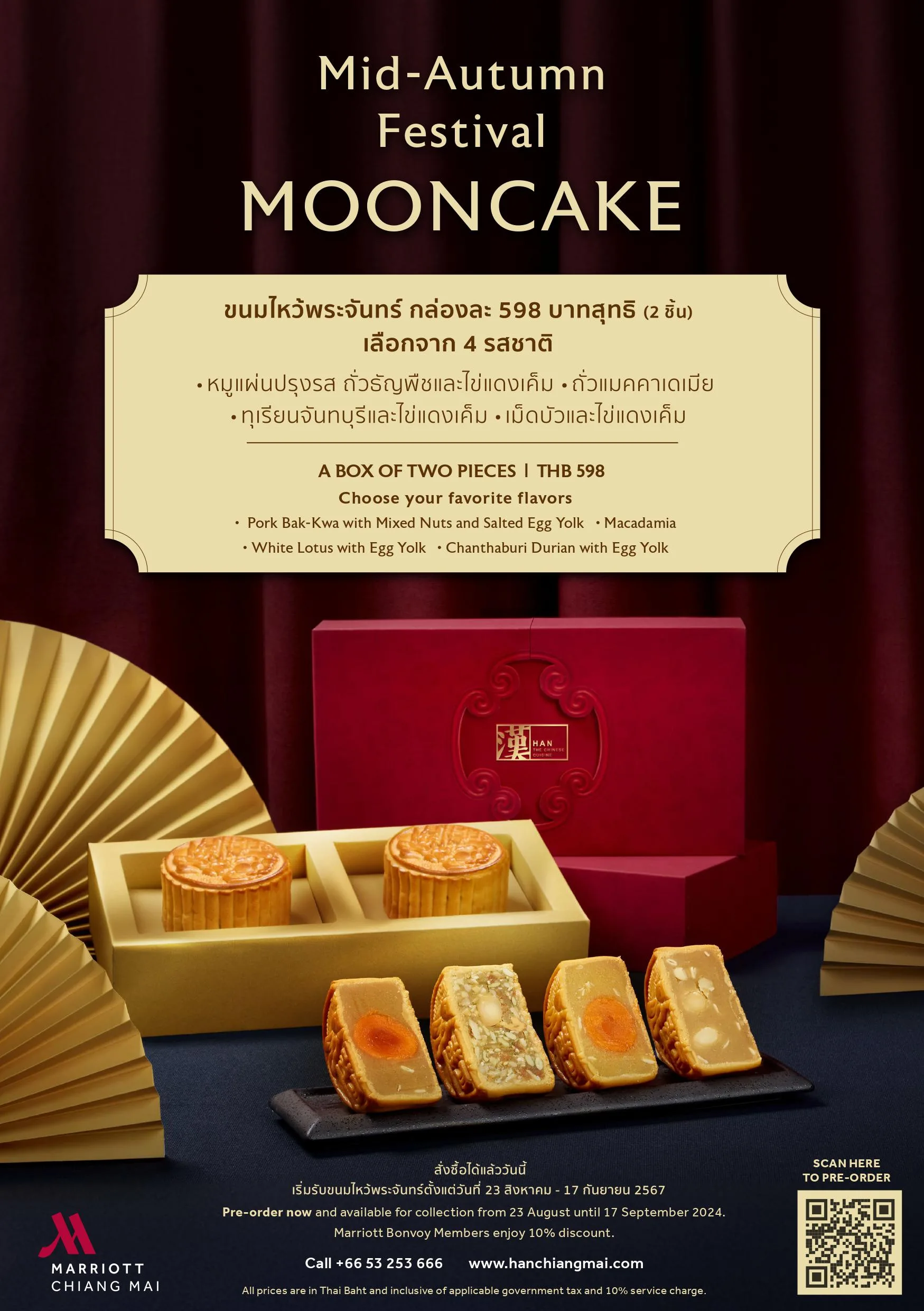 ต้อนรับเทศกาลไหว้พระจันทร์ ด้วย ขนมไหว้พระจันทร์ สุดพรีเมี่ยม จากเชียงใหม่ แมริออท ส่งต่อความความรัก ความห่วงใย ถึงคนที่คุณรัก มีให้เลือกทั้งหมด 4 รสชาติ ไม่ว่าจะเป็นรสหมูแผ่นปรุงรส ถั่วธัญพืชและไข่แดงเค็ม รสทุเรียนจันทบุรีและไข่แดงเค็ม รสเม็ดบัวและไข่แดงเค็ม และรสถั่วแมคาเดเมีย