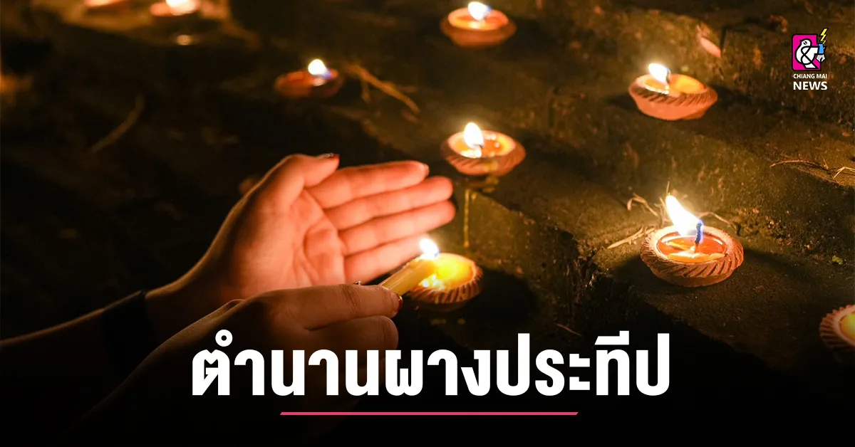 มีการเล่าเรื่องราวเกี่ยวกับที่มาของผางประทีปซึ่งเป็นเรื่องราวที่ปรากฎในคัมภีร์อานิสงส์ผางประทีป เล่าว่าเมื่อครั้งดึกดำบรรพ์มีแม่กาเผือกกำลังกกไข่อยู่บนต้นไม้ใกล้แม่น้ำแห่งหนึ่ง จู่ ๆ ก็ได้มีลมพายุพัดรังกากระจัดกระจายทำให้ไข่ได้ตกลงไปในแม่น้ำ ส่วนแม่กาก็พลัดไปอีกทางหนึ่ง พอลมสงบแม่กาหาไข่ไม่พบ ก็ร้องไห้จนตรอมใจตายและได้ไปเกิดเป็นท้าวพกาพรหมบนสวรรค์ ส่วนไข่ 5 ฟอง ก็ได้ถูกแม่สัตว์อื่นเก็บไปเลี้ยง (แม่ไก่ แม่โค แม่นาค แม่เต่า และแม่ราชสีห์) ซึ่งบางตำราว่าคนซักผ้านำเอาไปเลี้ยง เอาไข่ไปฟักตัวละฟอง พอโตขึ้นต่างก็ออกบวชเป็นฤาษีอยู่ในป่า วันหนึ่งฤาษีทั้ง 5 (ซึ่งคือพระพุทธเจ้า 5 พระองค์ ) มาเจอกันต่างก็ถามถึงความเป็นมาของกันและกัน แต่ก็ไม่มีใครรู้จักแม่ที่แท้จริงของตนเลย จึงพากันอธิษฐานขอให้ได้พบแม่ของตนร้อนถึงท้าวพกาพรหมต้องลงมาพบเล่าเรื่องอดีตให้ฟังและบอกว่า ถ้าคิดถึงแม่ให้เอาด้ายดิบทำเป็นรูปตีนกาแล้วจุดไฟในประทีปในวันยี่เป็ง คือวันเพ็ญเดือน 12 เพื่อระลึกถึงแม่