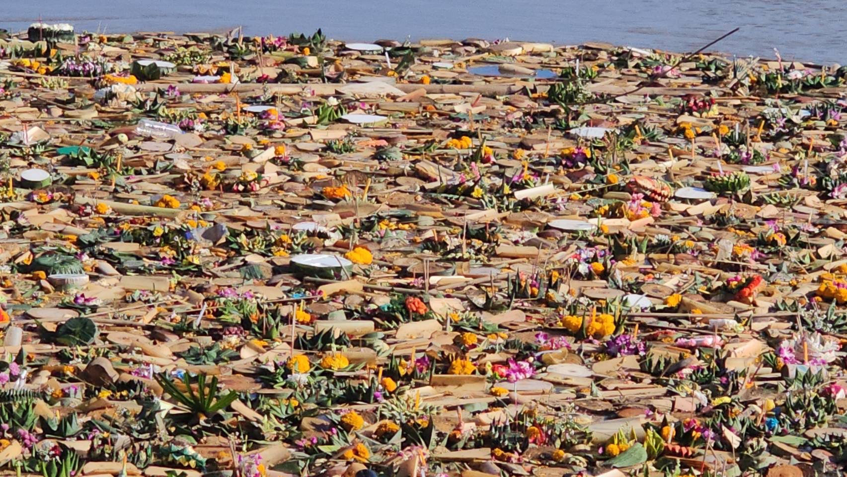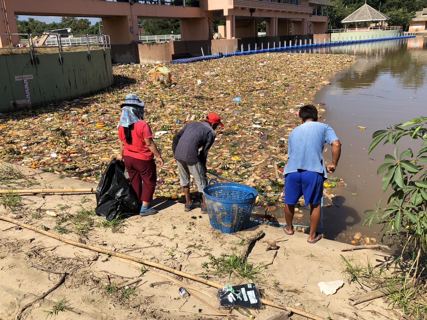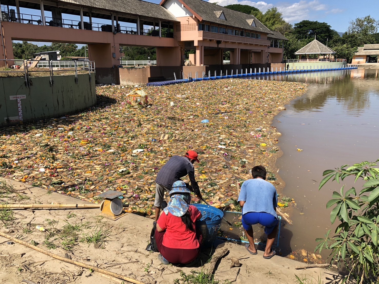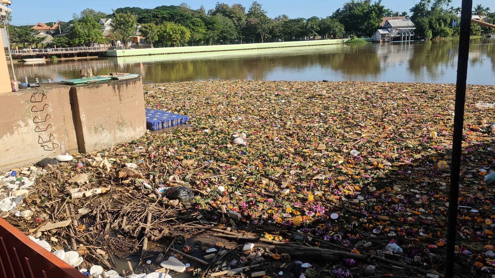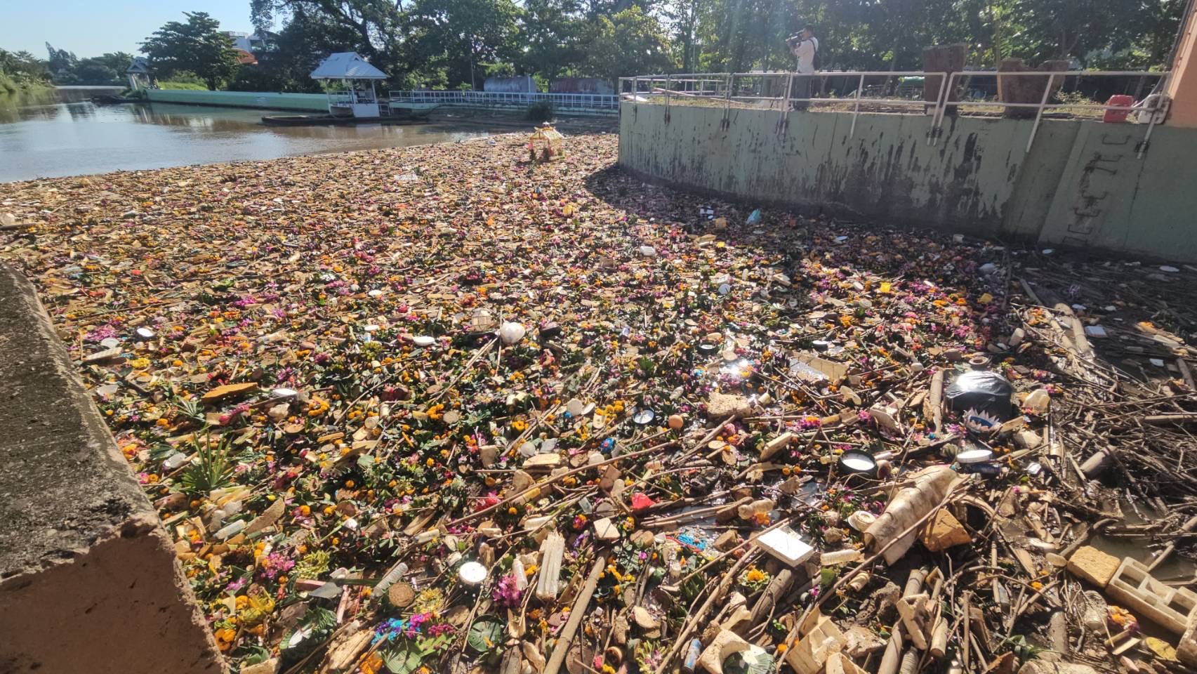 สภาพลำน้ำปิงบริเวณประตูระบายน้ำป่าแดด ต.ป่าแดด อ.เมือง จ.เชียงใหม่ ซึ่งเป็นจุดรวมของกระทงที่ถูกปล่อยลงลำน้ำปิงในช่วงวันที่ 14-15 พ.ย.67 ที่ผ่านมา ส่งผลทำให้ในขณะนี้ที่บริเวณดังกล่าวมีซากกระทงลอยไหลลงมาสะสมเป็นจำมากเช่นเดียวกับในทุกๆปี ที่หลังการจัดงานเทศกาลยี่เป็ง หรือลอยกระทงของจังหวัดเชียงใหม่ กระทงที่ถูกลอยลงน้ำปิงจากหลายพื้นที่จะไหลมารวมกันที่บริเวณจุดนี้ ซึ่งมีกระทงที่ทำจากวัสดุทุกชนิดทั้งจากธรรมชาติ และวัสดุสังเคราะห์ รวมไปถึงวัสดุที่ทำจากโฟมและพลาสติก เพื่อรอดำเนินการเก็บขึ้นจากลำน้ำภายหลังเสร็จสิ้นเทศกาลนี้