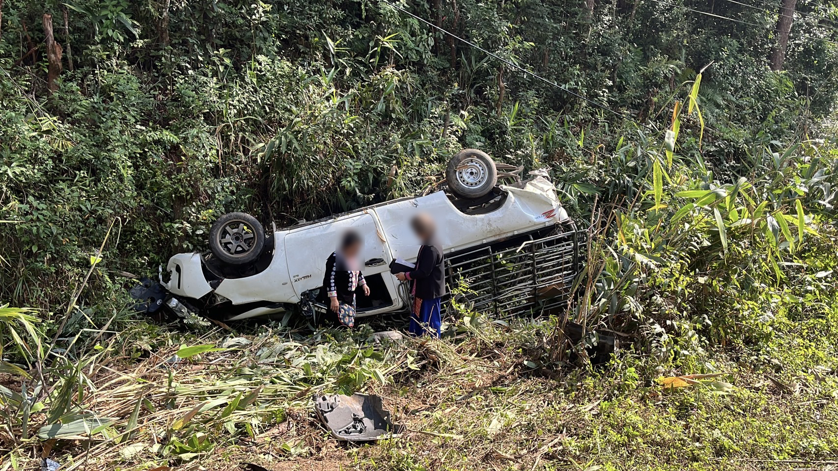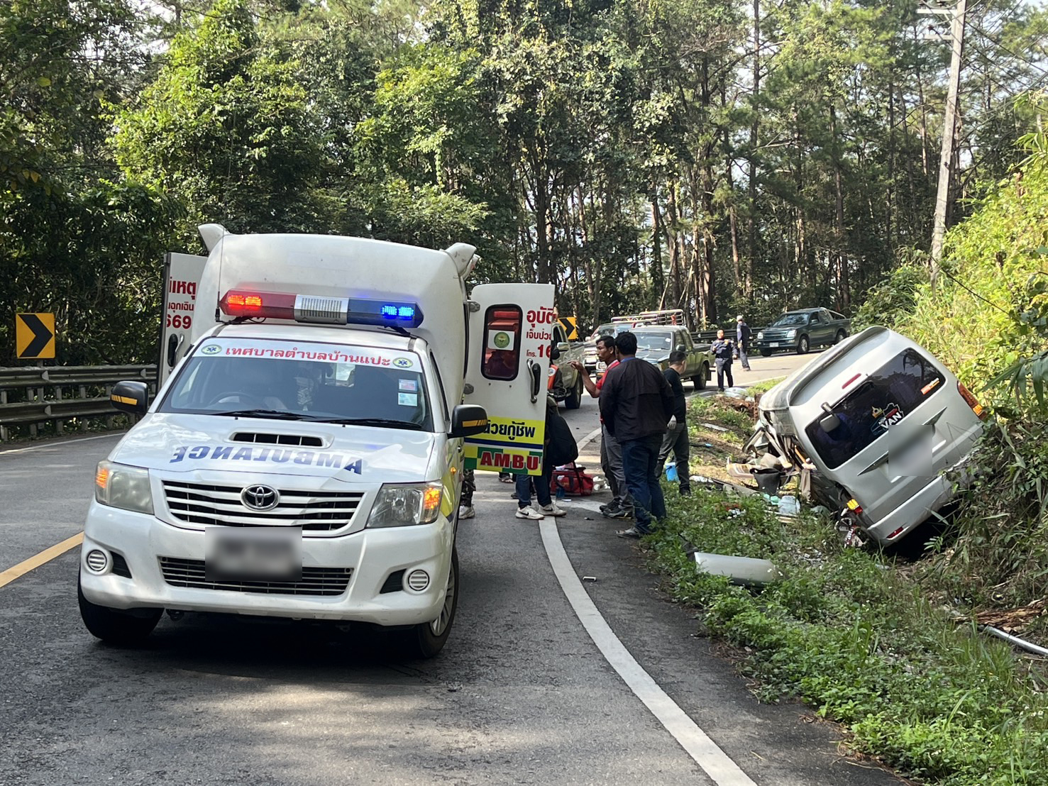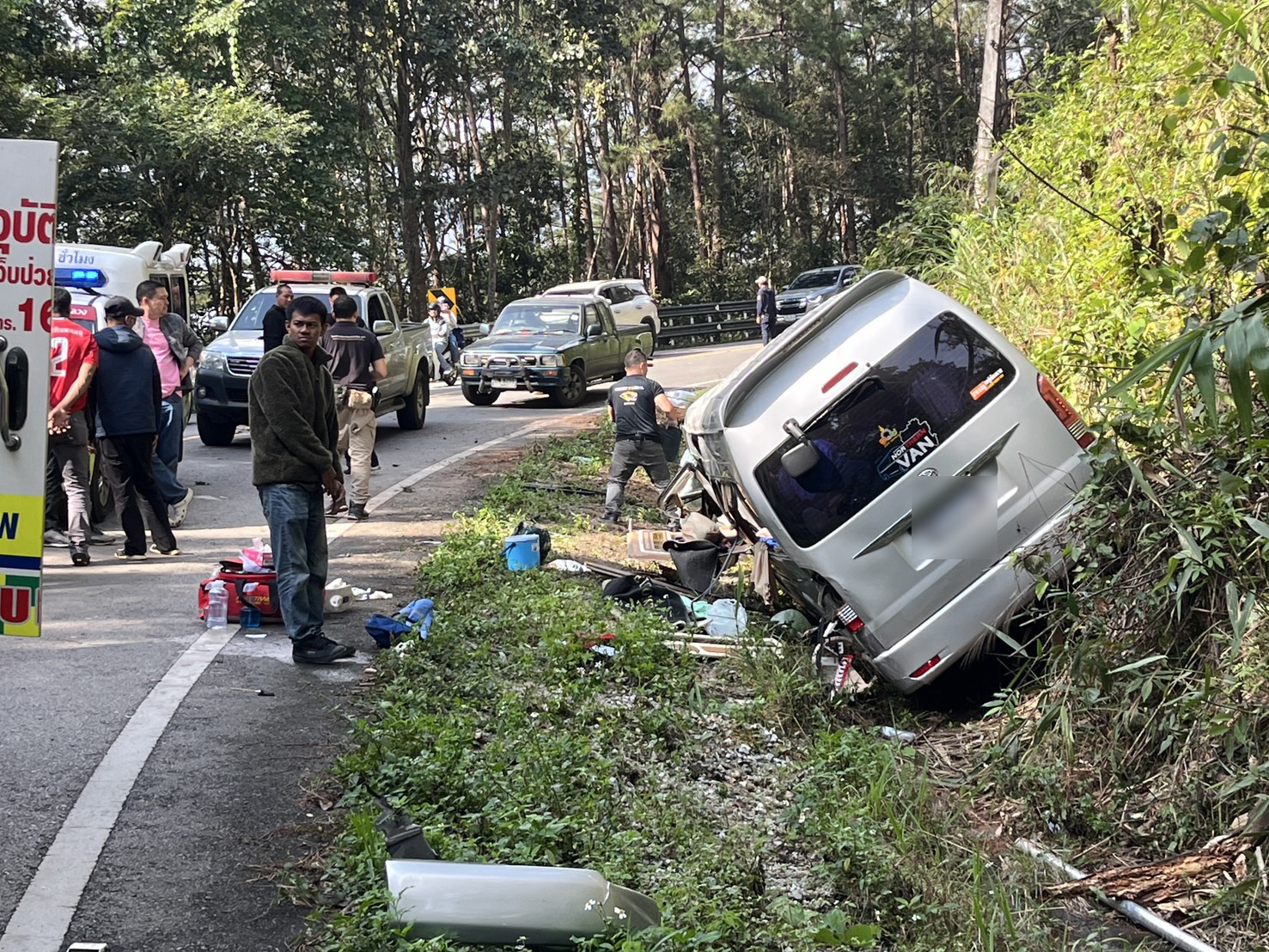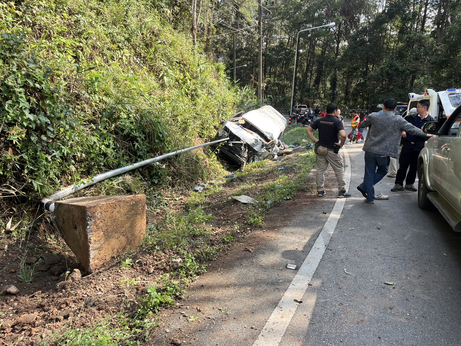ที่เกิดเหตุ รถยนต์ปาเจโร่ สีขาว ทะเบียน พะเยา พังเสียหายทั้งคันจอดกลางถนน ส่วนรถปิคอัพกระบะบรรทุกเสริมข้าง (คอก) สีขาว ทะเบียน พุ่งไปข้างทางขาลงดอยซ้ายมือของถนน สภาพหงายท้อง และรถตู้สีขาว ทะเบียน พะเยา พุ่งลงไปข้างถนนสภาพรถหันหัวรถขึ้นดอยอินทนนท์ สภาพพังยับเยิน