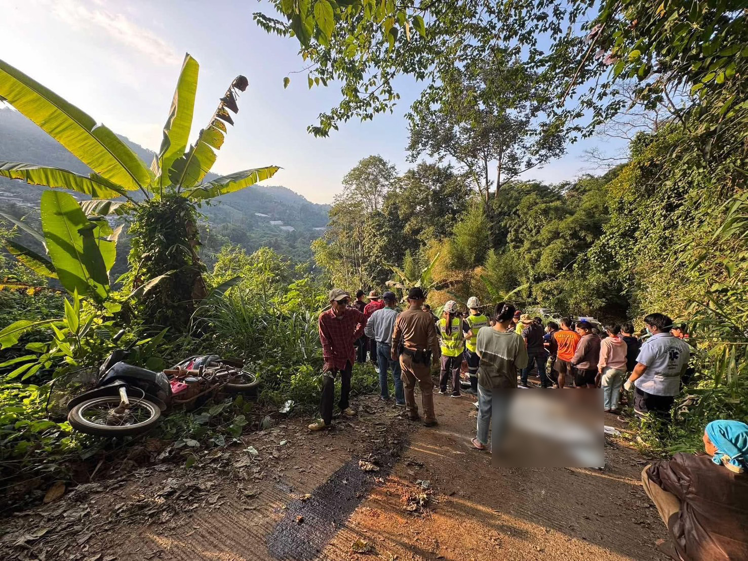 โดยในบริเวณจุดเกิดเหตุพบรถยนต์สีเทา (ยังไม่ทราบหมายเลขทะเบียน) สภาพพลิกคว่ำตกลงไปบริเวณเหวริมทาง นอกจากนี้ยังมีรถจักรยานยนต์ล้มอยู่ตรงจุดทีีรถยนต์พุ่งตกลงไป นอกจากนี้มีรายงานแจ้งว่ามีผู้ได้รับบาดเจ็บเล็กน้อยรวม 11 ราย และมีคนติดภายในรถยนต์ 1 ราย อีกทั้งยังมีผู้เสียชีวิตแล้ว 1 ราย โดยผู้ประสบเหตุเป็นชาวบ้านในพื้นที่บ้านม่วงคำทั้งหมด