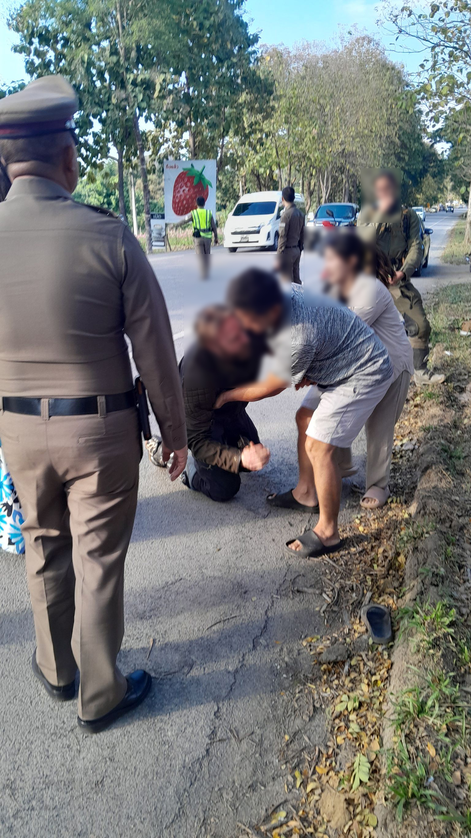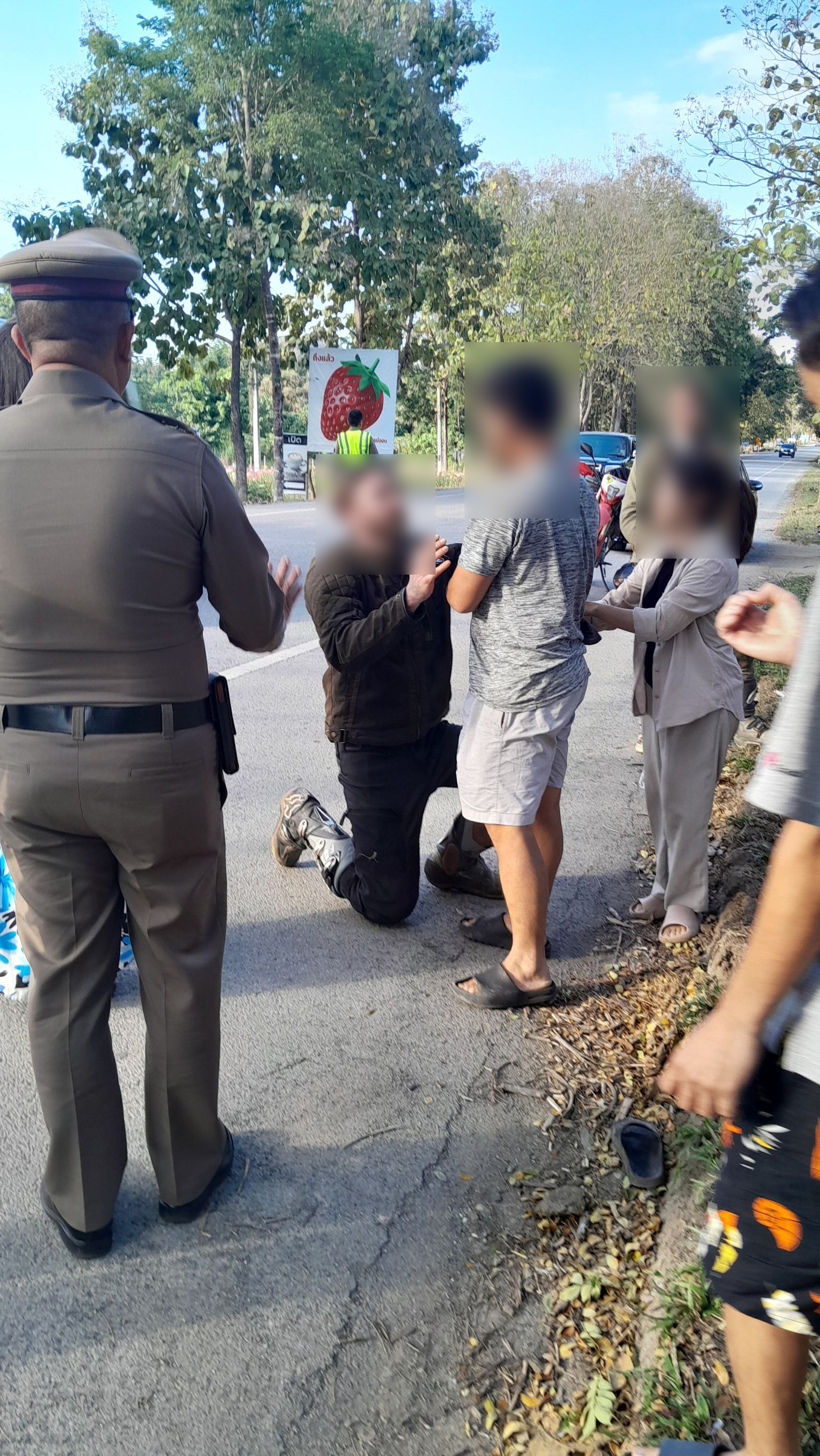 ขณะเดียวเดียวผู้ขับขี่ชายชาวอเมริกัน ได้คุกเข่าขอโทษกับญาติผู้บาดเจ็บ (เสียชีวิตที่ รพ ) พร้อมกันนั้นทางพนักงานสอบสวนได้เชิญทั้ง 2 ฝ่ายไปให้ปากคำที่โรงพักเพื่อดำเนินการกันต่อไป