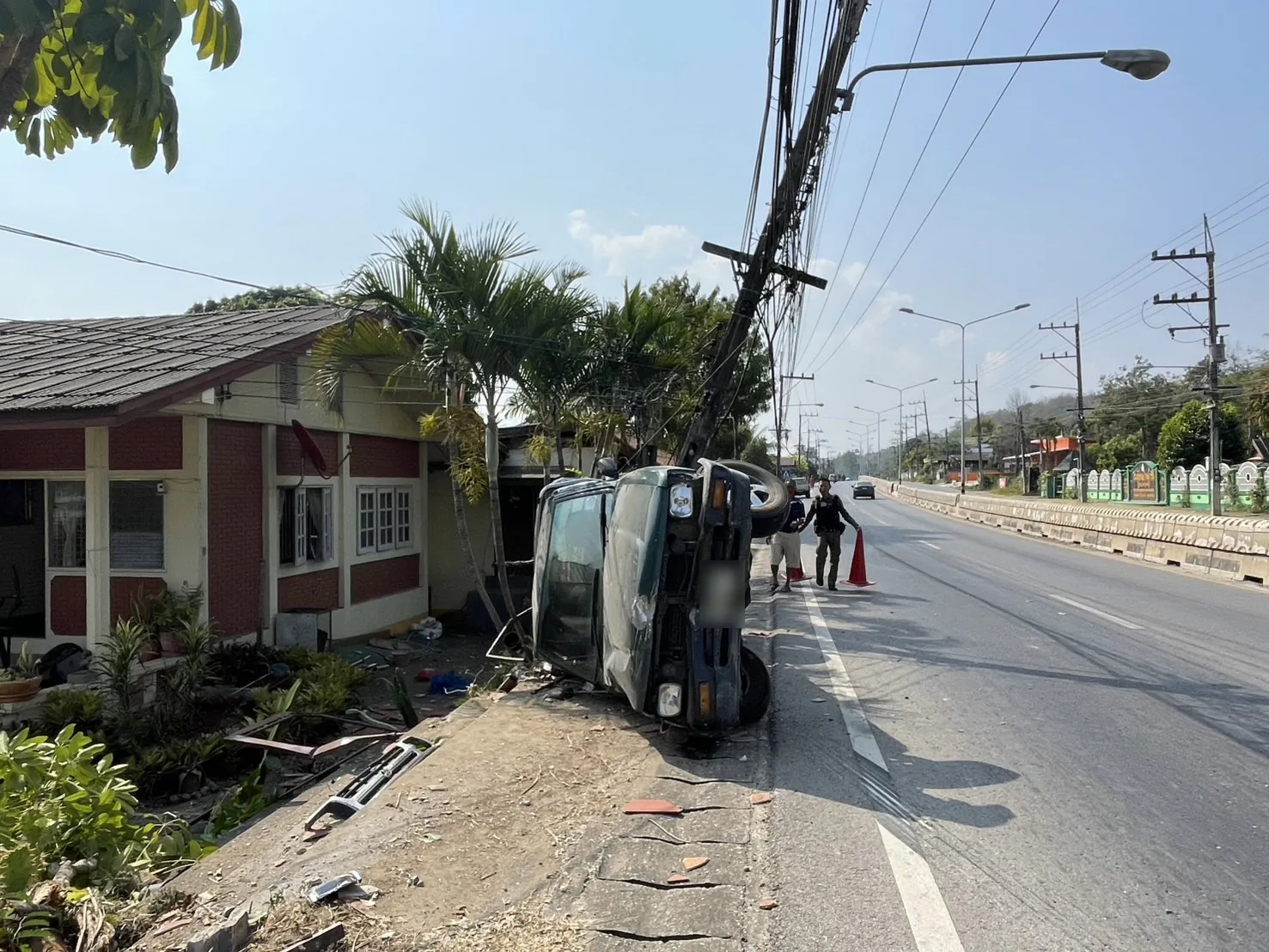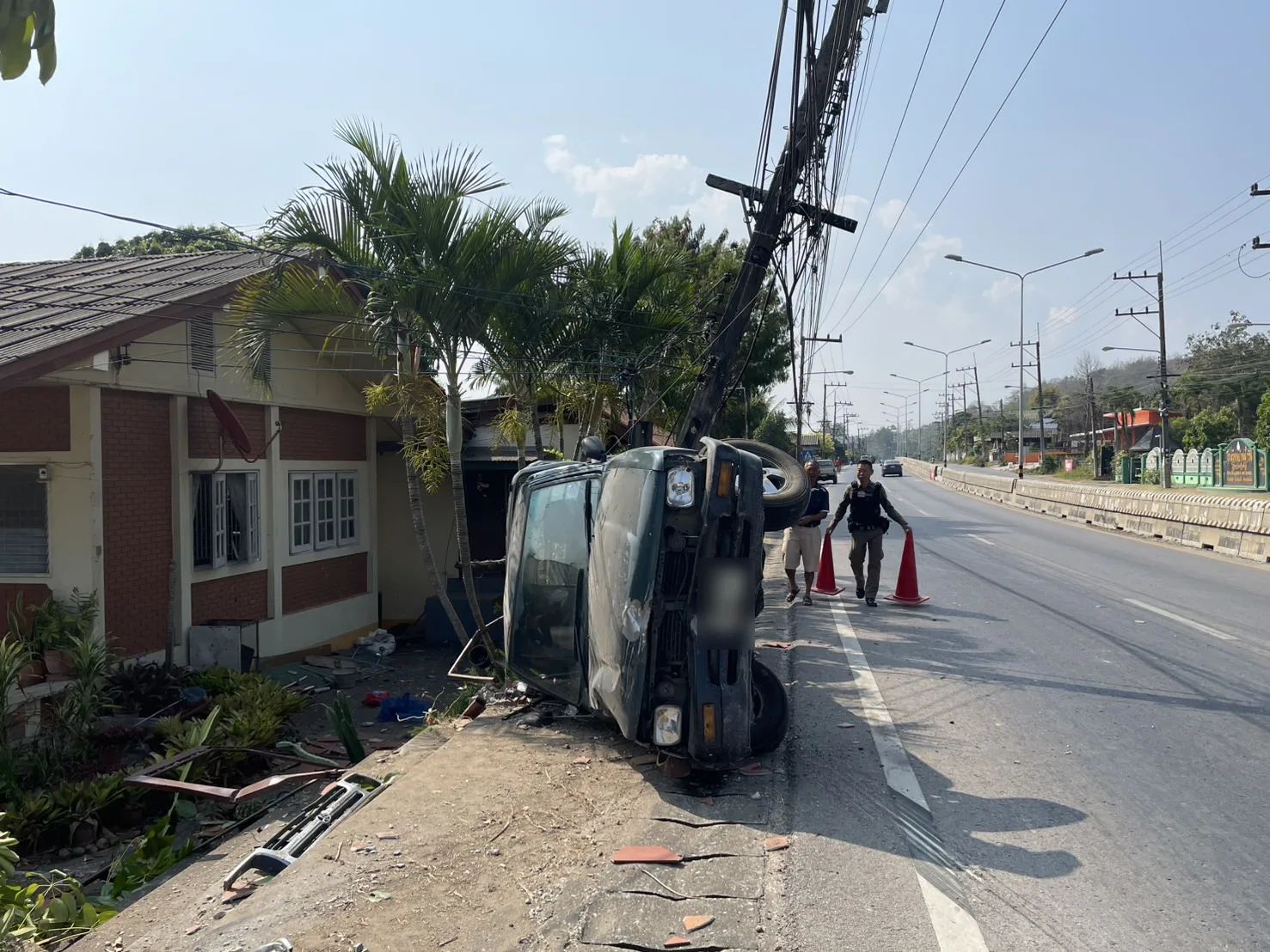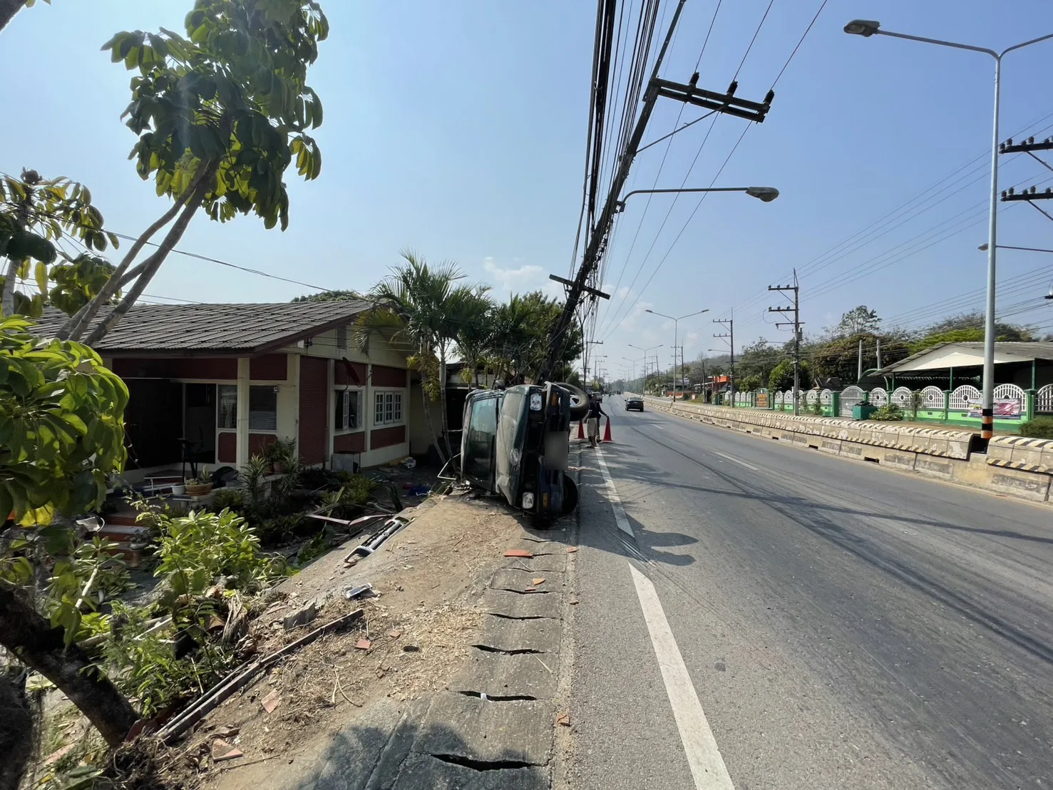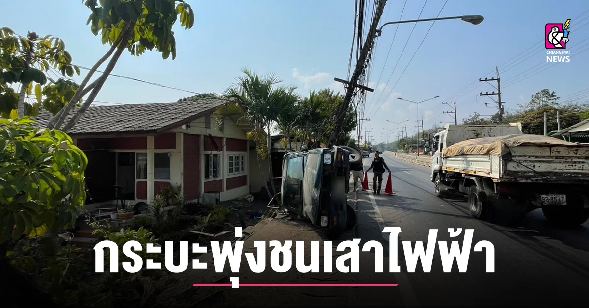 (เชียงใหม่) – เกิดอุบัติเหตุรถกระบะสี่ล้อพุ่งชนเสาไฟฟ้าบริเวณถนนแม่ริม-เชียงใหม่-ฝาง ฝั่งตรงข้ามกับโรงเรียนบ้านน้ำริน ส่งผลให้เสาไฟฟ้าหักลงมากีดขวางถนน ขณะที่บริเวณโดยรอบมีคราบน้ำมัน เศษวัสดุจากตัวรถ และรั้วบ้านของประชาชนได้รับความเสียหาย