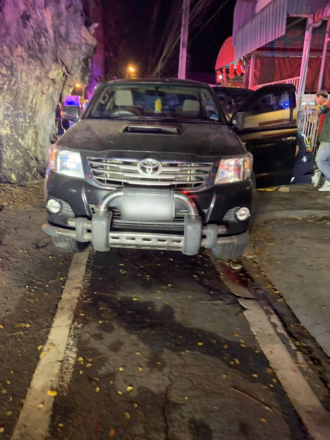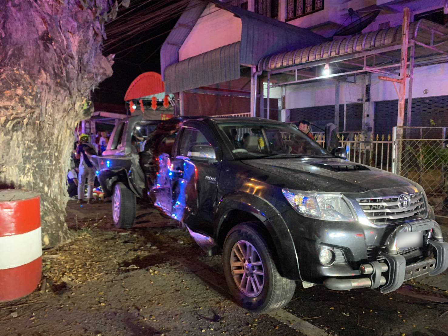 ทั้งนี้พนักงานสอบสวน สภ.สันกำแพง ได้รับแจ้งจากศูนย์วิทยุ สภ.สันกำแพง ว่ามีอุบัติเหตุรถยนต์เฉี่ยวชนกับต้นไม้จามจุรี(ฉำฉา) จึงได้เดินทางมาตรวจสถานที่เกิดเหตุ พบรถยนต์กระบะยี่ห้อ toyota สี่ประตู สีดำ ทะเบียน เชียงใหม่ สภาพเฉี่ยวชนต้นไม้จามจุรี(ฉำฉา)ด้านข้างขวายุบพังยับ และมีถังสะท้อนแสงขนาด 200 ลิตรที่ตั้งไว้ใต้ต้นไม้จามจุรี(ฉำฉา) ได้รับความเสียหายจำนวน 2 ใบ