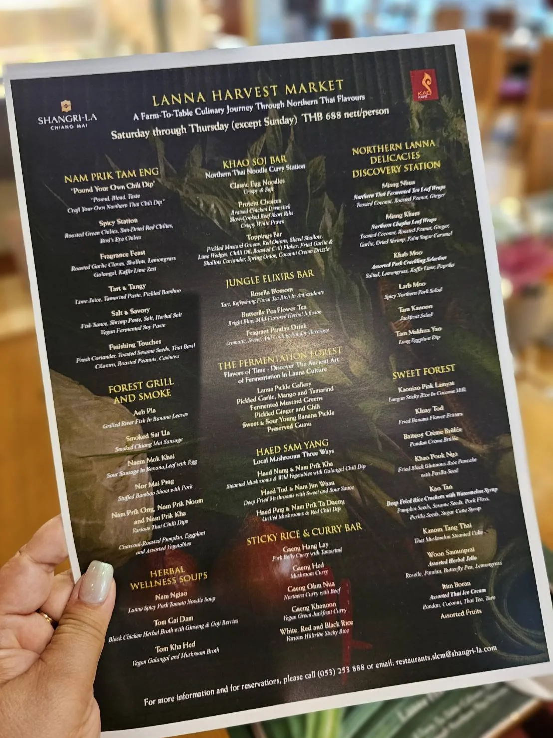 โรงแรมแชงกรี-ลา เชียงใหม่จัดโปรโมชั่น Lanna Harvest Market บุฟเฟ่ต์อาหารล้านนา ในบรรยากาศจำลองของ กาดในภาคเหนือ โดยให้บริการอาหารเหนือที่ใช้วัตถุดิบจากท้องถิ่นหลายหลายเมนู ทั้งยังมีมุมน้ำพริกตำเองให้ลูกค้าได้ตำน้ำพริกกันสดๆ รวมถึงเมนูขนมหวานมากมาย ทั้งนี้ทางโรงแรมฯจึงขอความกรุณาท่านที่จะช่วยประสัมพันธ์โปรโมชั่นดังกล่าวตามภาพและรายละเอีดที่แนบมานี้