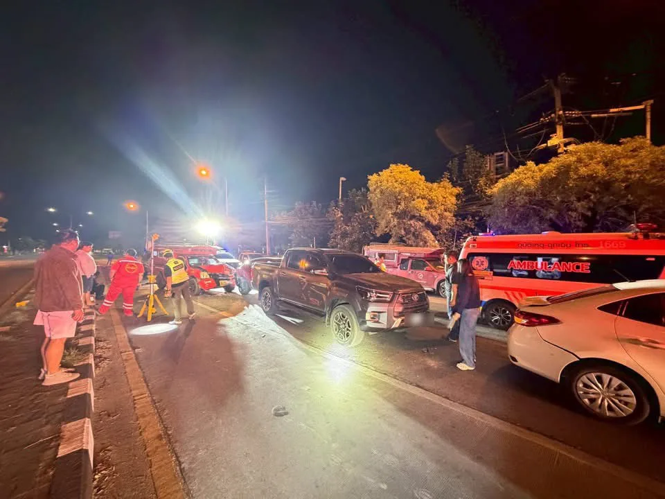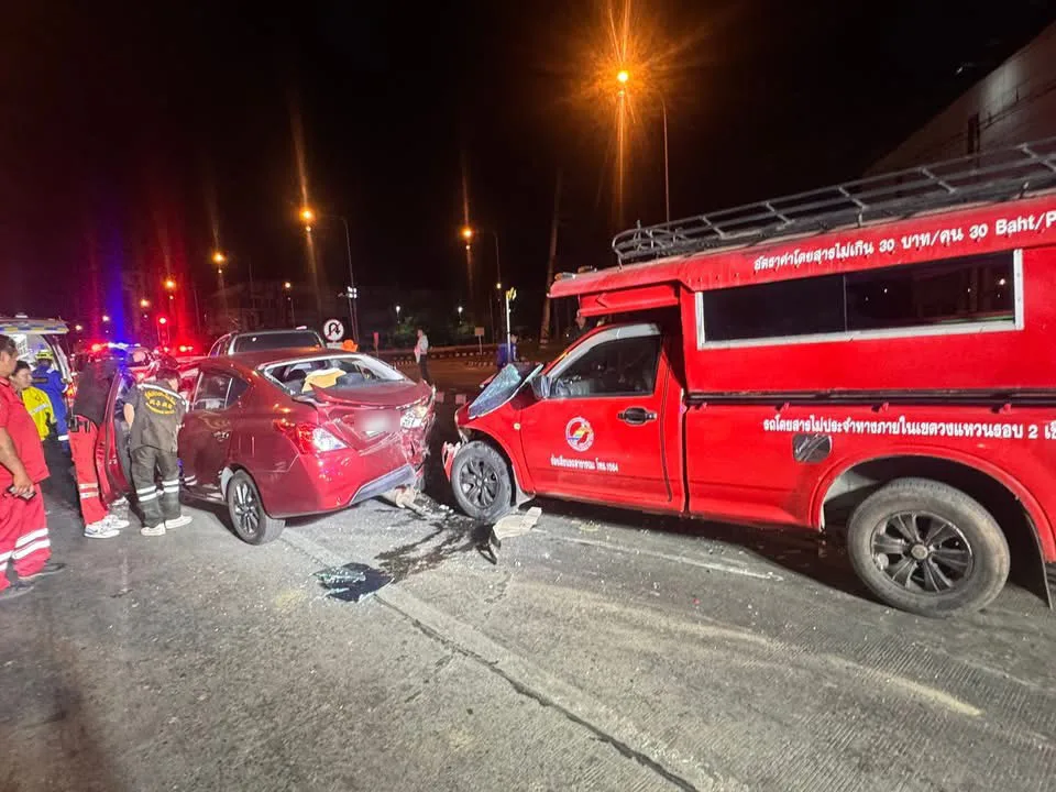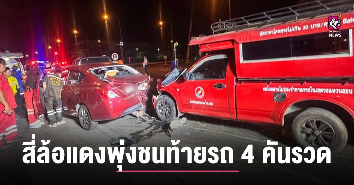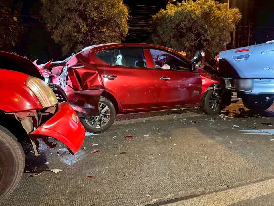ที่เกิดเหตุพบรถยนต์ชนท้ายต่อเนื่องกัน รวม 4 คัน โดยคันต้นเหตุเป็น รถแดง พุ่งชนรถที่กำลังจอดติดสัญญาณไฟแดงอย่างแรง ส่งผลให้รถที่จอดอยู่ได้รับความเสียหายหลายคัน