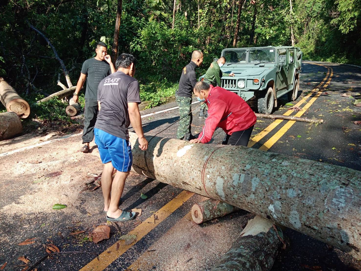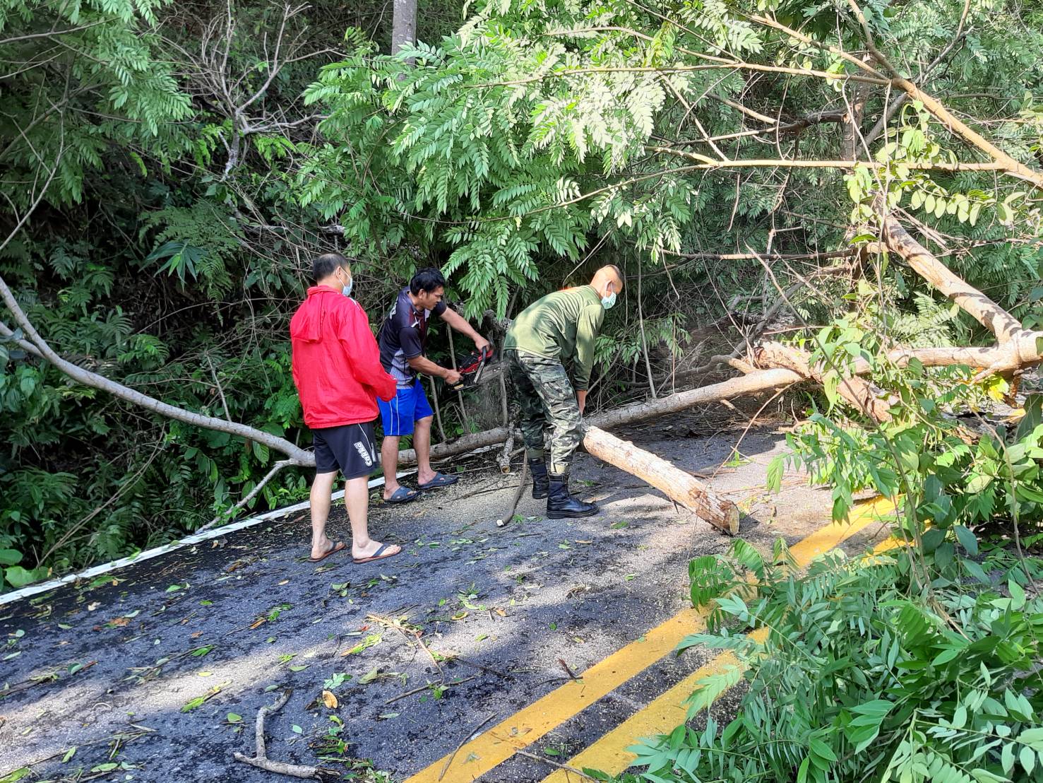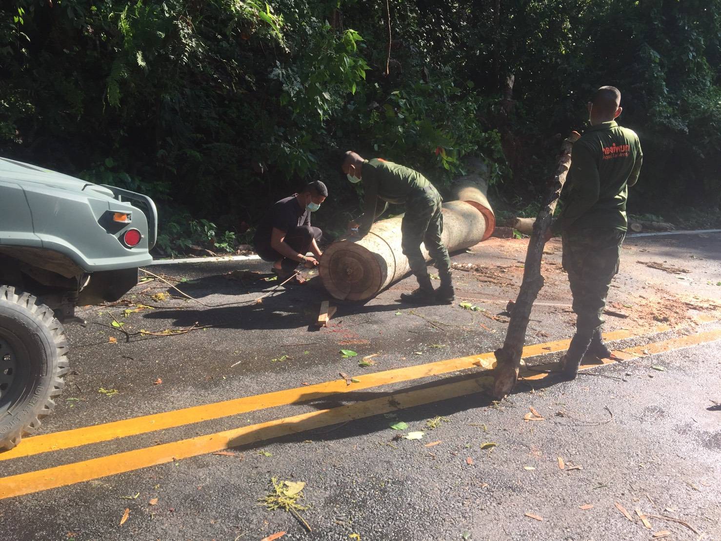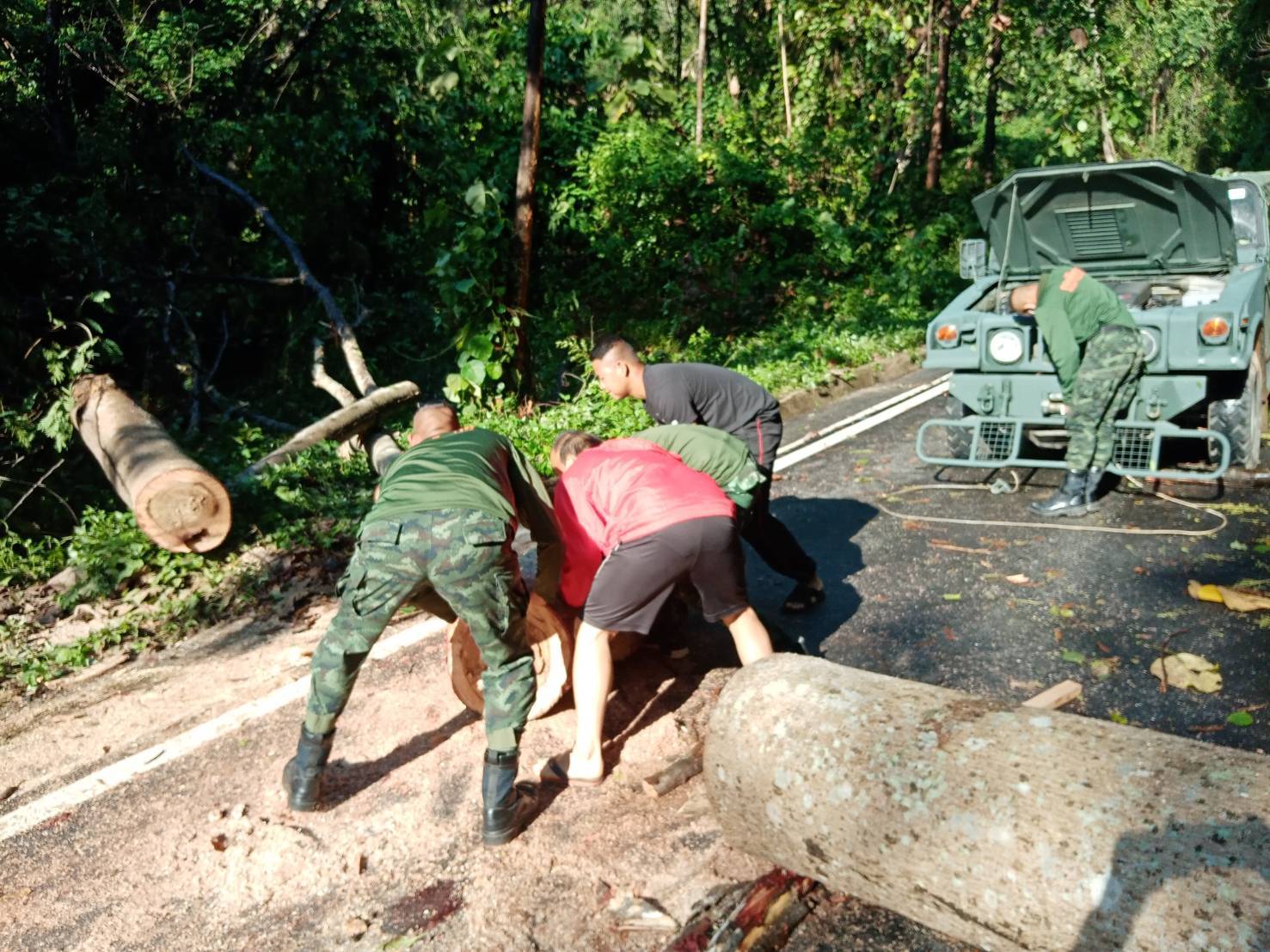 โดยจุดที่ต้นไม้ล้มขวางถนนเป็นเส้นทางจากบ้านสายลมจอย ไปด่านตรวจป่าสัก ซึ่งเป็นเส้นทางลัดเลาะตามชายแดน โดยทางเจ้าหน้าที่ทหารจากกองร้อยทหารม้าที่ 3 บก.ควบคุมที่ 2 หน่วยเฉพาะกิจกรมทหารม้าที่ 3 กองกำลังผาเมือง ภายใต้การอำนวยการของ พ.อ.สัมฤทธิ์ ฉัตรวัฒนาสกุล ผู้บังคับกรมทหารม้าที่ 3 กองกำลังผาเมือง ได้นำกำลังเครื่องมือ ร่วมกับชาวบ้าน ฝ่ายปกครอง ทำการเปิดเส้นทางเพื่อให้สัญจรไปมาได้ตามปกติ