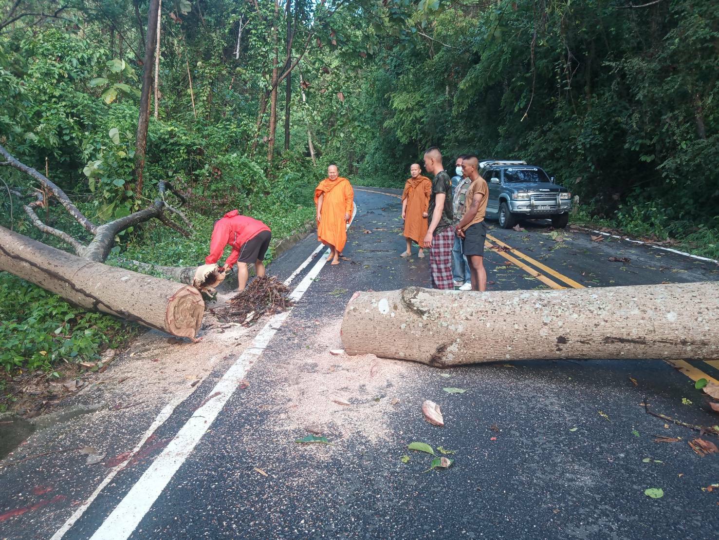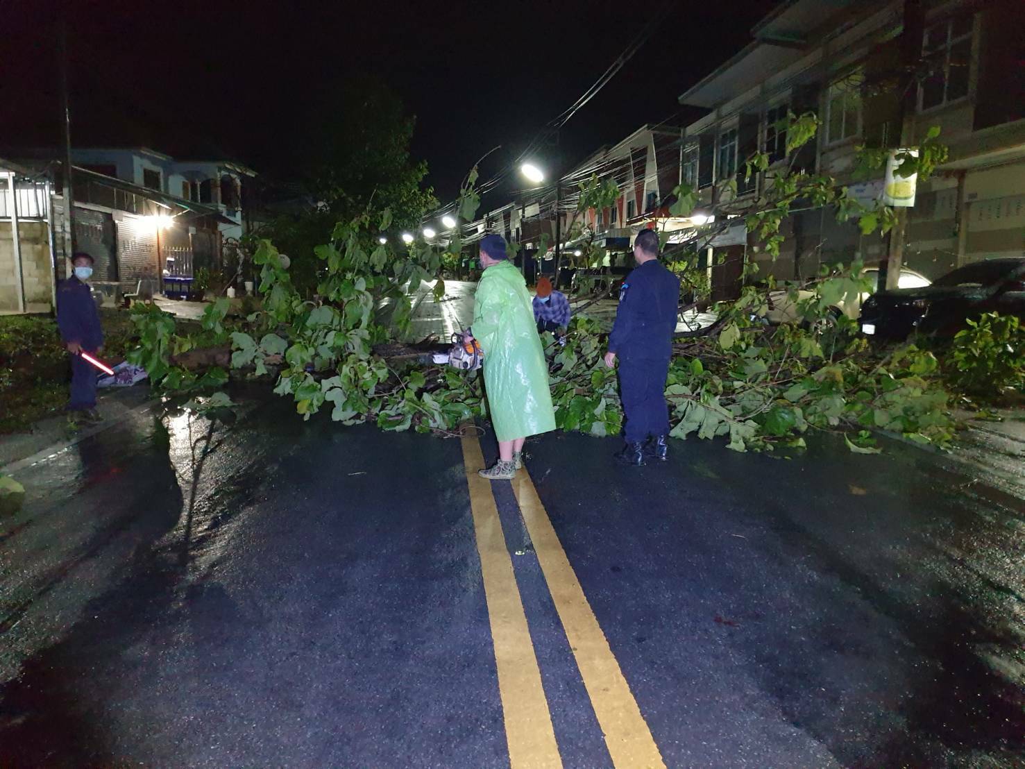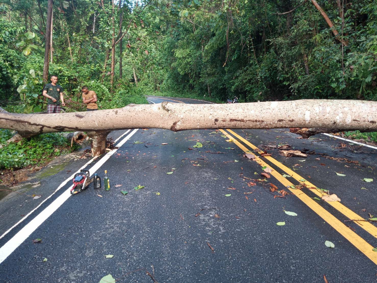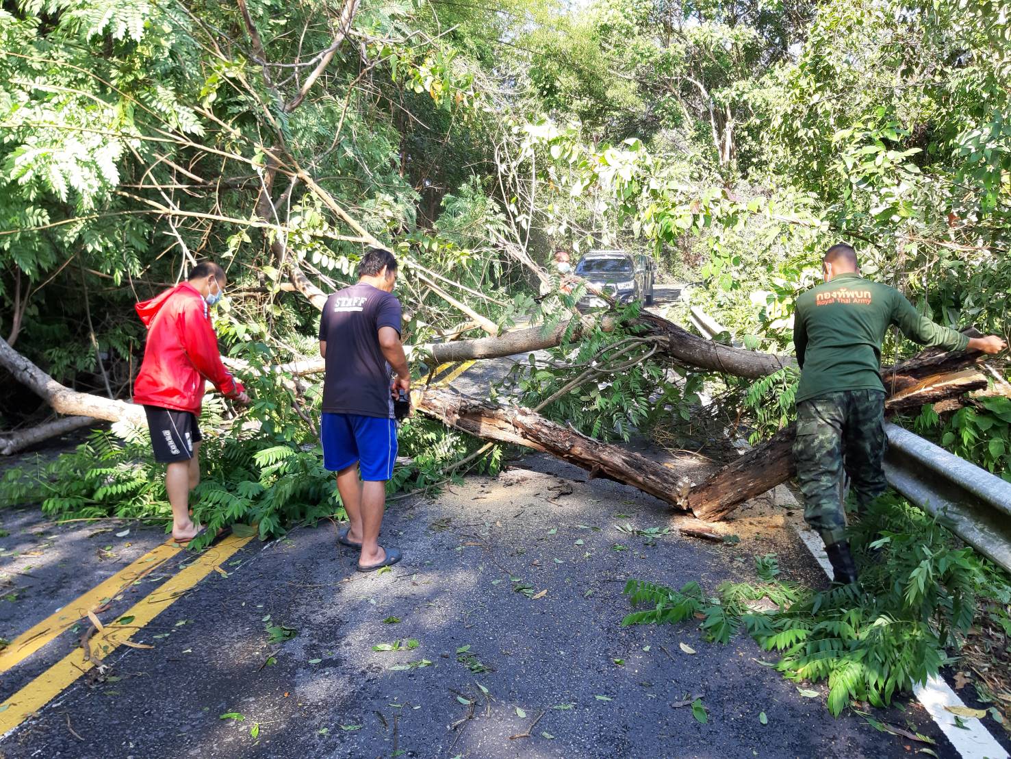 โดยจุดที่ต้นไม้ล้มขวางถนนเป็นเส้นทางจากบ้านสายลมจอย ไปด่านตรวจป่าสัก ซึ่งเป็นเส้นทางลัดเลาะตามชายแดน โดยทางเจ้าหน้าที่ทหารจากกองร้อยทหารม้าที่ 3 บก.ควบคุมที่ 2 หน่วยเฉพาะกิจกรมทหารม้าที่ 3 กองกำลังผาเมือง ภายใต้การอำนวยการของ พ.อ.สัมฤทธิ์ ฉัตรวัฒนาสกุล ผู้บังคับกรมทหารม้าที่ 3 กองกำลังผาเมือง ได้นำกำลังเครื่องมือ ร่วมกับชาวบ้าน ฝ่ายปกครอง ทำการเปิดเส้นทางเพื่อให้สัญจรไปมาได้ตามปกติ