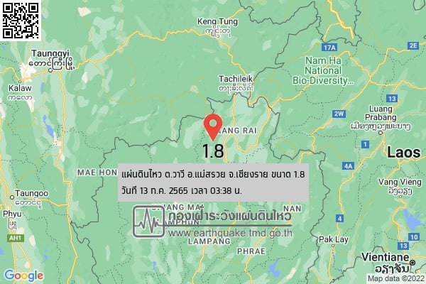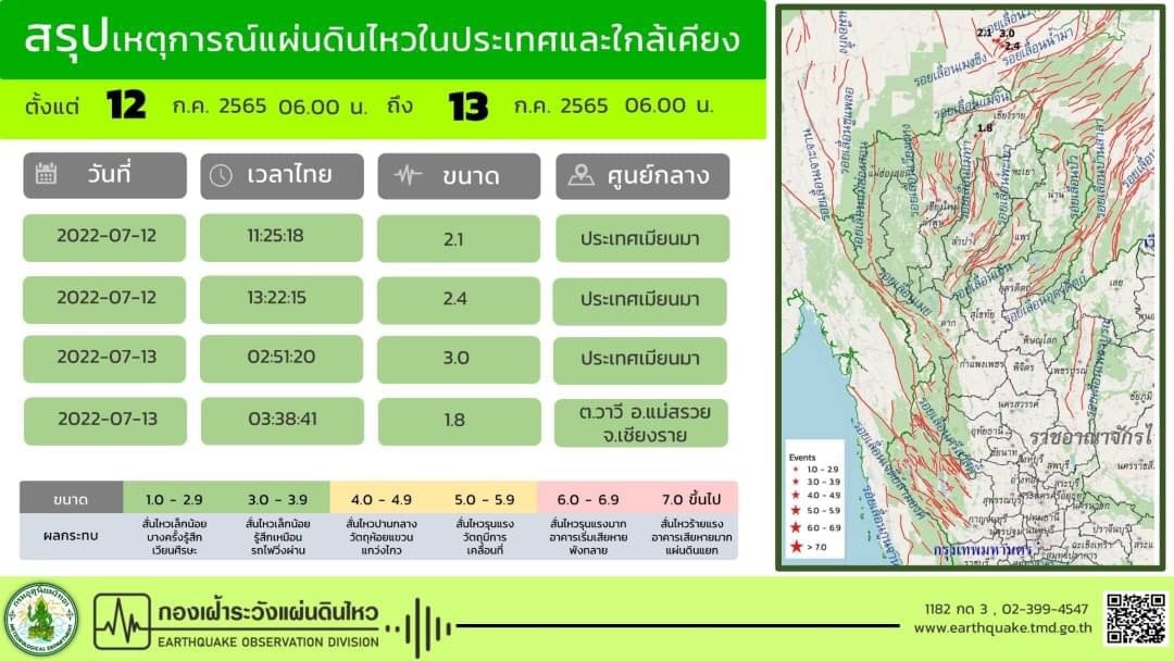สถานการณ์แผ่นดินไหวในช่วง (12-13 ก.ค. 65) : ตรวจพบเหตุการณ์แผ่นดินไหว ขนาด 2.1, 2.4 และ 3.0 มีศูนย์กลางอยู่ที่ประเทศเมียนมา และขนาด 1.8 มีศูนย์กลางอยู่ที่ ต.วาวี อ.แม่สรวย จ.เชียงราย ไม่มีผล
