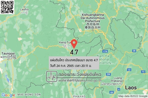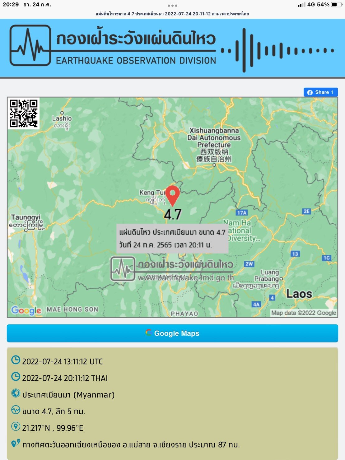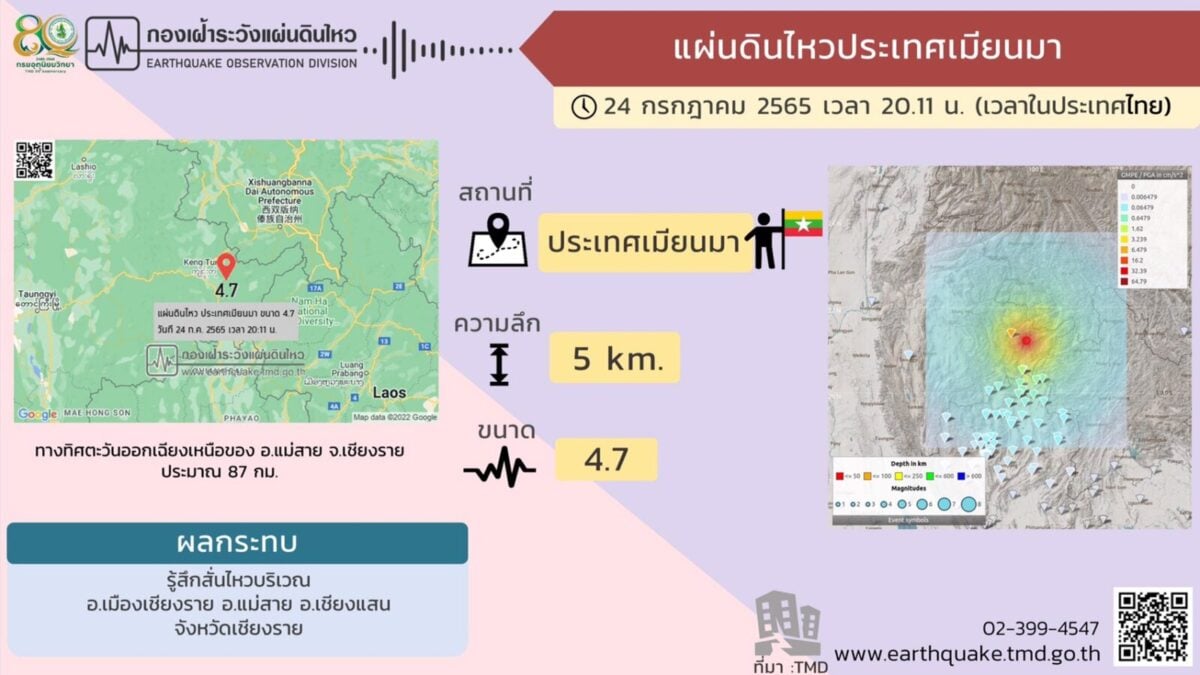 แผ่นดินไหว ประเทศเมียนมา(21.22°N,99.96°E) ขนาด 4.7 ลึก 5 กม. วันที่ 24 ก.ค. 2565 เวลา 20:11 น. [TMD] ทางทิศตะวันออกเฉียงเหนือของ อ.แม่สาย จ.เชียงราย ประมาณ 87 กม. ได้รับแจ้งรู้สึกสั่นไหวบริเวณ จ.เชียงราย