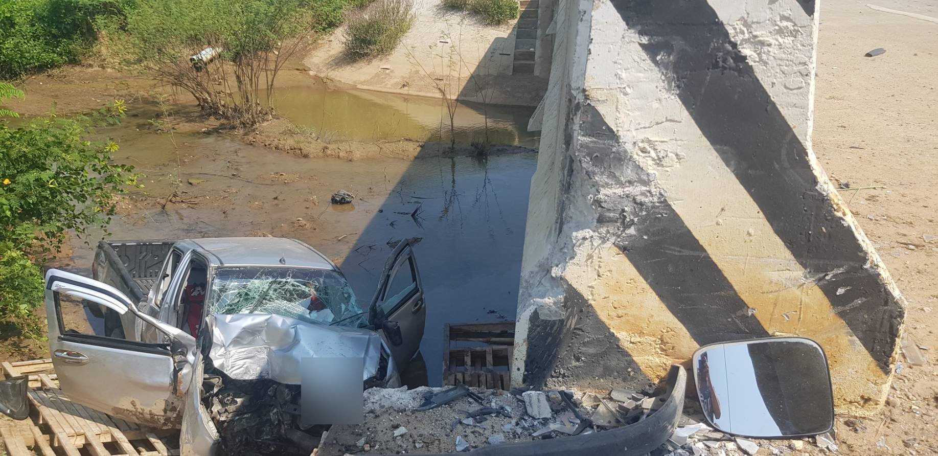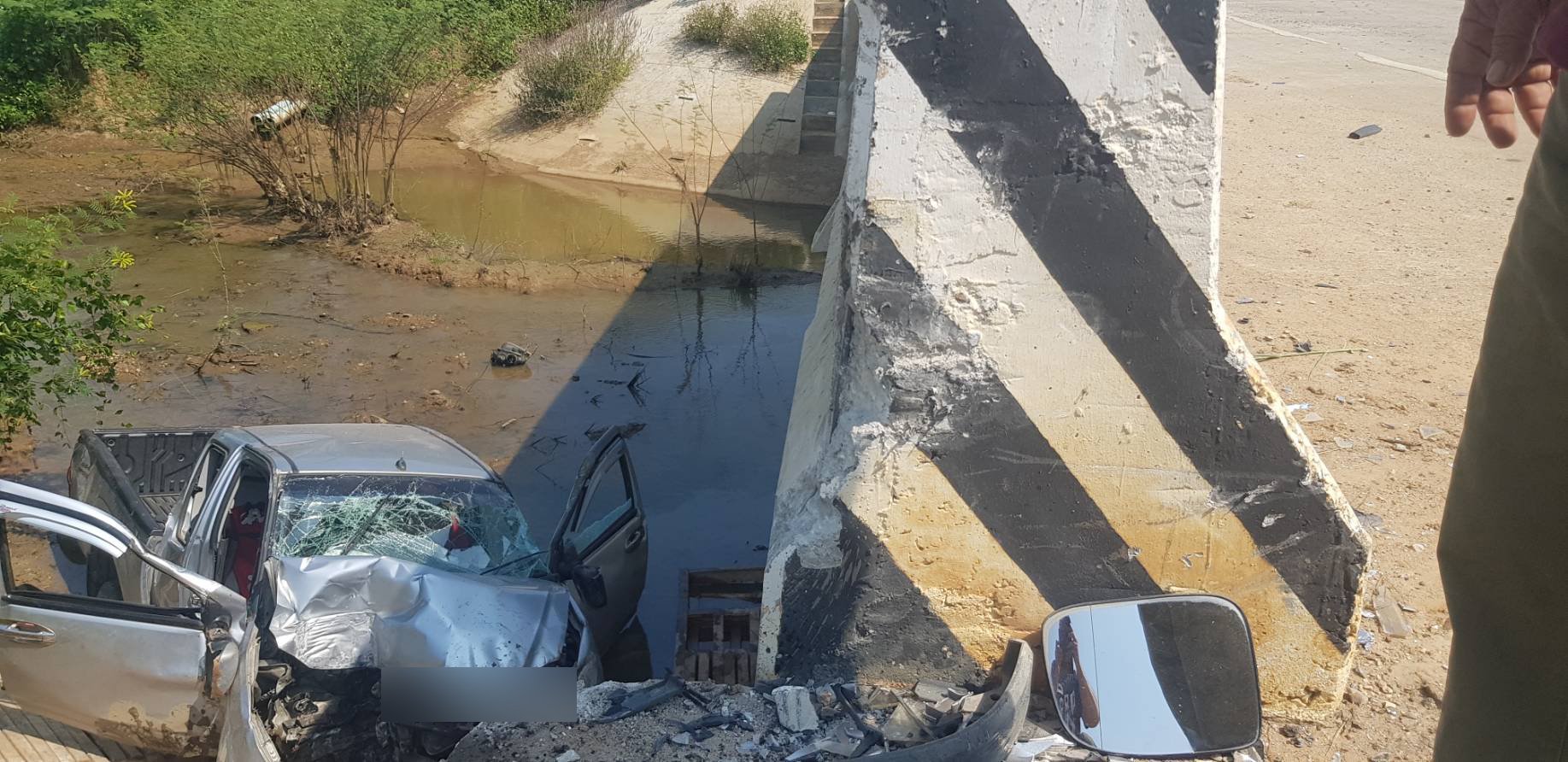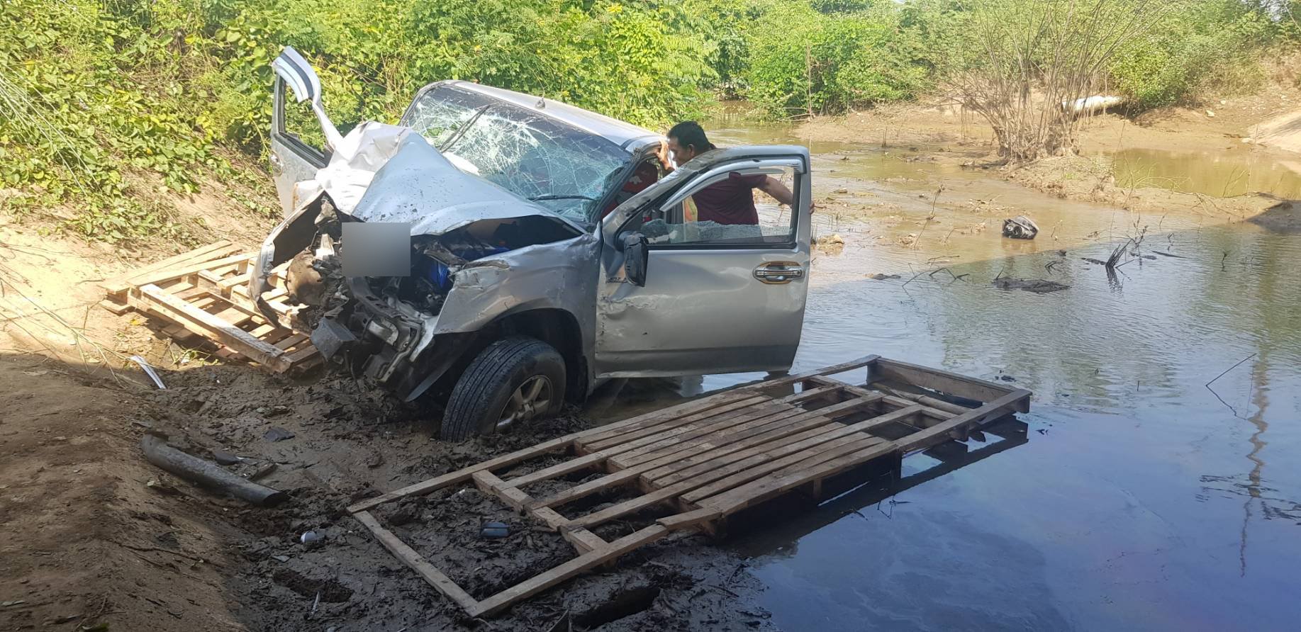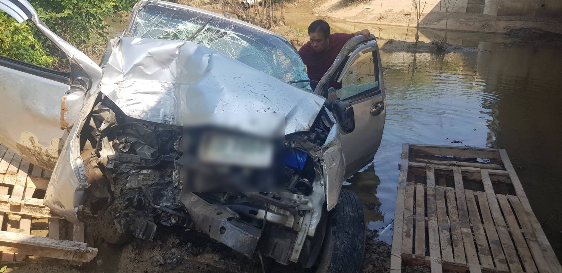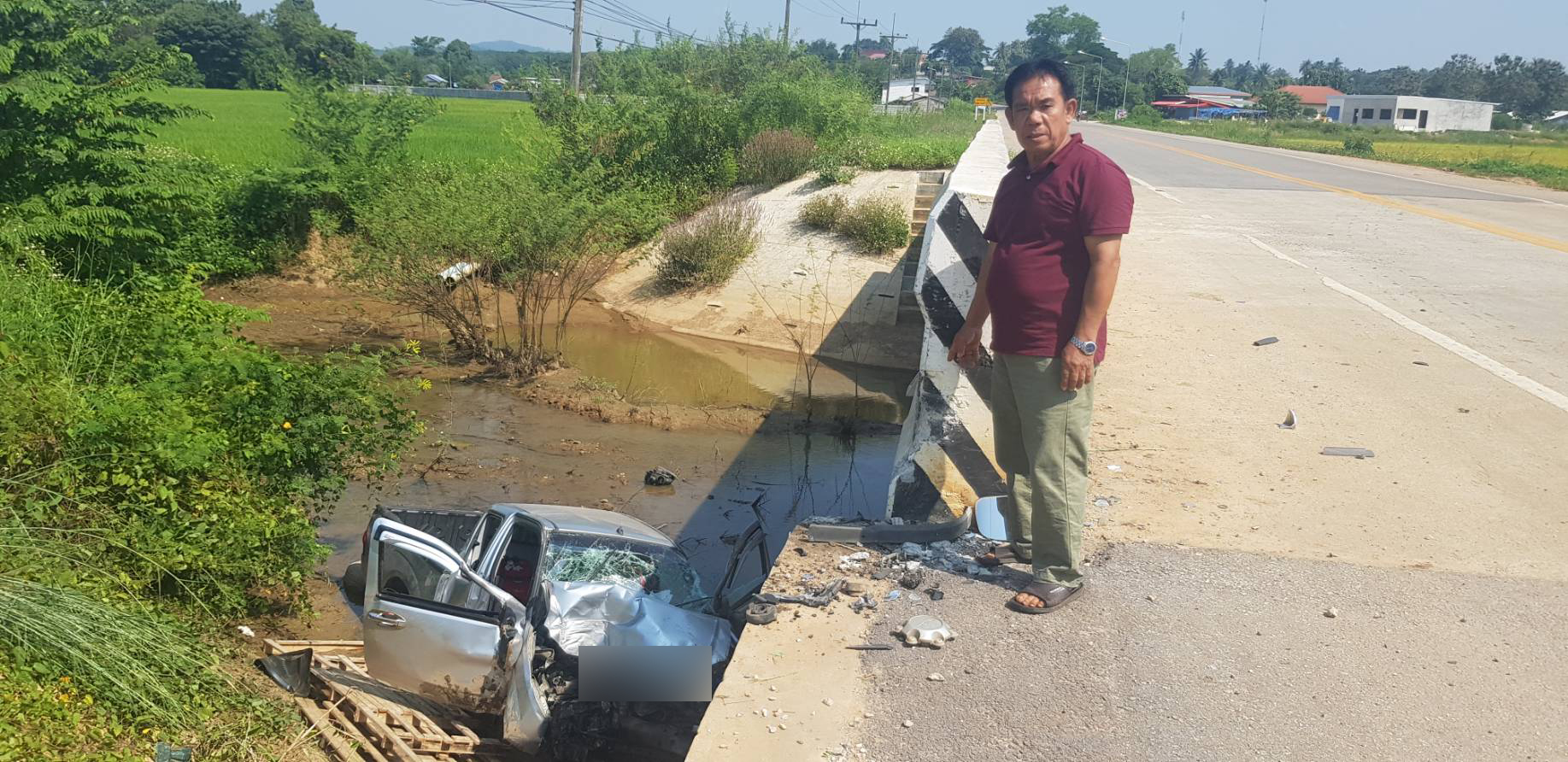 คนขับกระบะวูบหลับในชนคอสะพาน รถกระเด็นตกคลอง ได้รับบาดเจ็บ