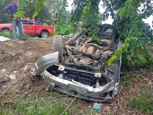กระบะถูกชนท้ายพุ่งลงข้างทาง หงายท้องชี้ฟ้า คนขับและผู้โดยสารปลอดภัย เชื่อบารมีเหรียญ “ครูบาคำหล้า” พาพ้นภัย!