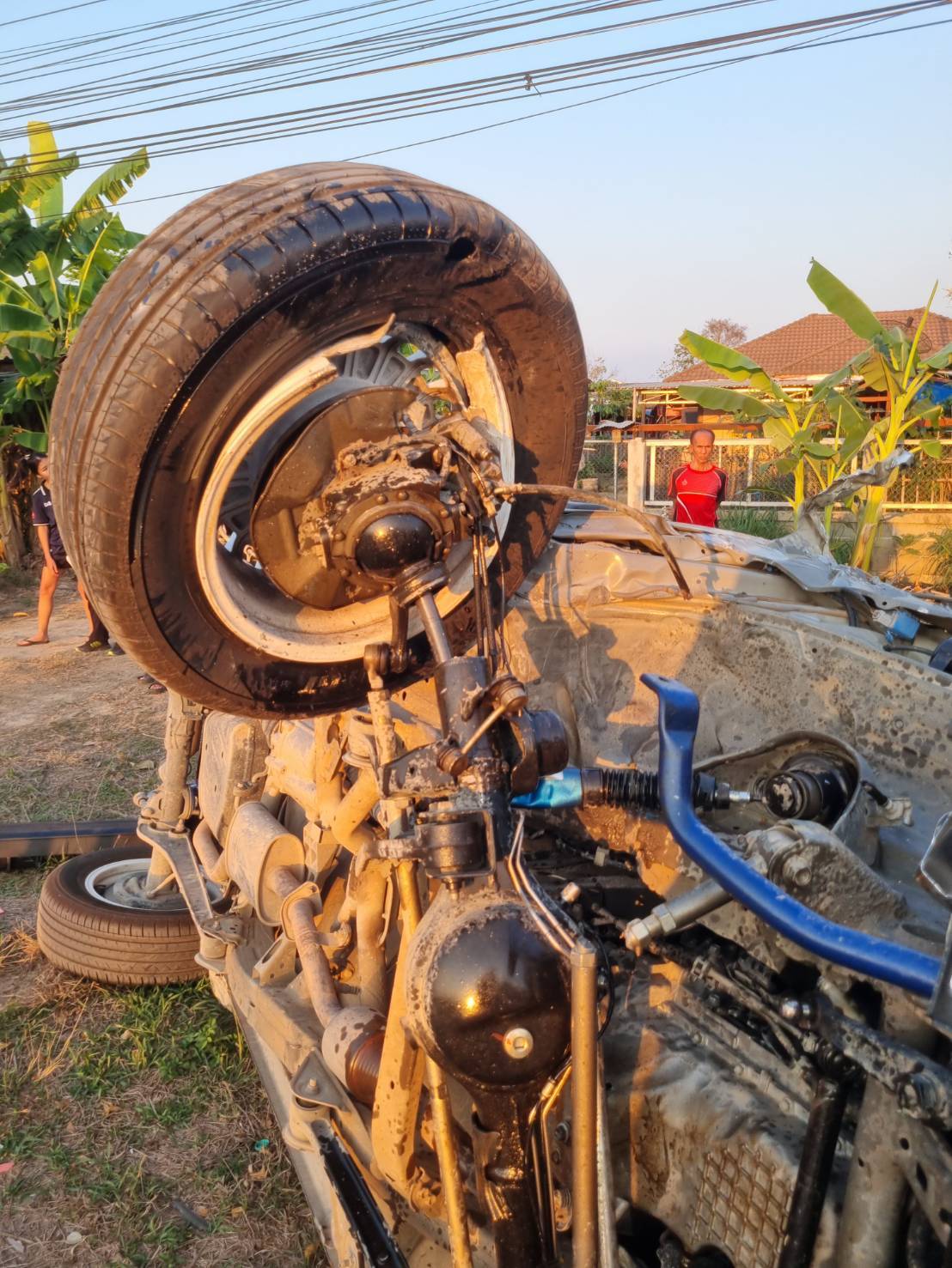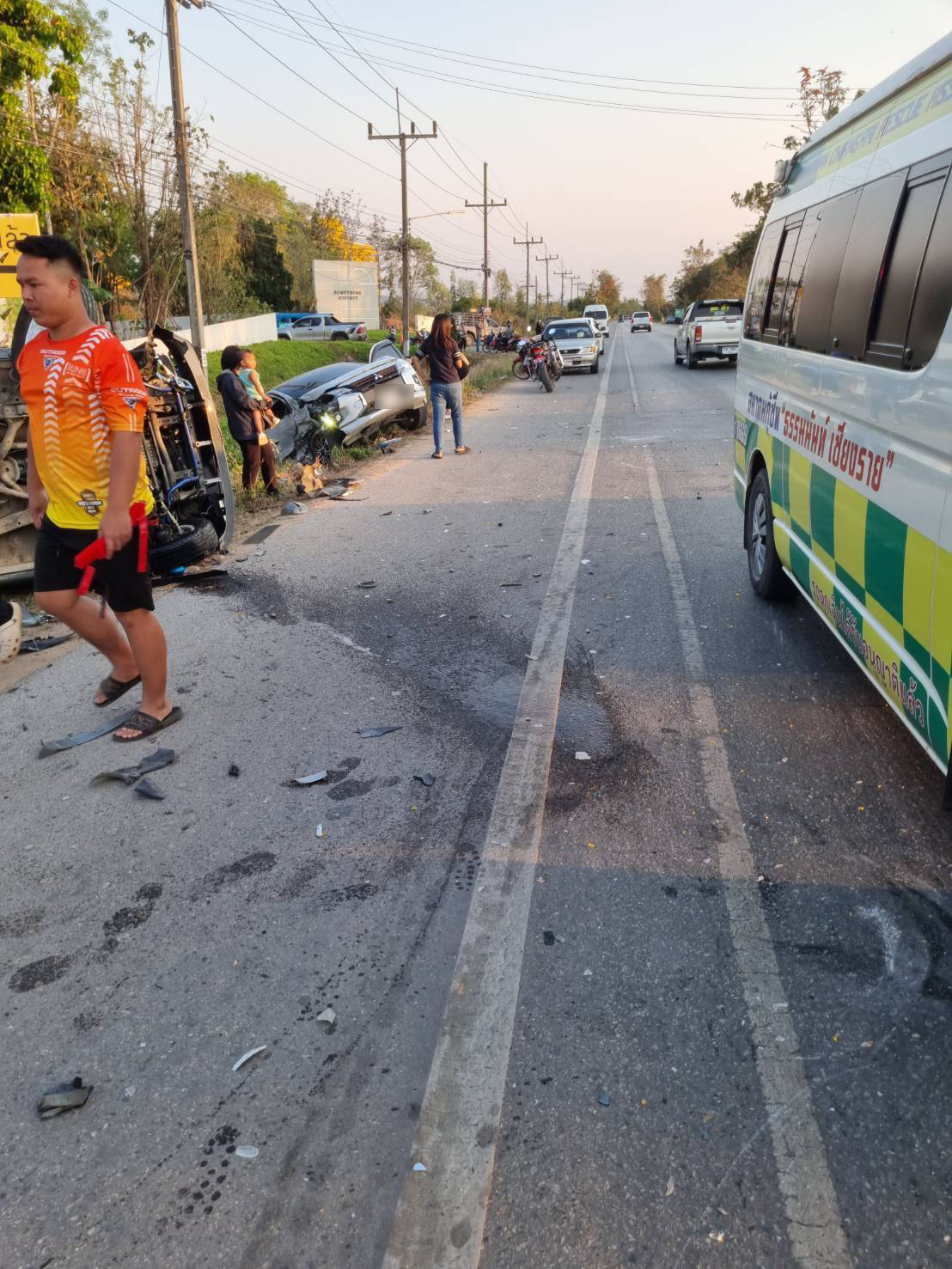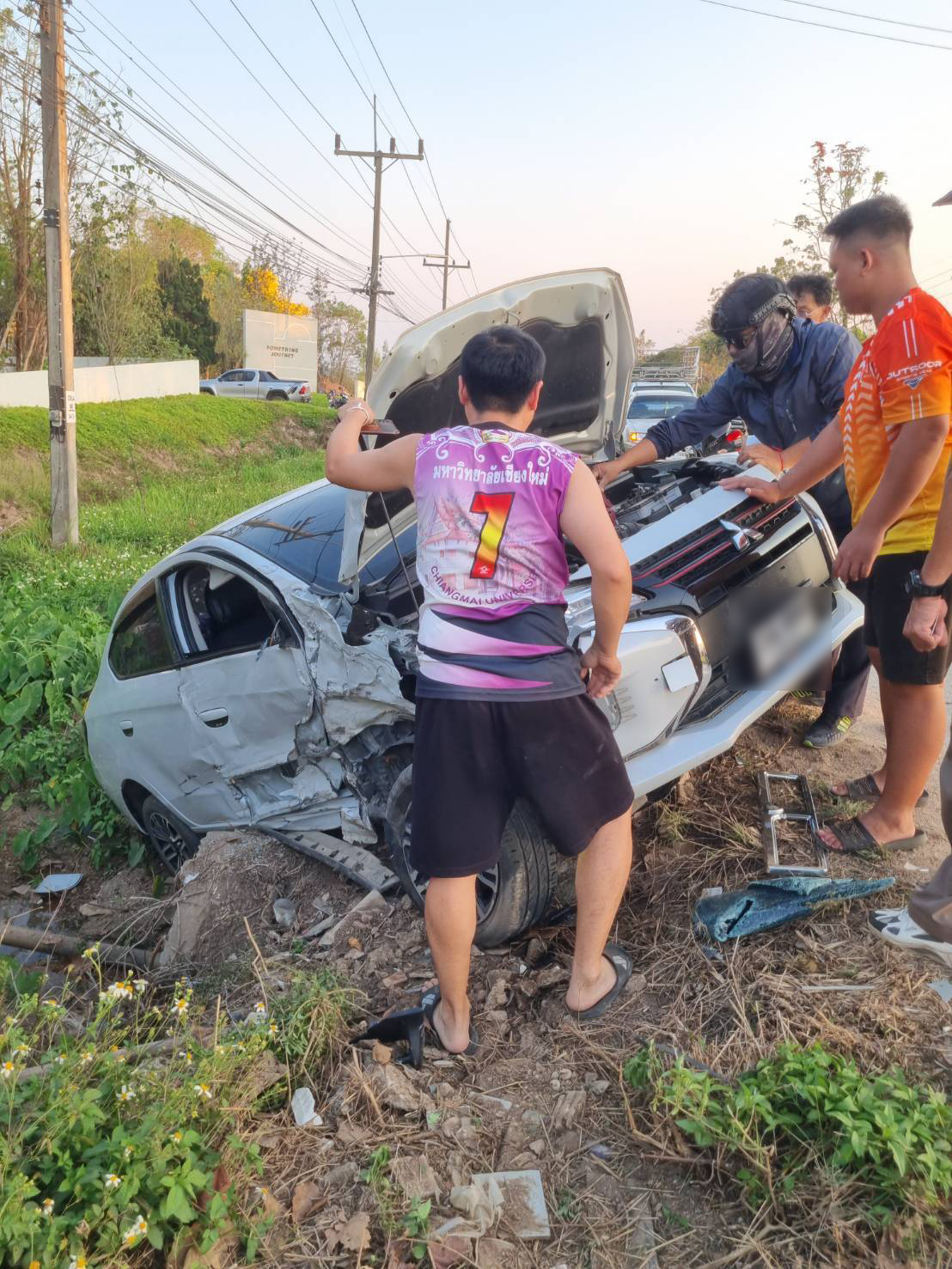 ที่เกิดเหตุอยู่บนถนนหมายเลข 1020 เชียงราย-เทิง ฝั่งขาเข้าตัวเมืองเชียงราย เมื่อไปถึงพบรถอยู่ในที่เกิดเหตุในสภาพพังเสียหาย จำนวน 4 คัน ประกอบด้วย รถยนต์เก๋งยี่หัอมิตซูบิชิ แอททราจ สีขาว ทะเบียนเชียงราย มีรอยถูกชนด้านหน้าฝั่งคนขับ ท้ายรถตกอยู่ในร่องข้างทาง ถัดไปพบรถยนต์ออฟโร้ดยี่ห้อซูซุกิ จิมนี่ สีเทา ทะเบียน เชียงราย สภาพมีรอยถูกชนด้านหน้าฝั่งคนขับ รถพลิกตะแคงอยู่ข้างถนน และไม่ห่างกันมากนัก พบรถยนต์กระบะยี่ห้อโตโยต้า วีโก้ สีบรอนซ์เงิน ใส่คอกด้านหลัง มีร่องรอยการชนบริเวณหน้ารถ และรถยนต์กระบะตู้ทึบยี่ห้อมิตซูบิชิ ไทรทัน สีขาว ทะเบียน เชียงราย จากการตรวจสอบพบผู้บาดเจ็บทั้งหมด 5 ราย เป็นหญิงอายุ 29 ปี ตั้งครรภ์ 2 เดือน มีอาการปวดหลัง ชายอายุ 30-35 ปี มีอาการปวดขาทั้ง 2 ข้าง หญิงอายุ 48 ปี มีอาการแน่นหน้าอก หญิงอายุ 30-40 ปี มีอาการวิงเวียนศรีษะและแน่นหน้าอก สมาคมกู้ชีพธรรมนันท์เชียงรายพาส่ง รพ.เชียงรายประชานุเคราะห์ และชายอายุ 66 ปี มีอาการแน่นหน้าอกและปวดท้ายทอย กู้ภัยมูลนิธิแสงธรรมสาธารณกุศลเชียงรายนำส่ง รพ.เกษมราษฎร์ศรีบุรินทร์