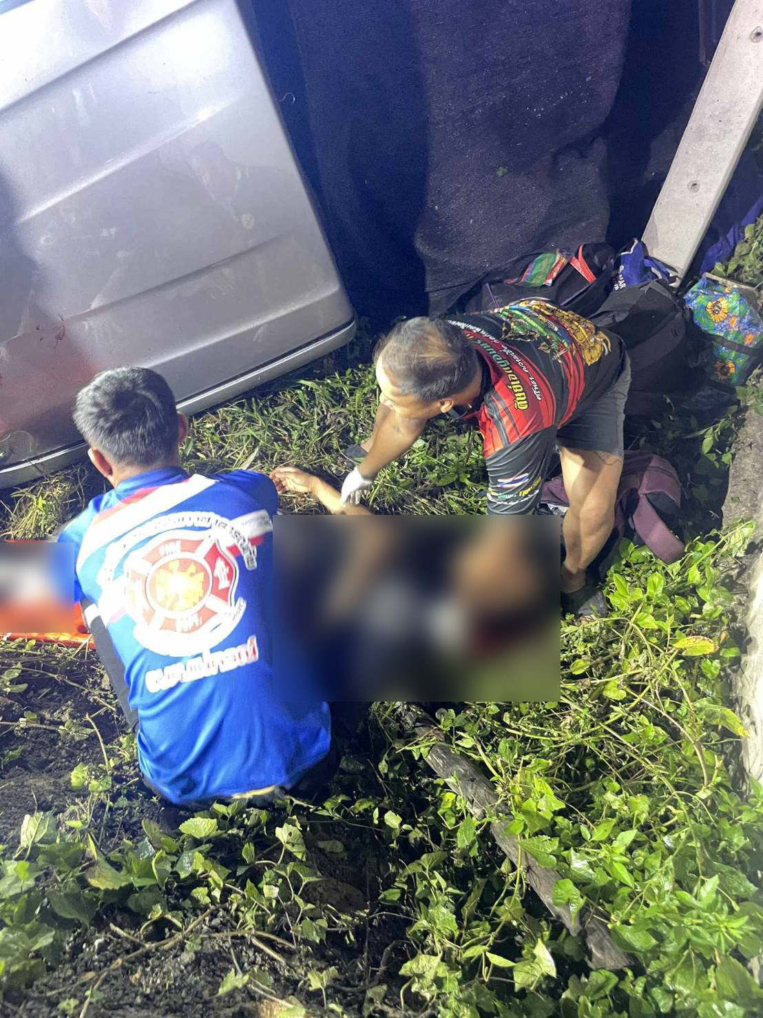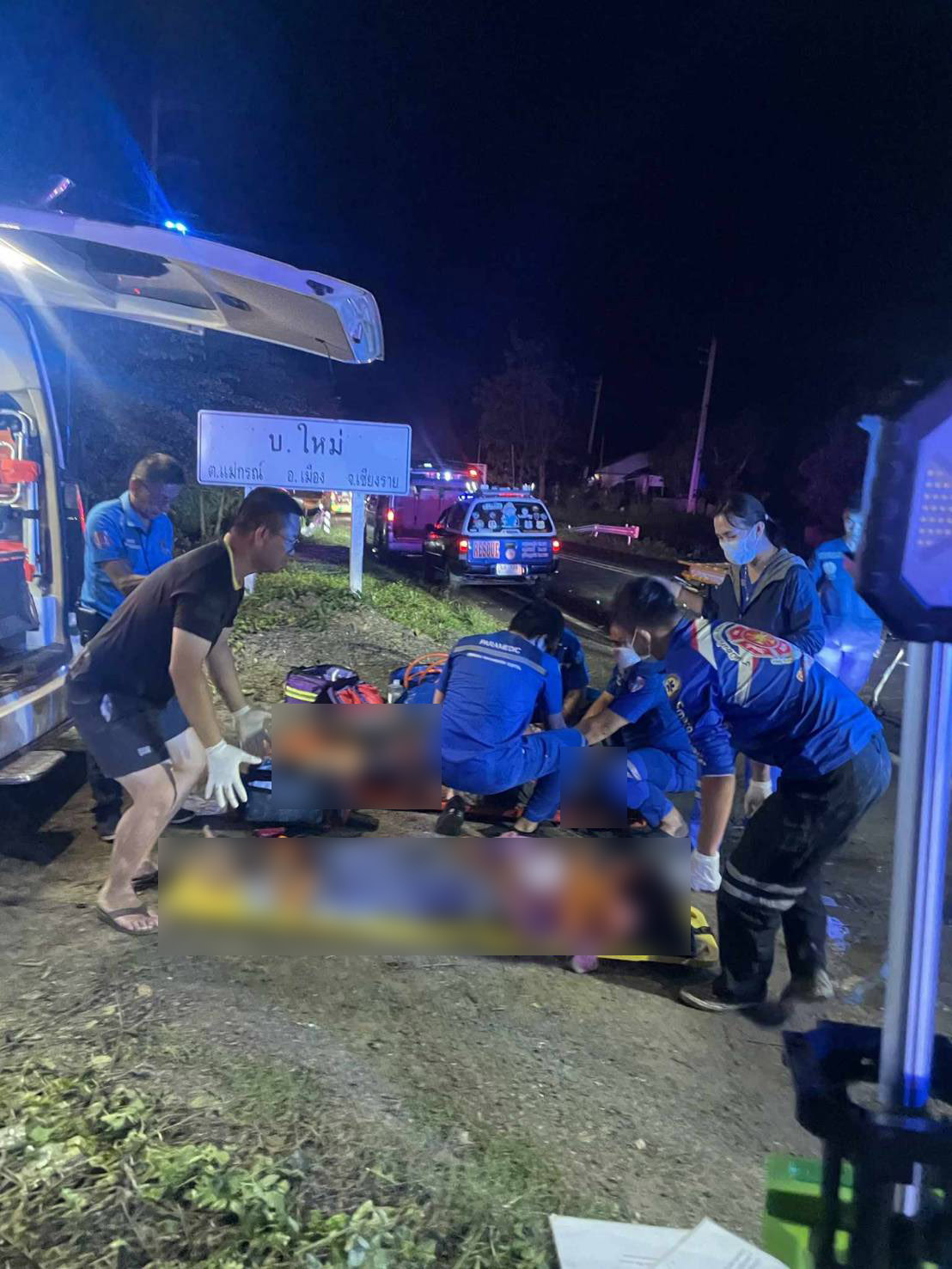 ที่เกิดเหตุพบรถยนต์กระบะยี่ห้อโตโยต้า รีโว่ สีเทา ไม่ติดแผ่นป้ายทะเบียน สภาพพังเสียหายรอบคัน พลิกตะแคงข้างอยู่ในร่องข้างทาง จากการตรวจสอบมีผู้ได้รับาทราบว่าคนขับขนชาวเมียนมามาเต็มคันรถ โดยมุ่งหน้าไปทางจังหวัดเชียงใหม่ เมื่อถึงจุดเกิดเหตุได้เสียหลักตกข้างทางและพลิกคว่ำ อาสากู้ภัยหลังรับแจ้งจึงรถตรวจสอบพบว่าผู้ขับขี่และผู้โดยสารในรถทั้งหมดเป็นชาวเมียนมา รวม 9 คน มีผู้ได้รับบาดเจ็บ 8 ราย และเสียชีวิตในที่เกิดเหตุ 1 ราย ในเบื้องต้นเจ้าหน้าที่ยังไม่มีข้อมูลของผู้ขับขี่และโดยสารทั้งหมด กู้ภัยจึงได้ช่วยเหลือนำส่งผู้เสียชีวิตและบาดเจ็บทั้งหมดไปที่ รพ.เชียงรายประชานุเคราะห์