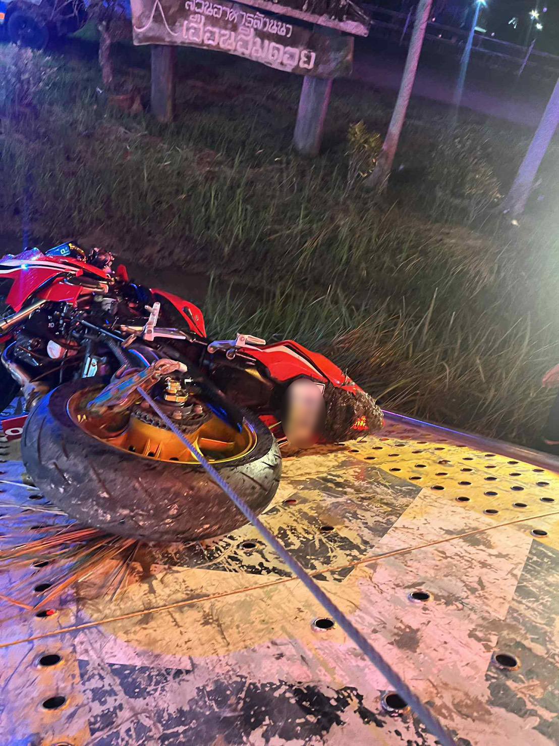 ในที่เกิดเหตุ พบรถจักรยานยนต์บิ๊กไบค์ยี่ห้อฮอนด้า สีแดง ไม่ติดแผ่นป้ายทะเบียน สภาพพังยับเยิน ที่ไฟเลี้ยวของรถยังกระพริบอยู่แต่ว่าเครื่องยนต์ดับไปแล้ว พบร่างคนขับเป็นชายสวมเสื้อแขนสั้นและกางเกงขาสั้นสีฟ้า ตรวจเอกสารประจำตัวชายคนขับทราบว่าอายุ 32 ปี ภูมิลำเนาอยู่ ต.เกาะช้าง อ.แม่สาย จ.เชียงราย