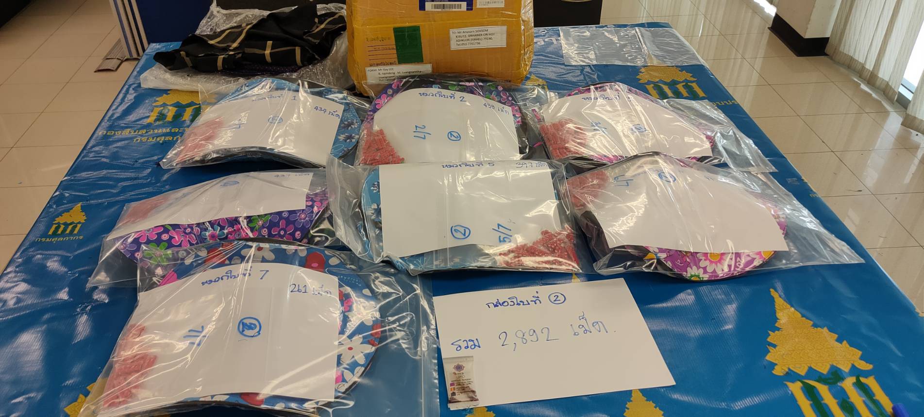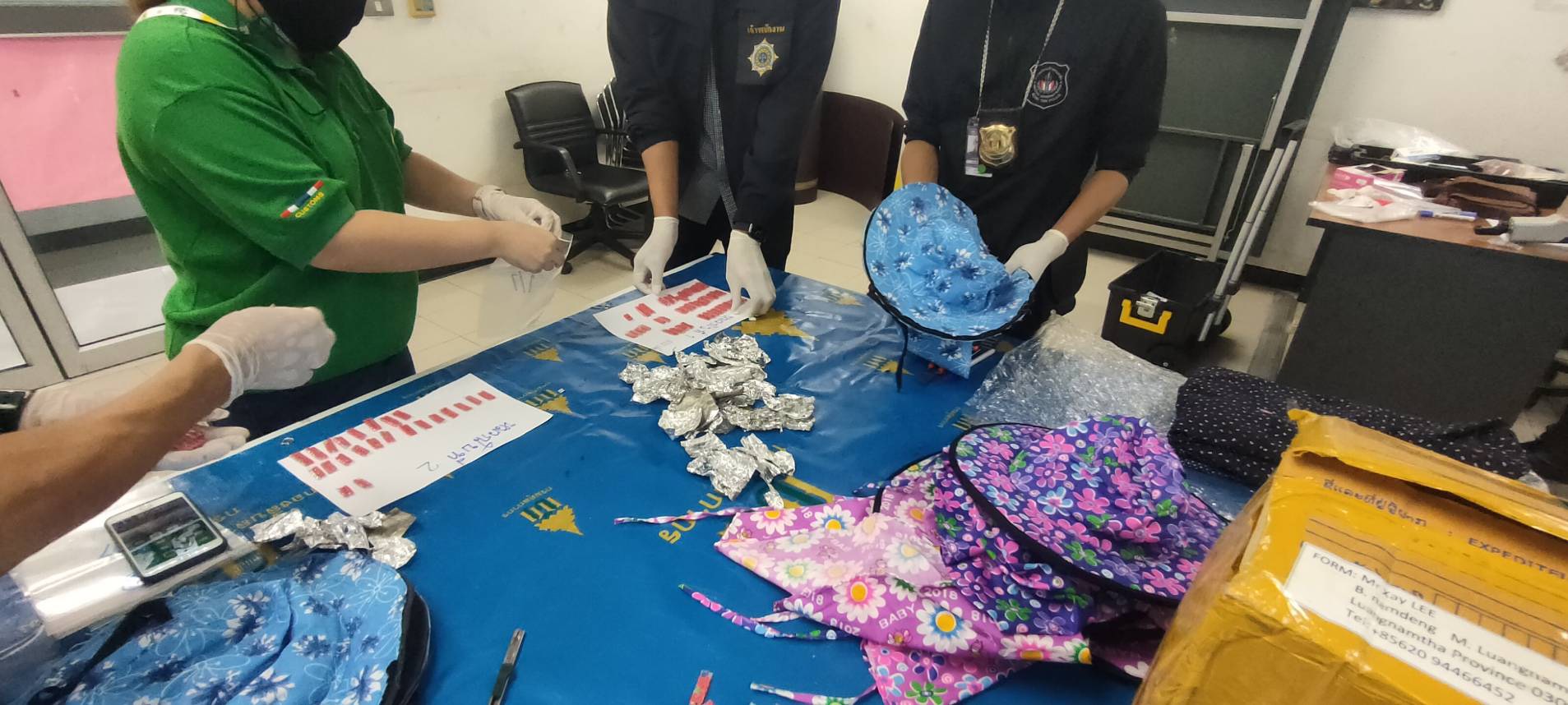 โดยเมื่อวันที่ 21 กรกฎาคม 2564 หน่วยสกัดกั้นยาเสพติดท่าอากาศยาน หรือ Airport Interdictoin Task Force (AITF) ประกอบด้วย สำนักงาน ป.ป.ส. ศุลกากร บช.ปส. และ ศรภ. ตรวจยึดยาบ้า จำนวน 6,040 เม็ด ซุกซ่อนหมวกกันแดดแบบคลุมหน้า อยู่ในกล่องพัสดุไปรษณีย์ จำนวน 2 กล่อง ระบุชื่อผู้ส่งเดียวกัน ส่งมาจากต้นทาง สปป.ลาว จะส่งไปปลายทาง ประเทศอิสราเอล ระบุชื่อผู้รับเป็นชาวไทย ณ ศูนย์ไปรษณีย์ขาออก สุวรรณภูมิ จ.สมุทรปราการ