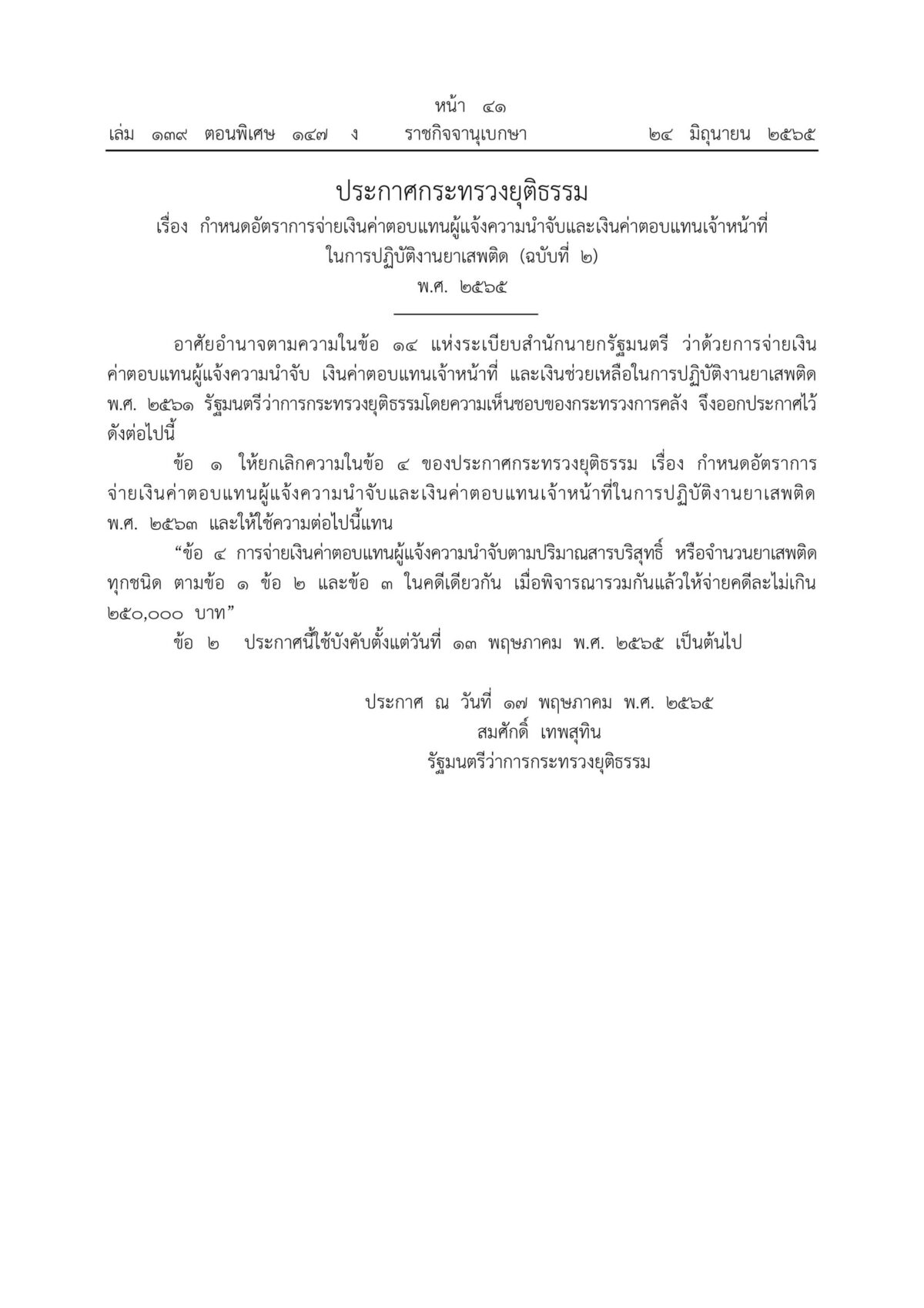 24 มิ.ย. 65 เว็บไซต์ราชกิจจานุเบกษา เผยแพร่ ประกาศกระทรวงยุติธรรม เรื่อง กำหนดอัตราการจ่ายเงินค่าตอบแทนผู้แจ้งความนำจับและเงินค่าตอบแทนเจ้าหน้าที่ในการปฏิบัติงานยาเสพติด (ฉบับที่ 2) พ.ศ.2565 ลงนามโดย นายสมศักดิ์ เทพสุทิน รัฐมนตรีว่าการกระทรวงยุติธรรม ระบุ