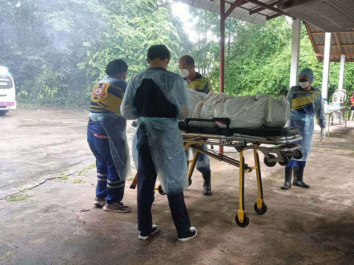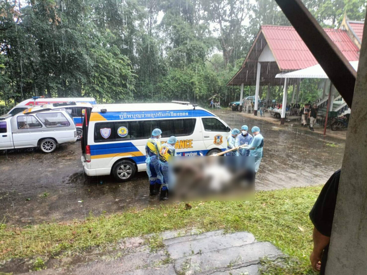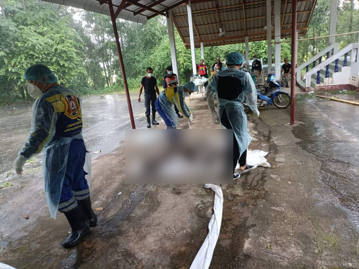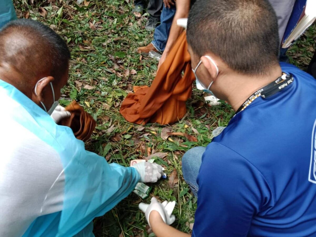 ที่เกิดเหตุเป็นป่าสุสานที่ใช้ร่วมกันหลายหมู่บ้าน ที่ด้านหลังอาคารที่ใช้สำหรับเป็นที่เก็บของ พบศพเป็นชายไม่สวมเสื้อผ้า ร่างกายบวมอืด มีหนอนไต่ตามตัวศพ ส่งกลิ่นเหม็น มีเชือกไนล่อนมัดคอ และมีเก้าอี้พลาสติกสีแดงที่ช้อนกันหลายชั้นล้มอยู่ติดกับศพ จากการตรวจสอบเบืัองต้นคาดว่าเสียชีวิตมาแล้วไม่ต่ำกว่า 5-6 วัน และที่ในห้องเก็บของมีจีวรและย่ามซึ่งคาดว่าจะเป็นของผู้เสียชีวิตวางไว้อยู่ เมื่อตรวจสอบข้างในย่ามมีเงินอยู่ในจำนวนหนึ่ง แต่ไม่พบใบสุทธิหรือเอกสารทางราชการในย่ามดังกล่าว จึงยังไม่สามารถระบุตัวผู้เสียชีวิตได้ กู้ภัยช่วยห่อศพและนำร่างผู้เสียชีวิตส่งนิติเวช รพ.เชียงรายประชานุเคราะห์ เพื่อชันสูตรหาสาเหตุการเสียชีวิตที่แน่ชัด และติดตามหาญาติมารับศพไปประกอบพิธีทางศาสนา